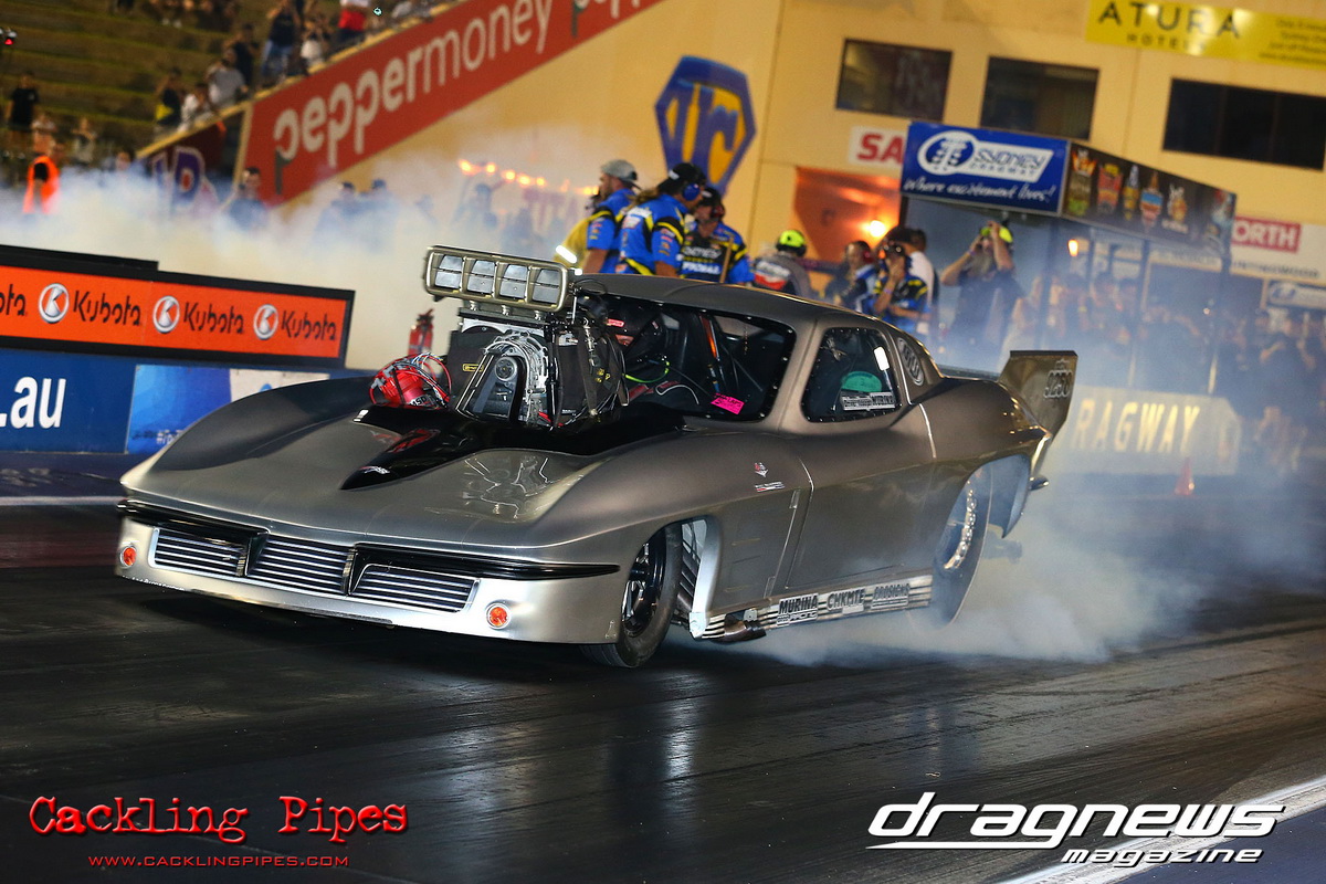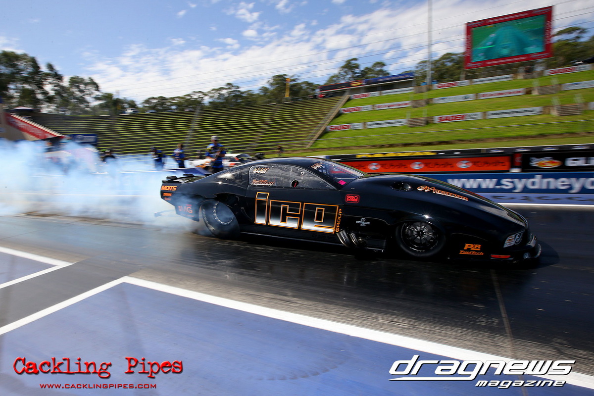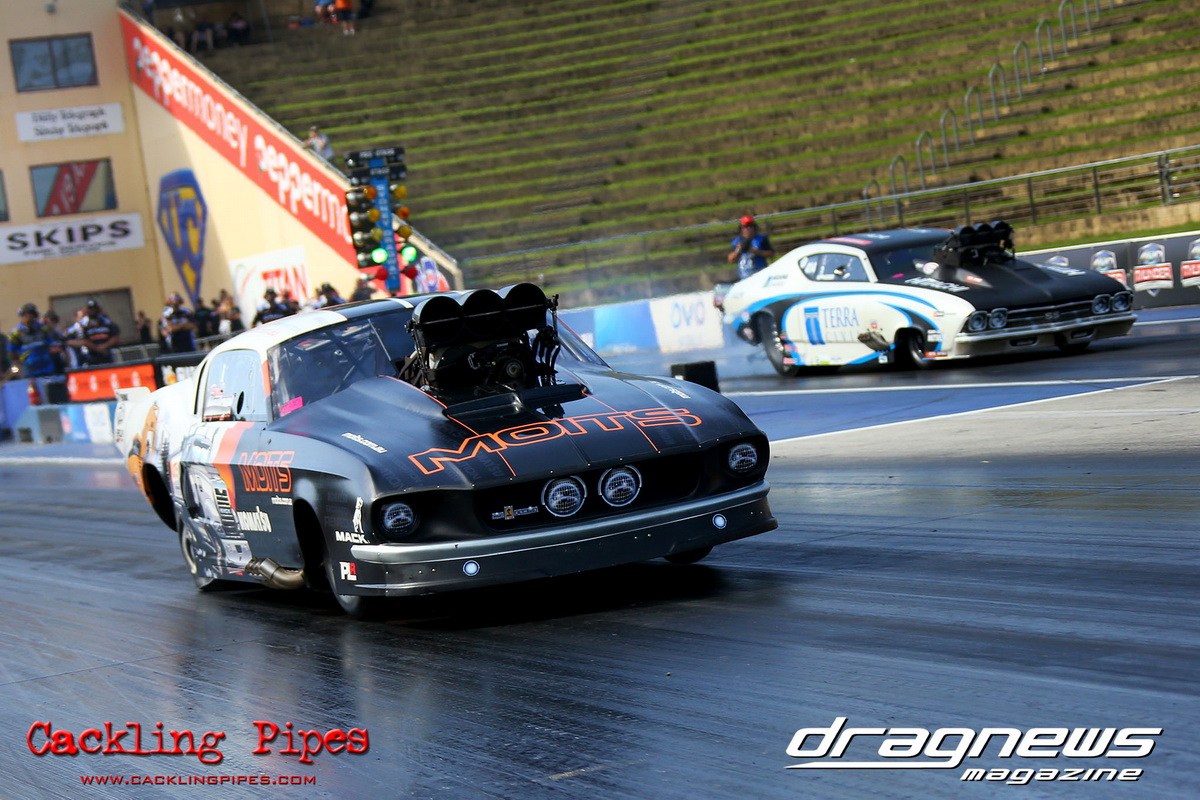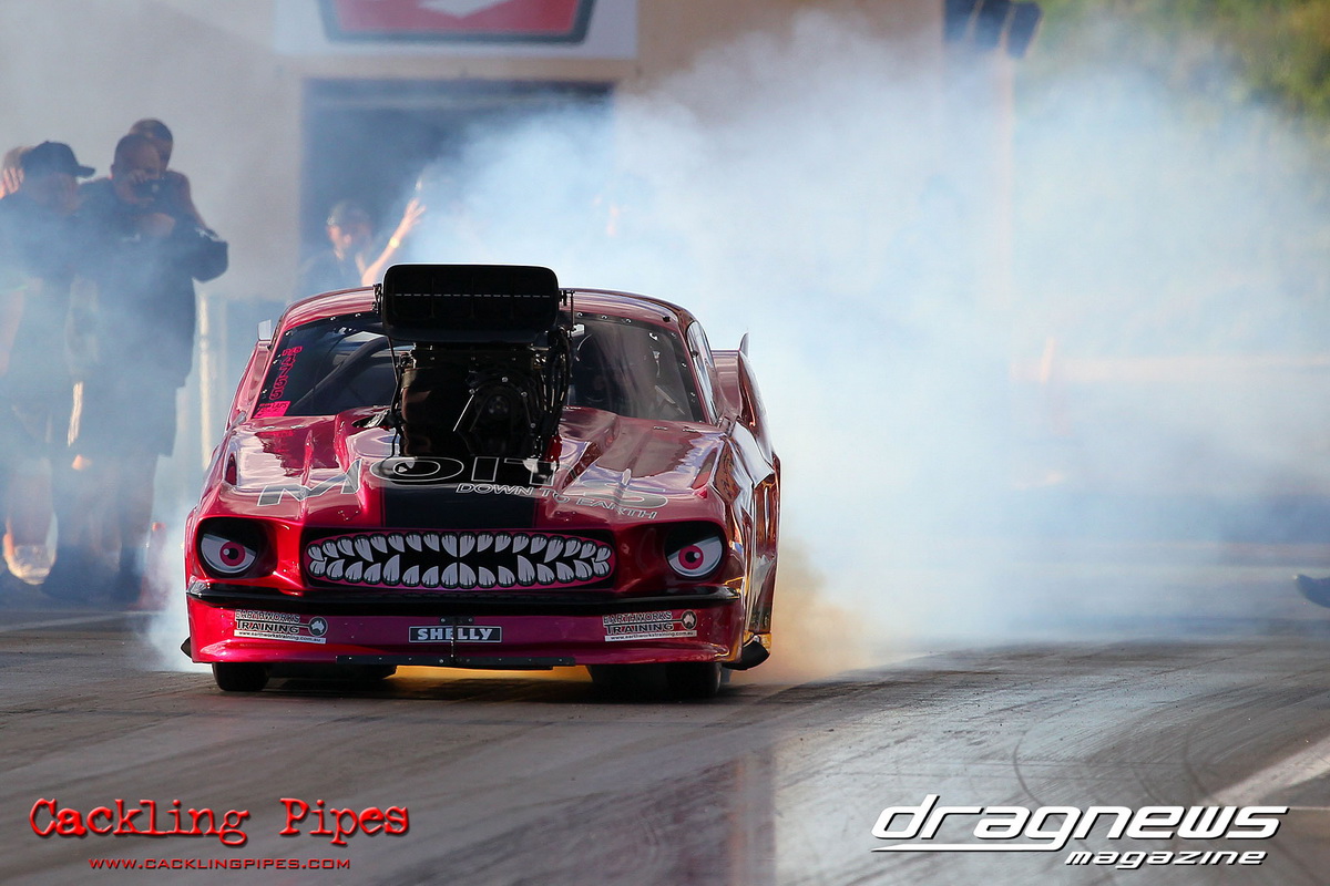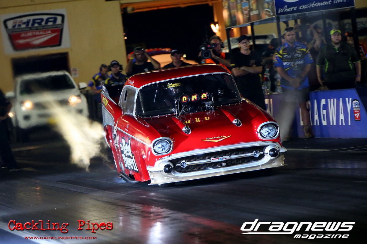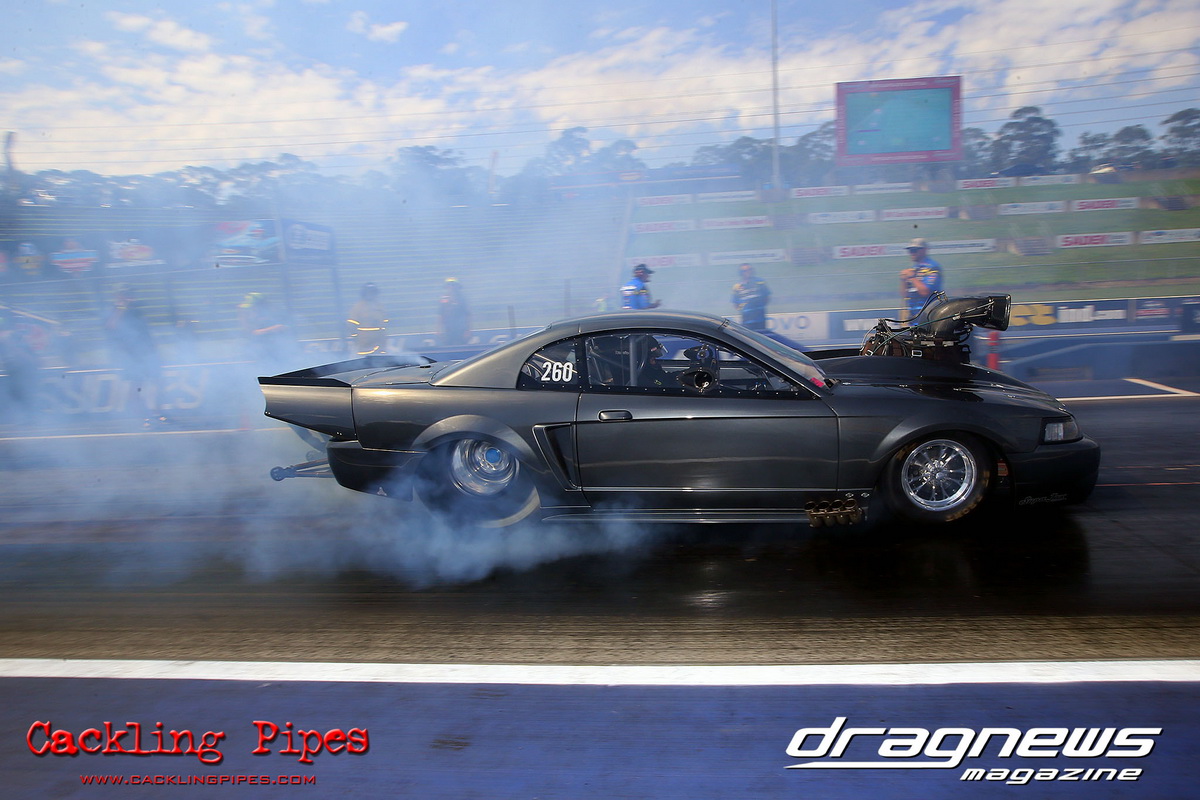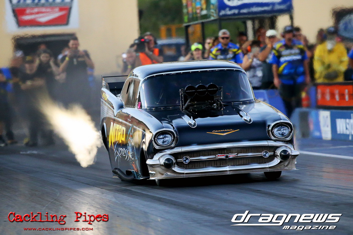 Tyre shake dogged Plumpton, going down to Davies’ 5.95 in a classic Pro Mod match up. Tsakiridis again hit 271mph backed by a 5.75 ET to defeat Michael Haimandos’s twin turbo small block Mustang’s 6.47. George Rehayem notched a win against Joseph Murina’s blown Corvette with a 6.44. Spinozzi and Brett Gillespie in the revamped ’34 Chev had singles.