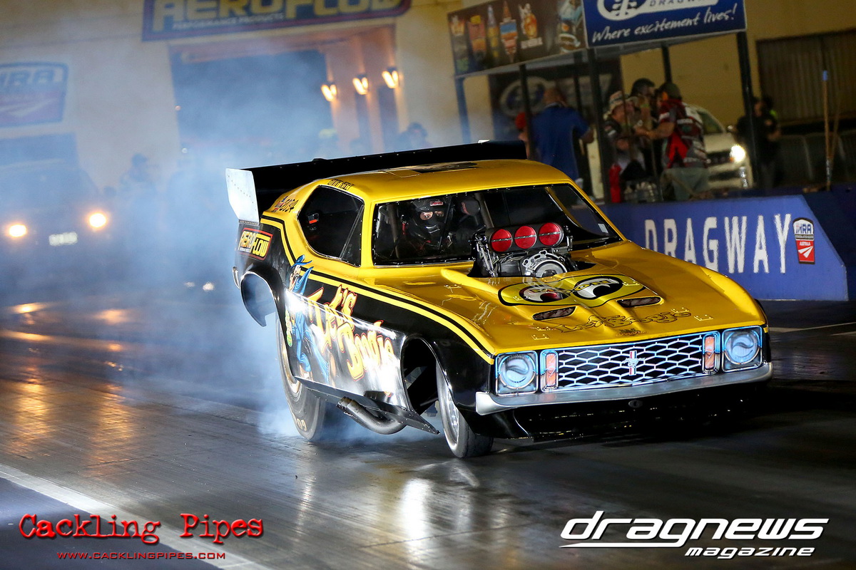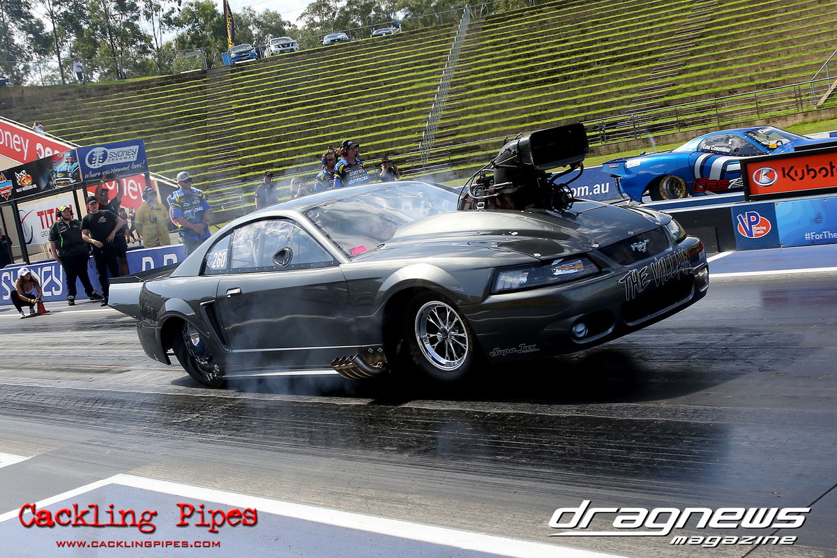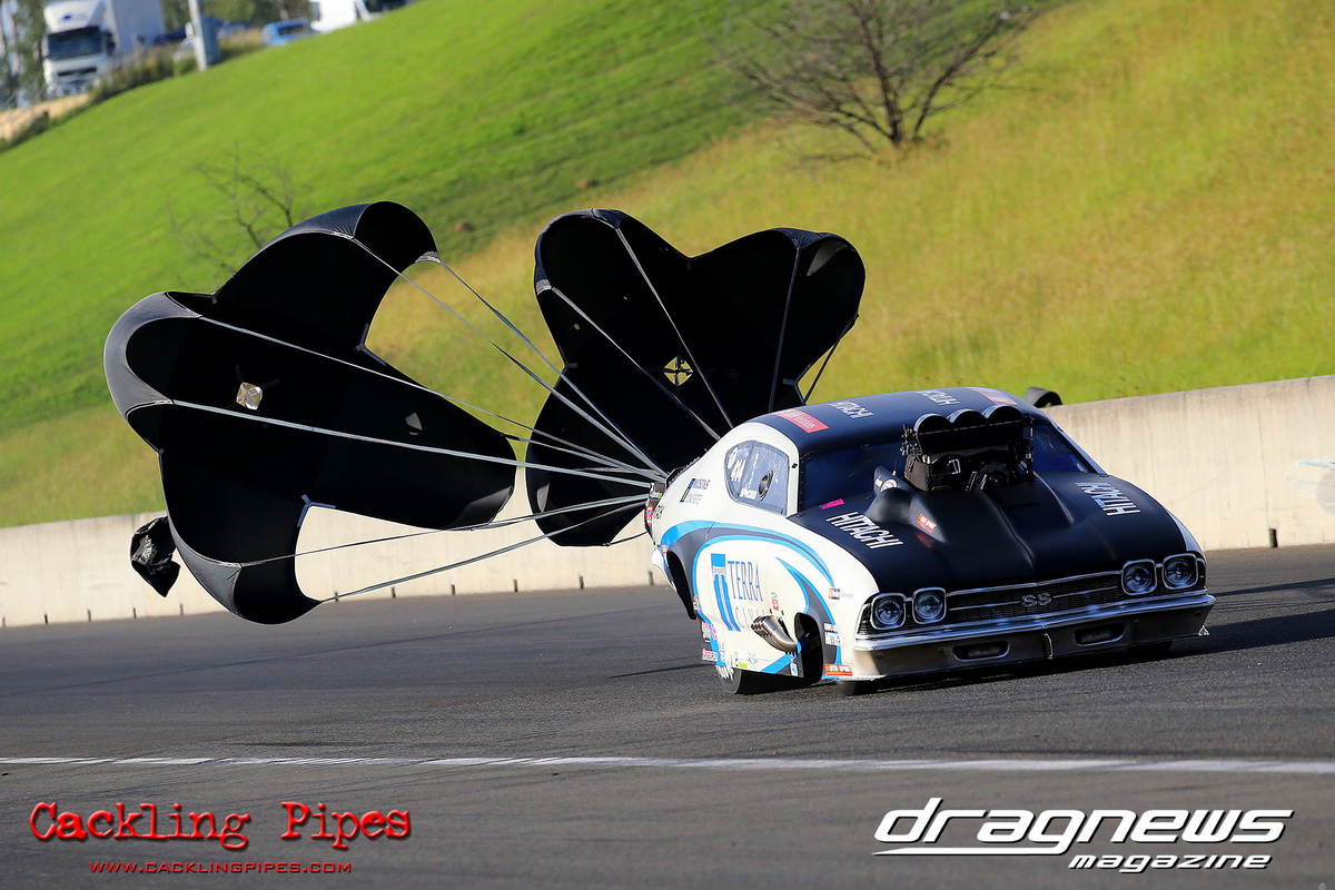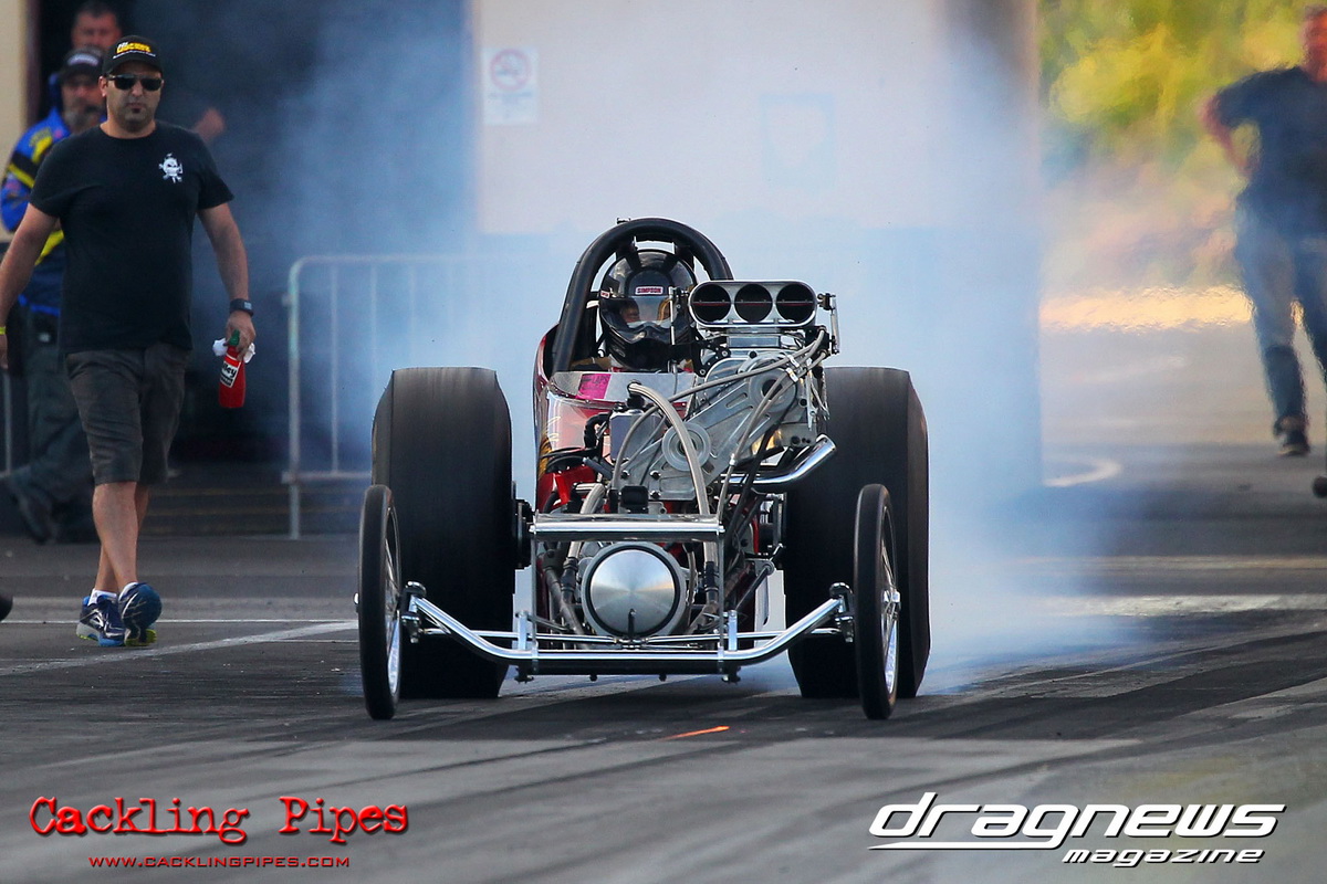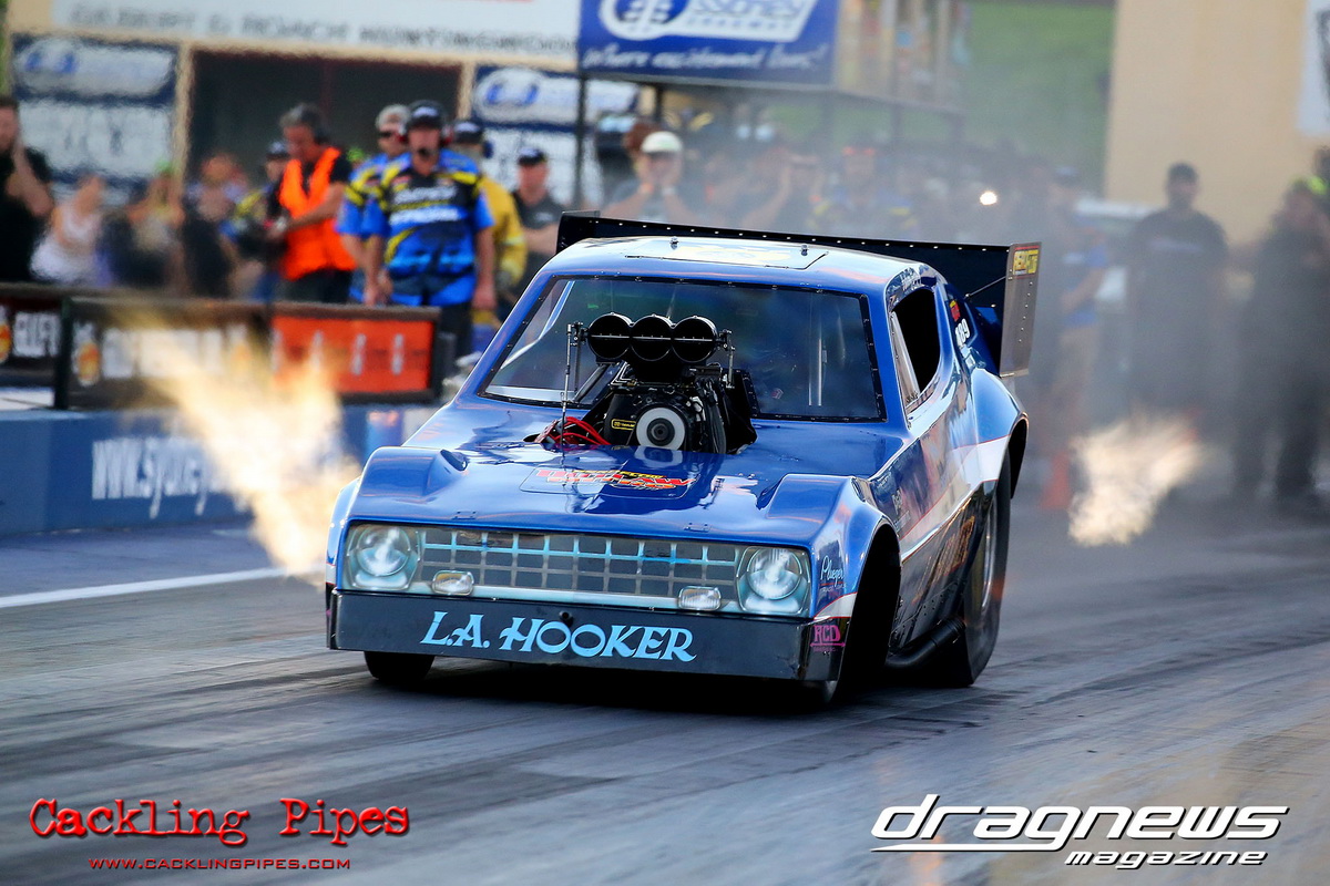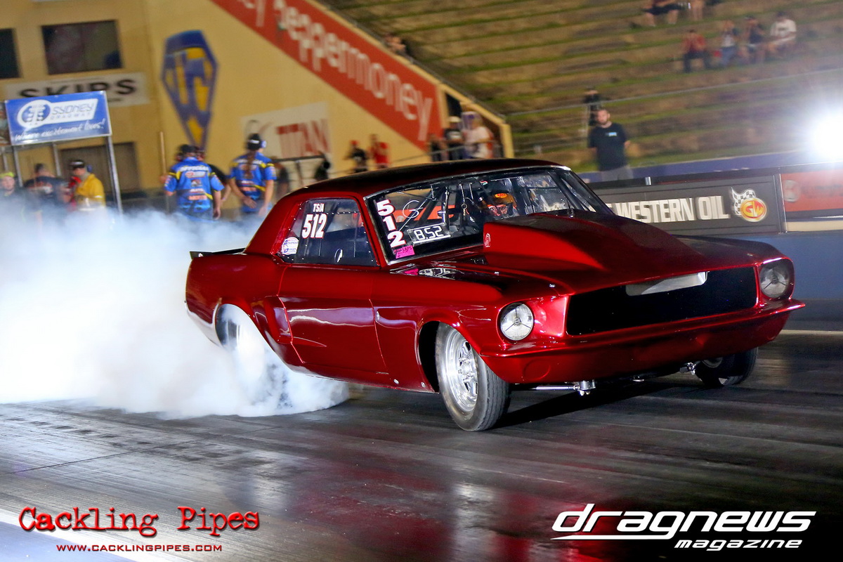 Tyre shake dogged Plumpton, going down to Davies’ 5.95 in a classic Pro Mod match up. Tsakiridis again hit 271mph backed by a 5.75 ET to defeat Michael Haimandos’s twin turbo small block Mustang’s 6.47. George Rehayem notched a win against Joseph Murina’s blown Corvette with a 6.44. Spinozzi and Brett Gillespie in the revamped ’34 Chev had singles.