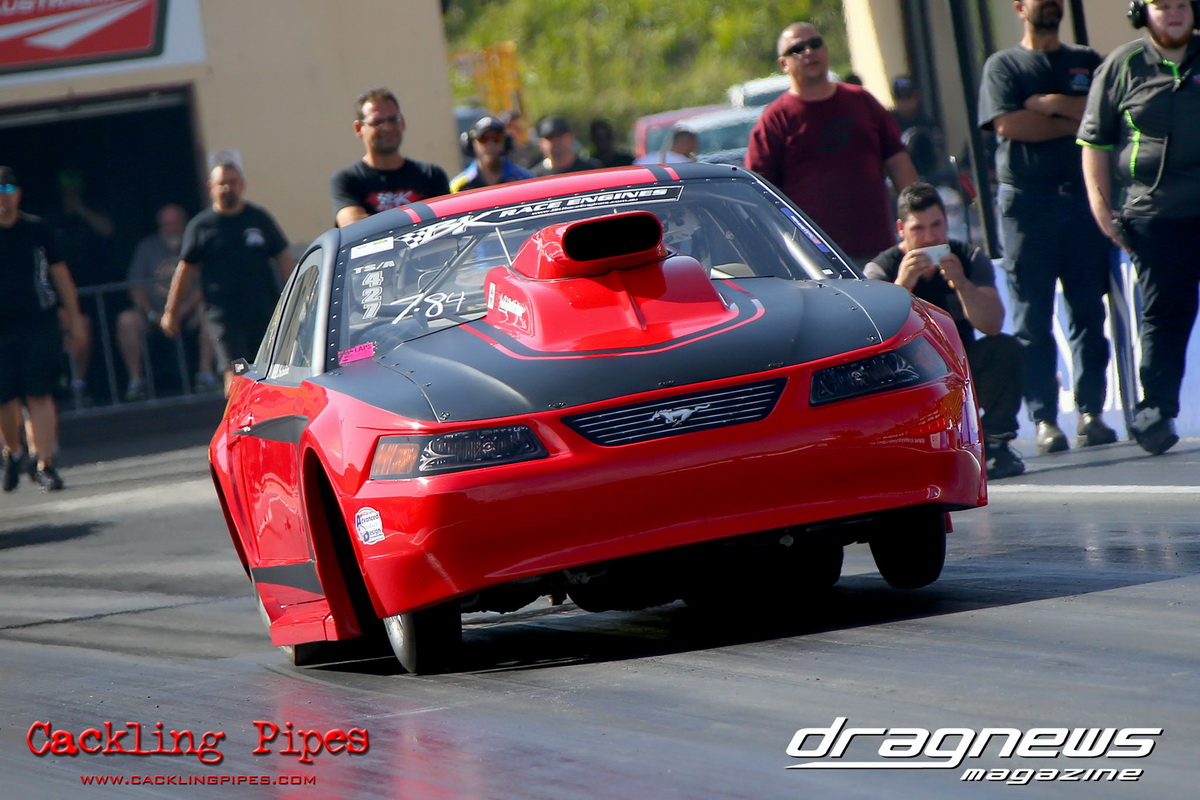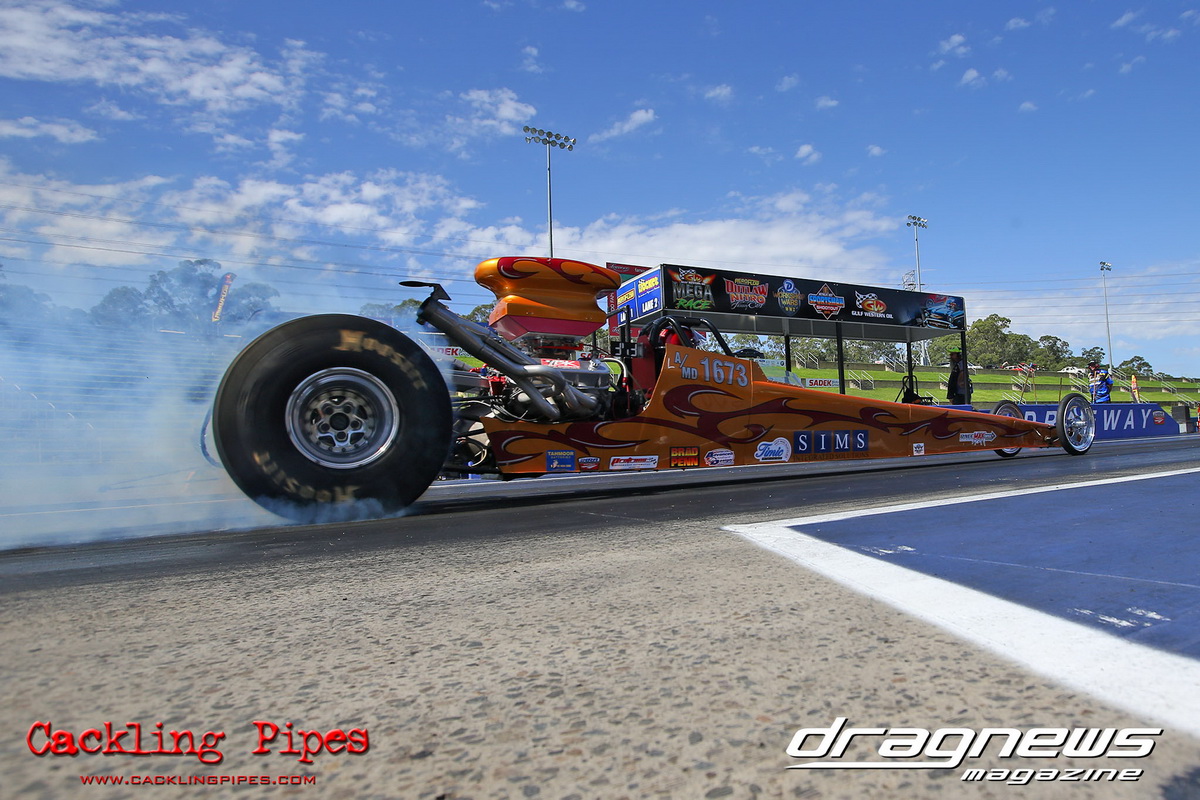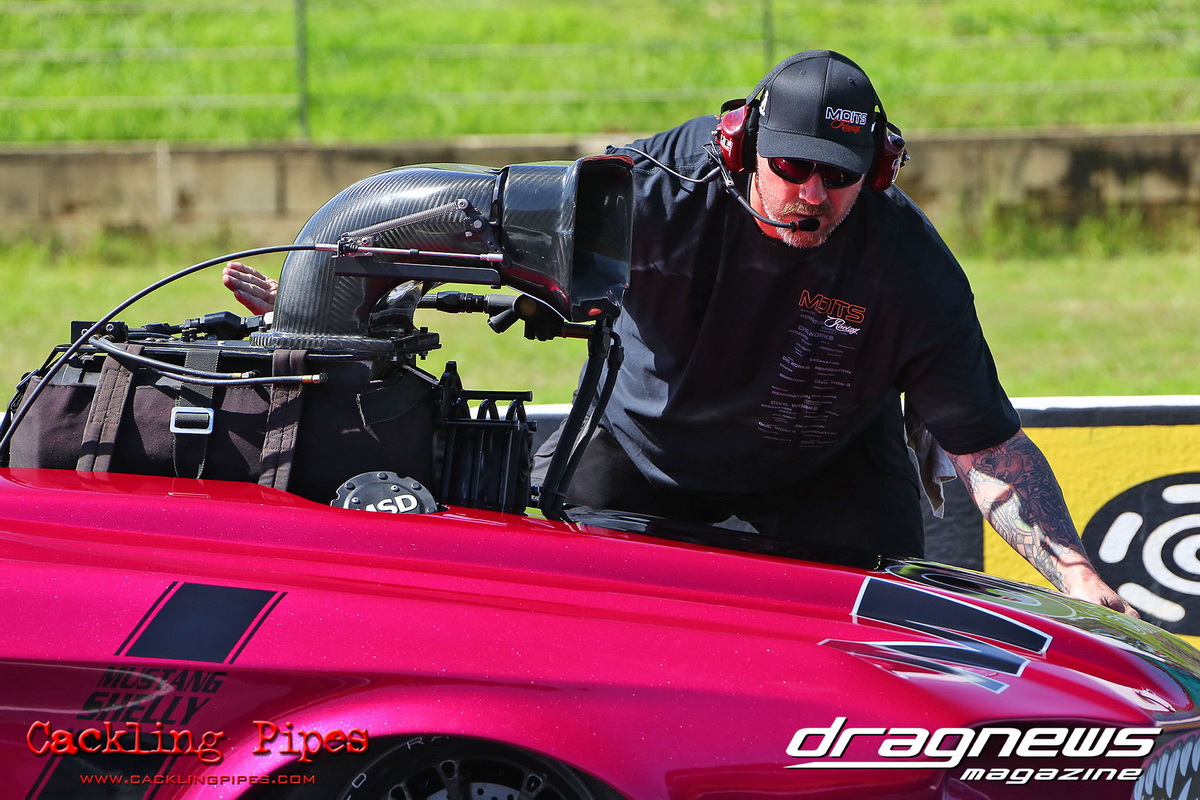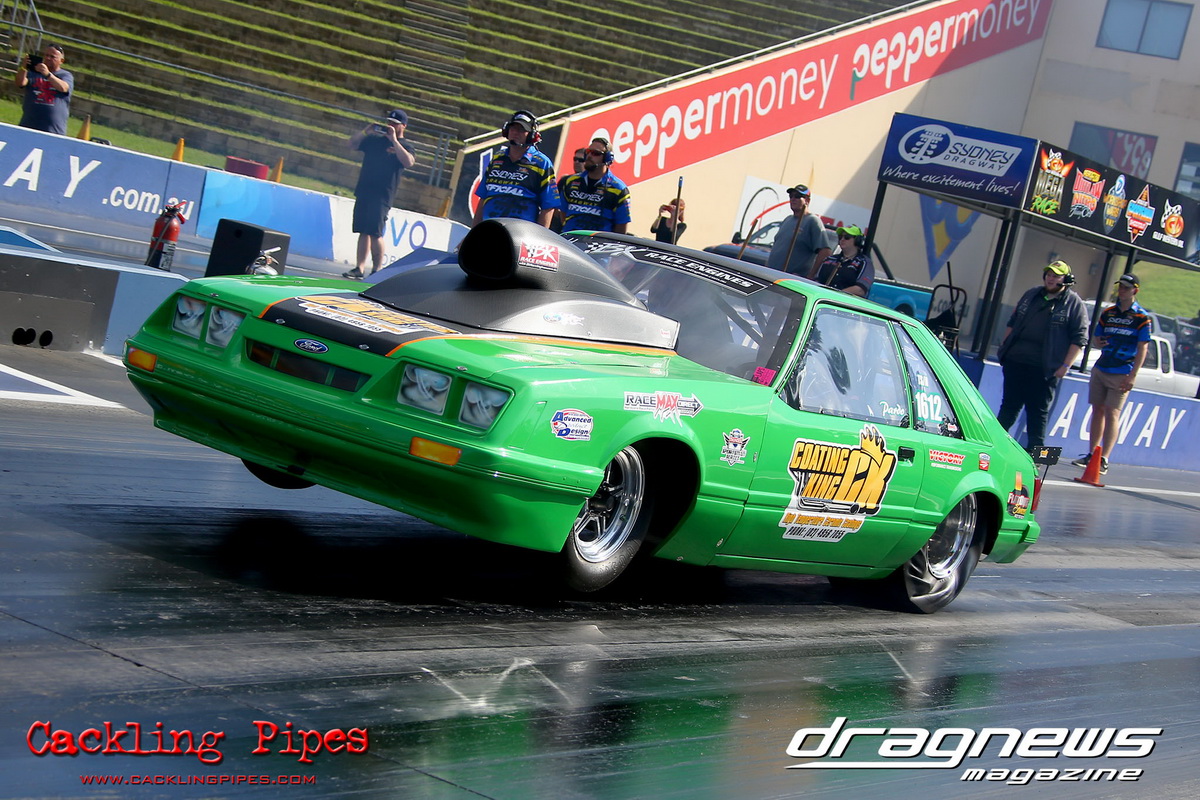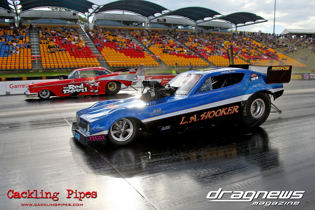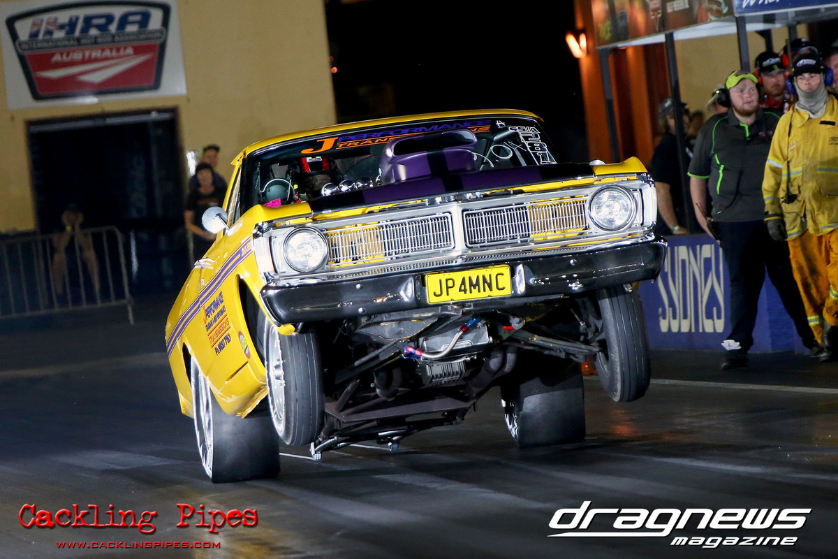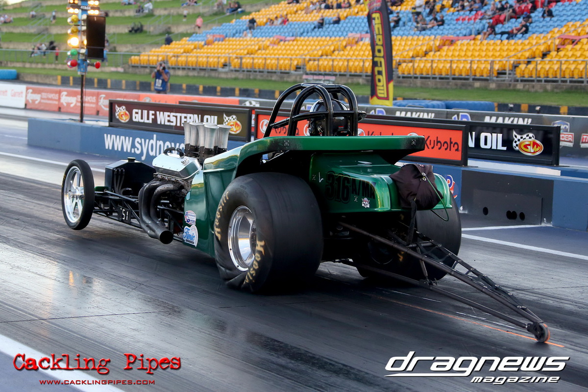 Tyre shake dogged Plumpton, going down to Davies’ 5.95 in a classic Pro Mod match up. Tsakiridis again hit 271mph backed by a 5.75 ET to defeat Michael Haimandos’s twin turbo small block Mustang’s 6.47. George Rehayem notched a win against Joseph Murina’s blown Corvette with a 6.44. Spinozzi and Brett Gillespie in the revamped ’34 Chev had singles.