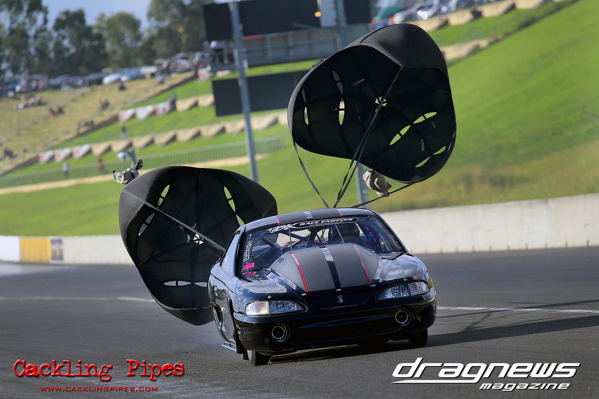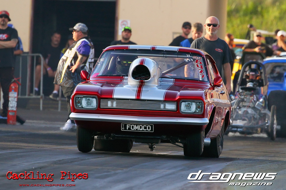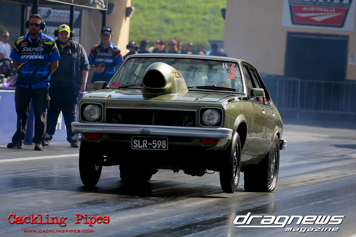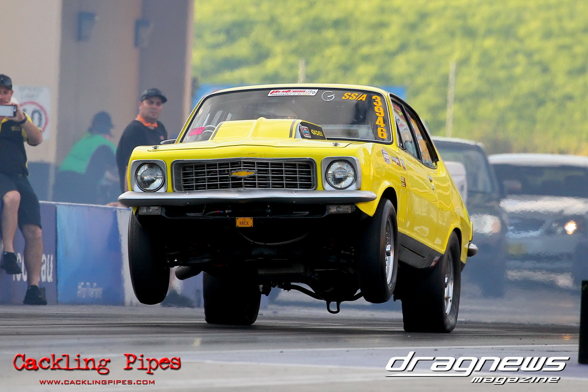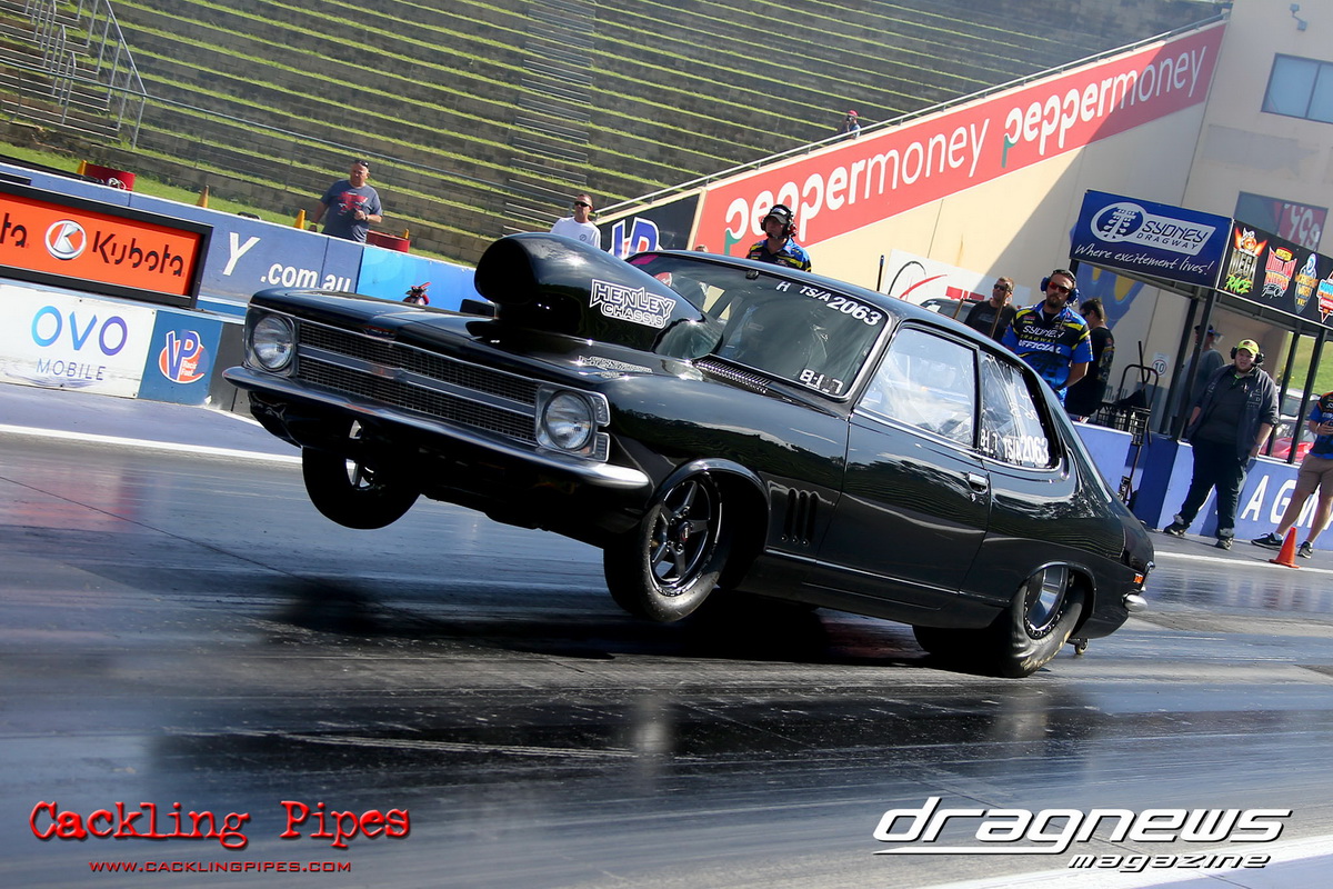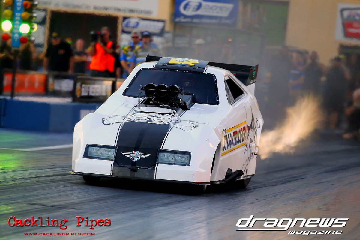 Tyre shake dogged Plumpton, going down to Davies’ 5.95 in a classic Pro Mod match up. Tsakiridis again hit 271mph backed by a 5.75 ET to defeat Michael Haimandos’s twin turbo small block Mustang’s 6.47. George Rehayem notched a win against Joseph Murina’s blown Corvette with a 6.44. Spinozzi and Brett Gillespie in the revamped ’34 Chev had singles.
