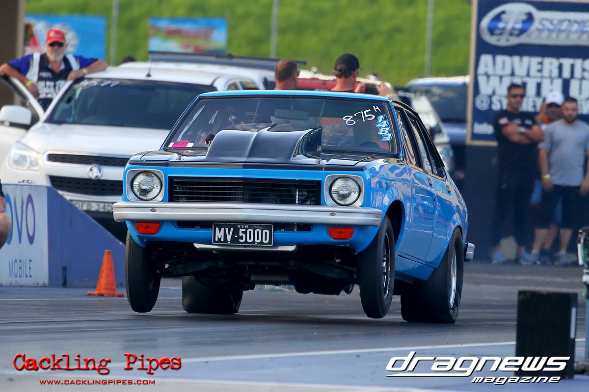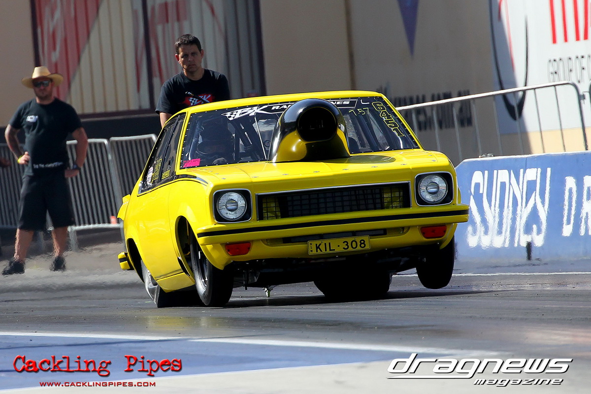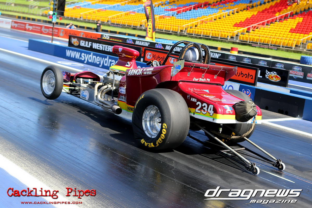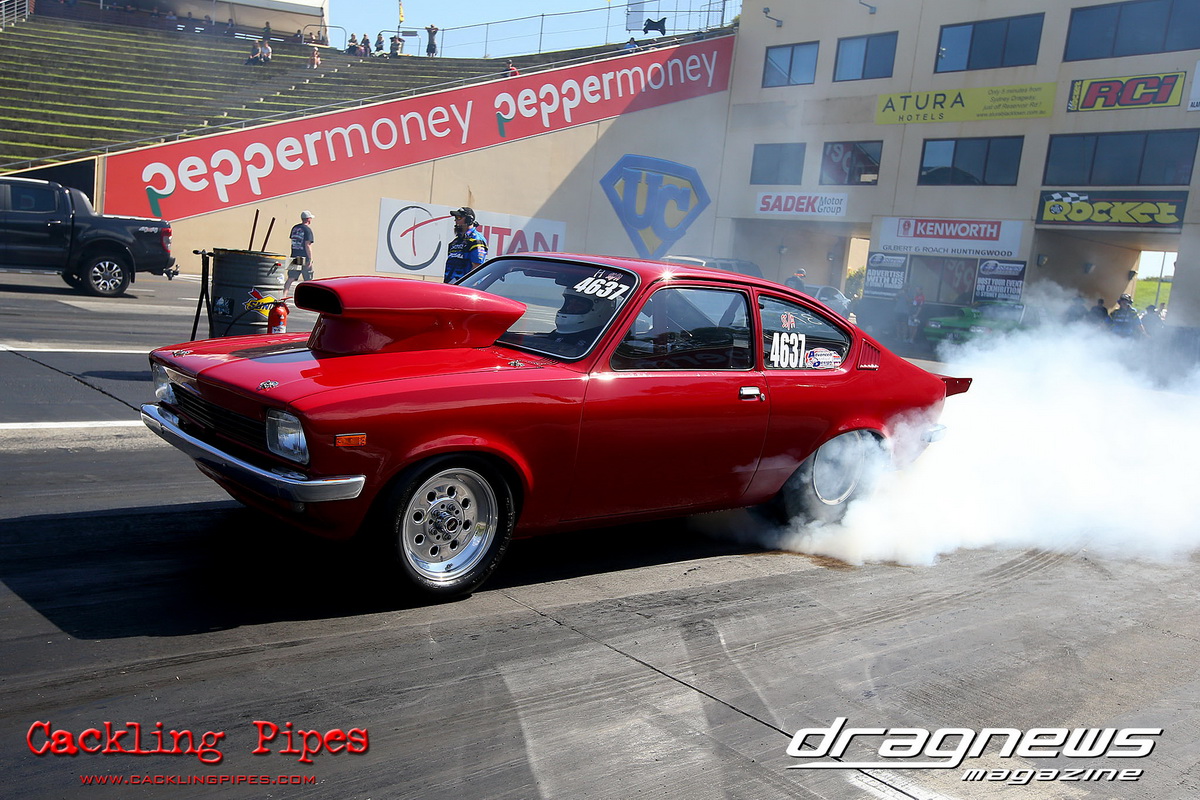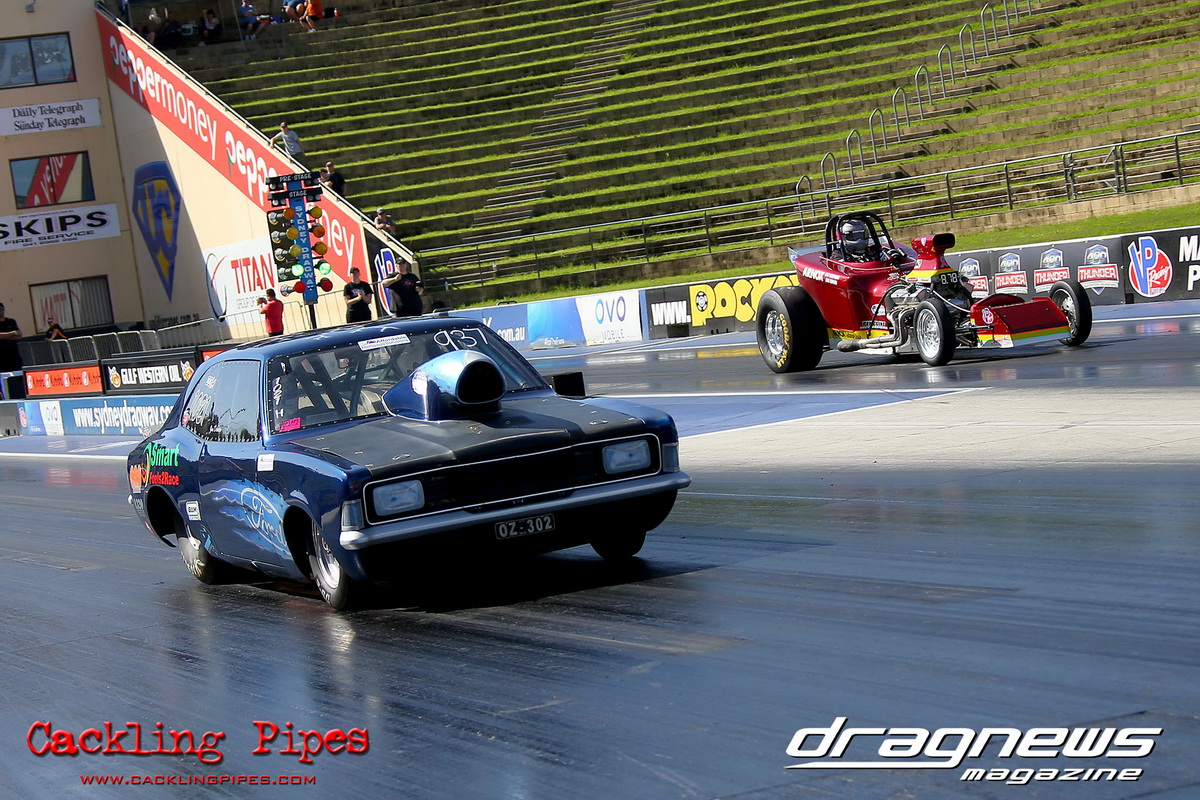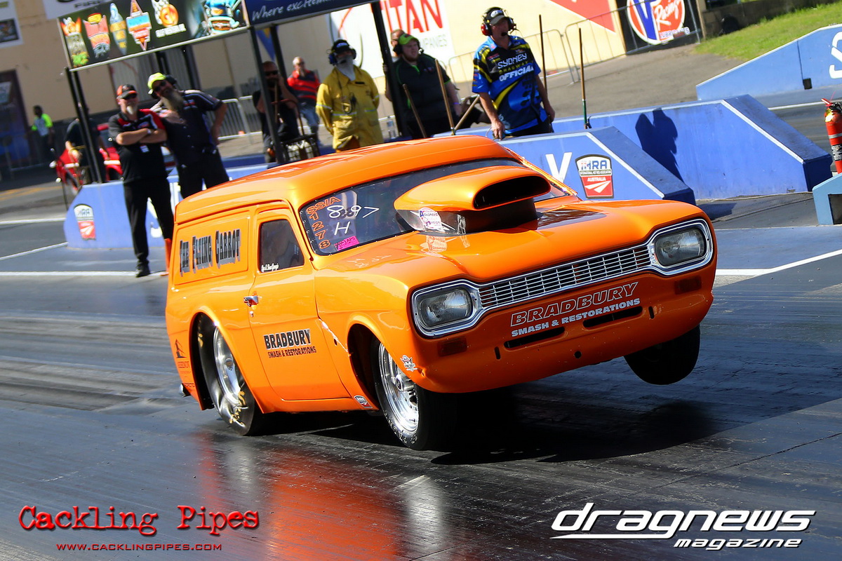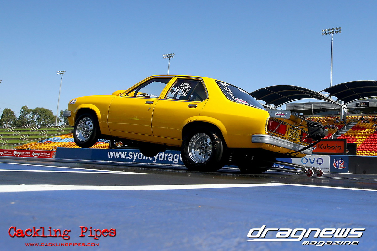 Tyre shake dogged Plumpton, going down to Davies’ 5.95 in a classic Pro Mod match up. Tsakiridis again hit 271mph backed by a 5.75 ET to defeat Michael Haimandos’s twin turbo small block Mustang’s 6.47. George Rehayem notched a win against Joseph Murina’s blown Corvette with a 6.44. Spinozzi and Brett Gillespie in the revamped ’34 Chev had singles.