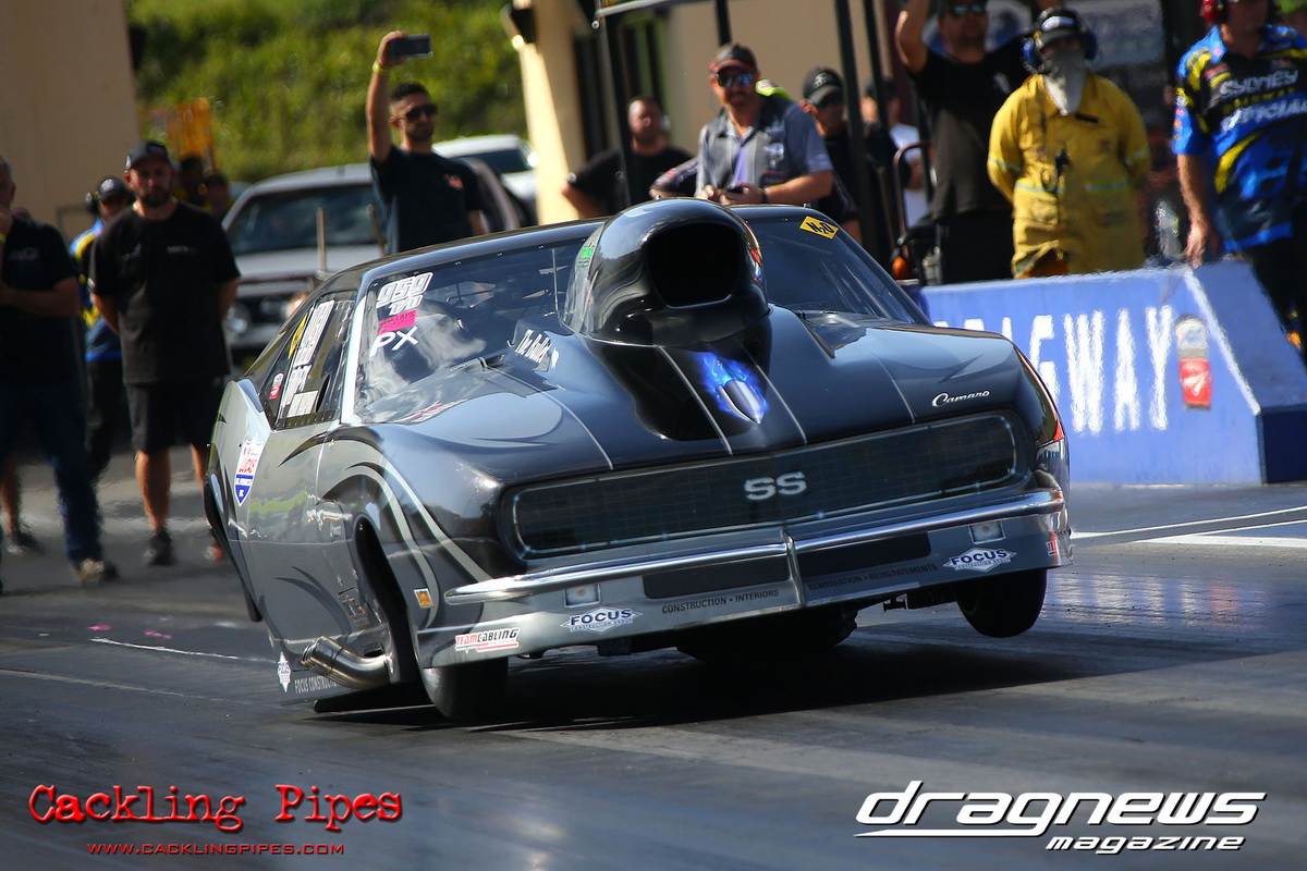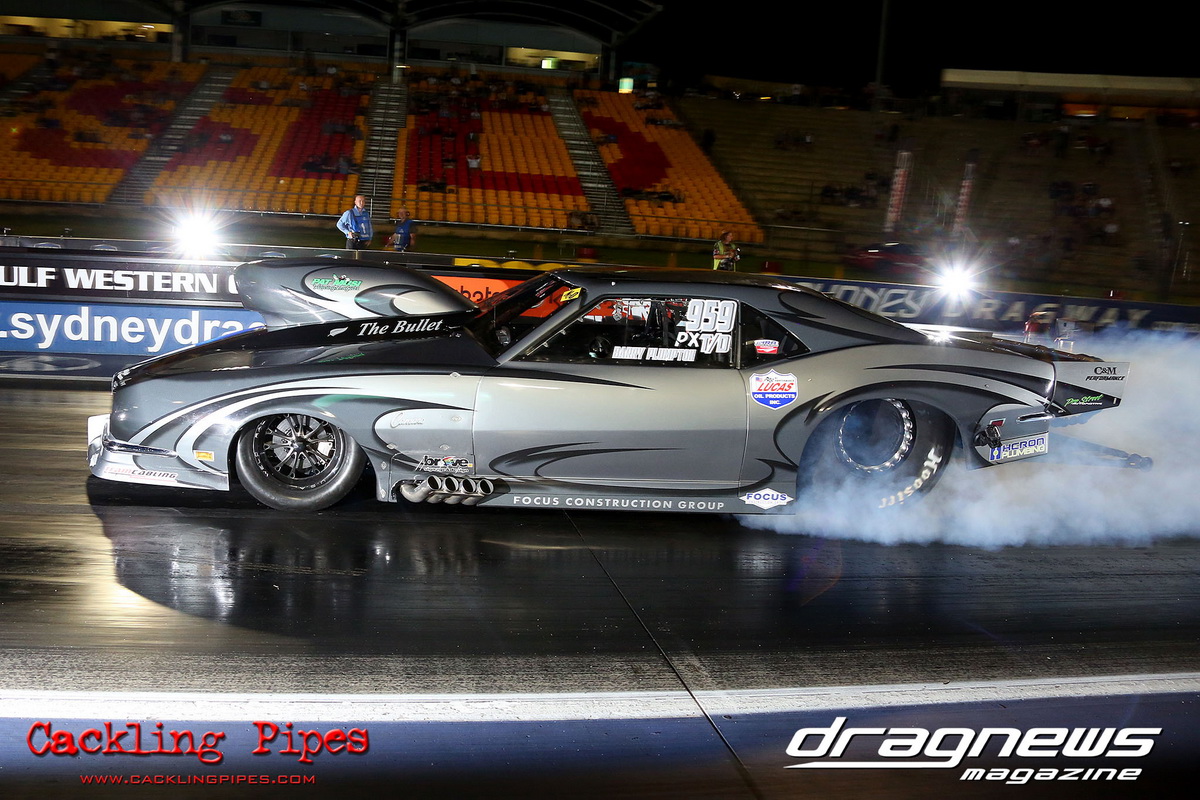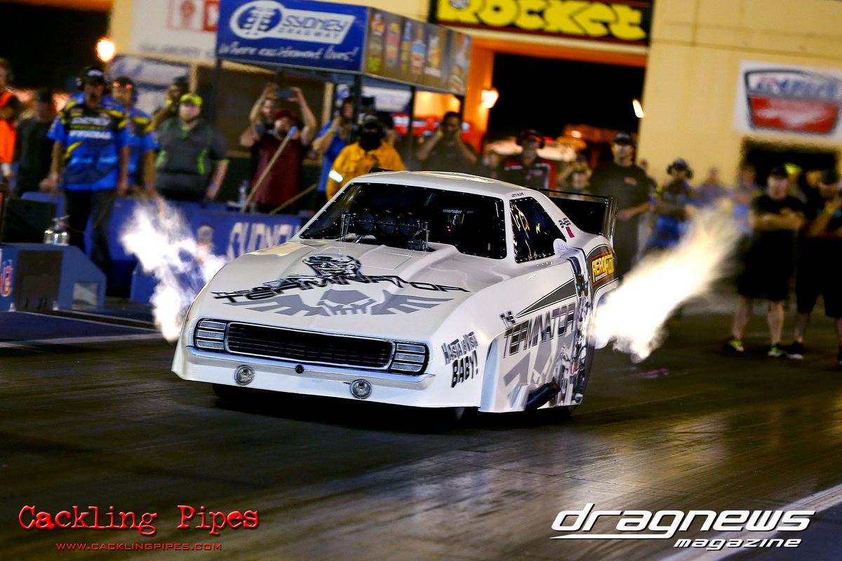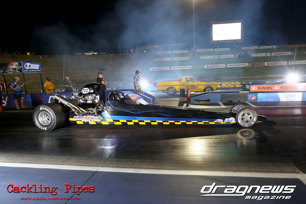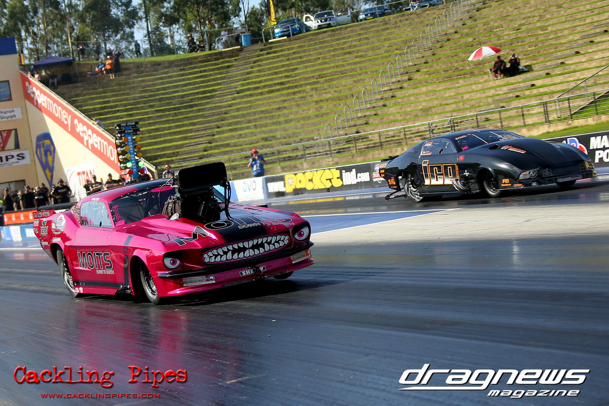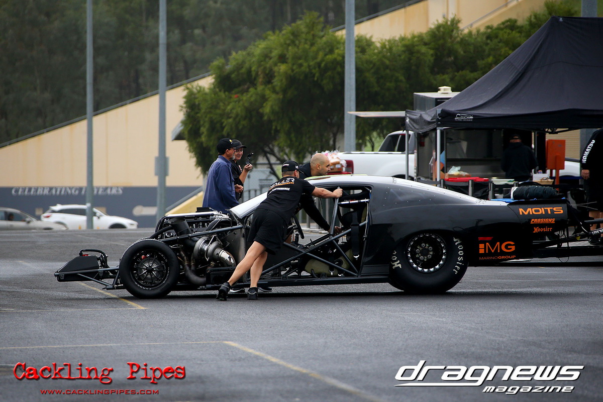 One shot qualifying saw Paul Mouhayet on point with a 5.66 but he did not front for eliminations with the Moits Pro Slammer. Close behind was Greg Tsakiridis is the former Moits twin turbo Mustang with a 5.69 PB and a flying 271mph. Emilio Spinozzi carded a 5.87 followed by Michelle Davies’ 5.96 in their Pro Slammers. Stunning everyone was Barry Plumpton who hauled his nitrous doorslammer across the ditch and dropped a 6.04 at 238mph from his 969ci Camaro – the quickest and fastest nitrous pass in the country by a long way.