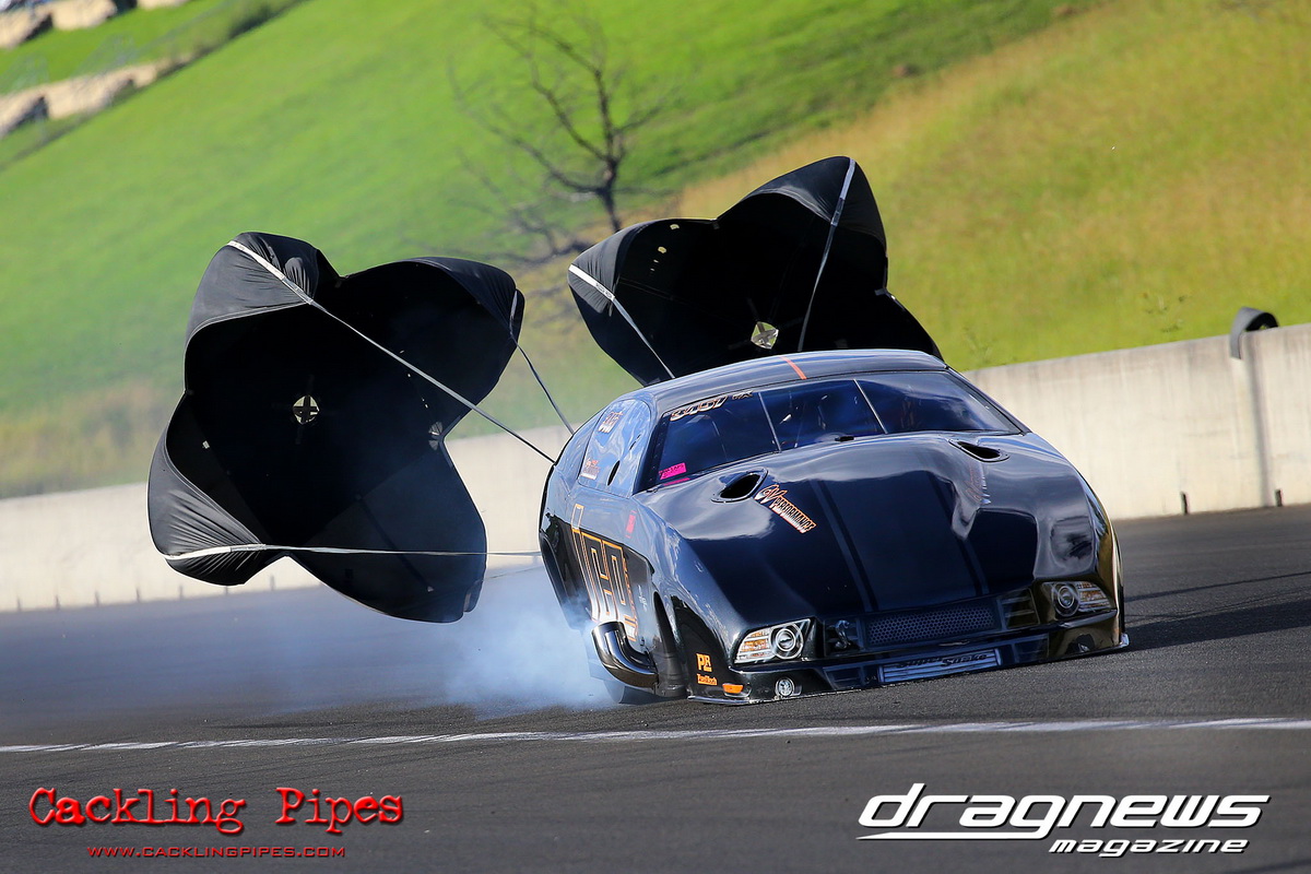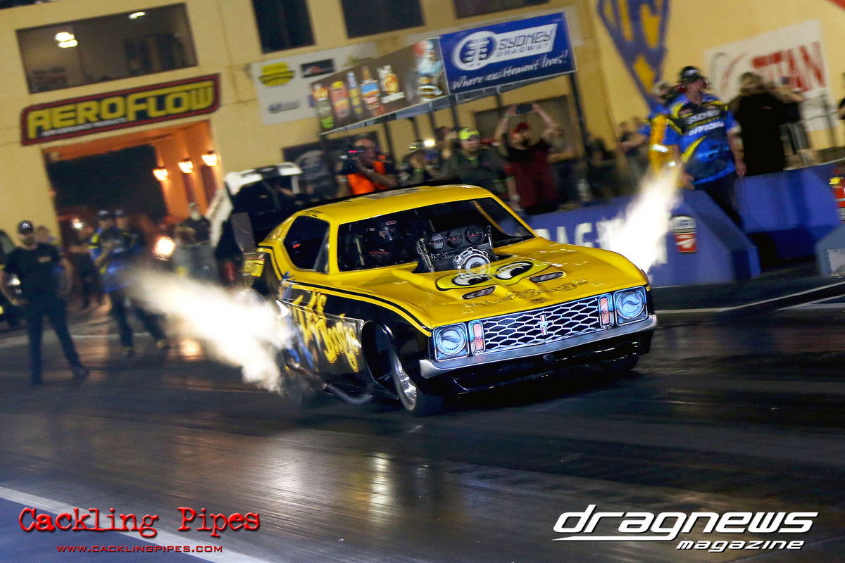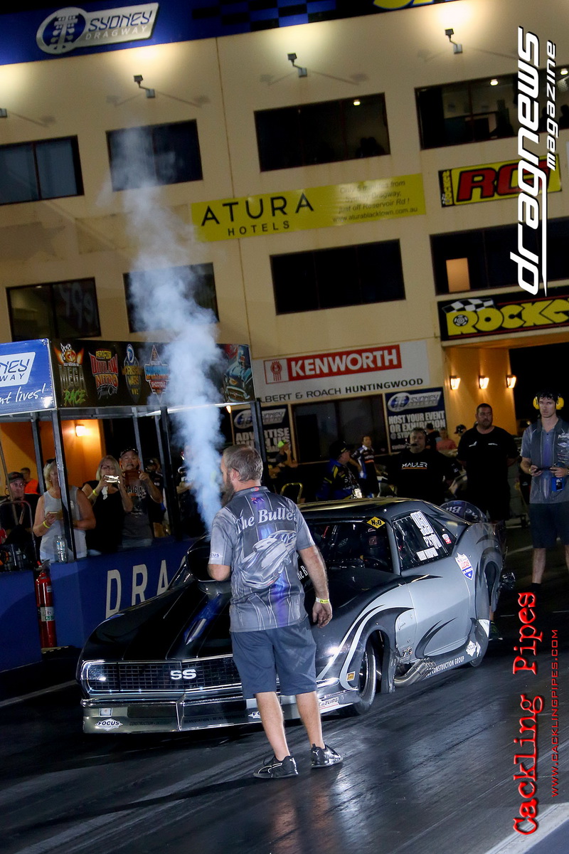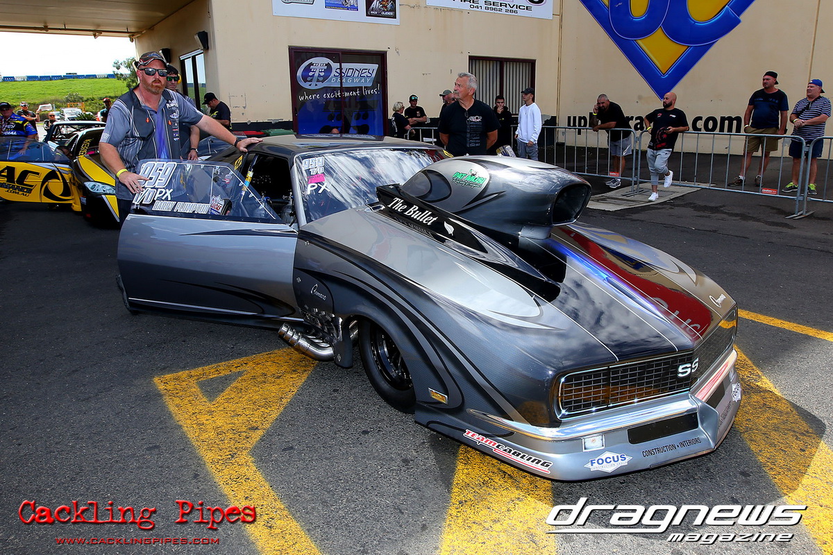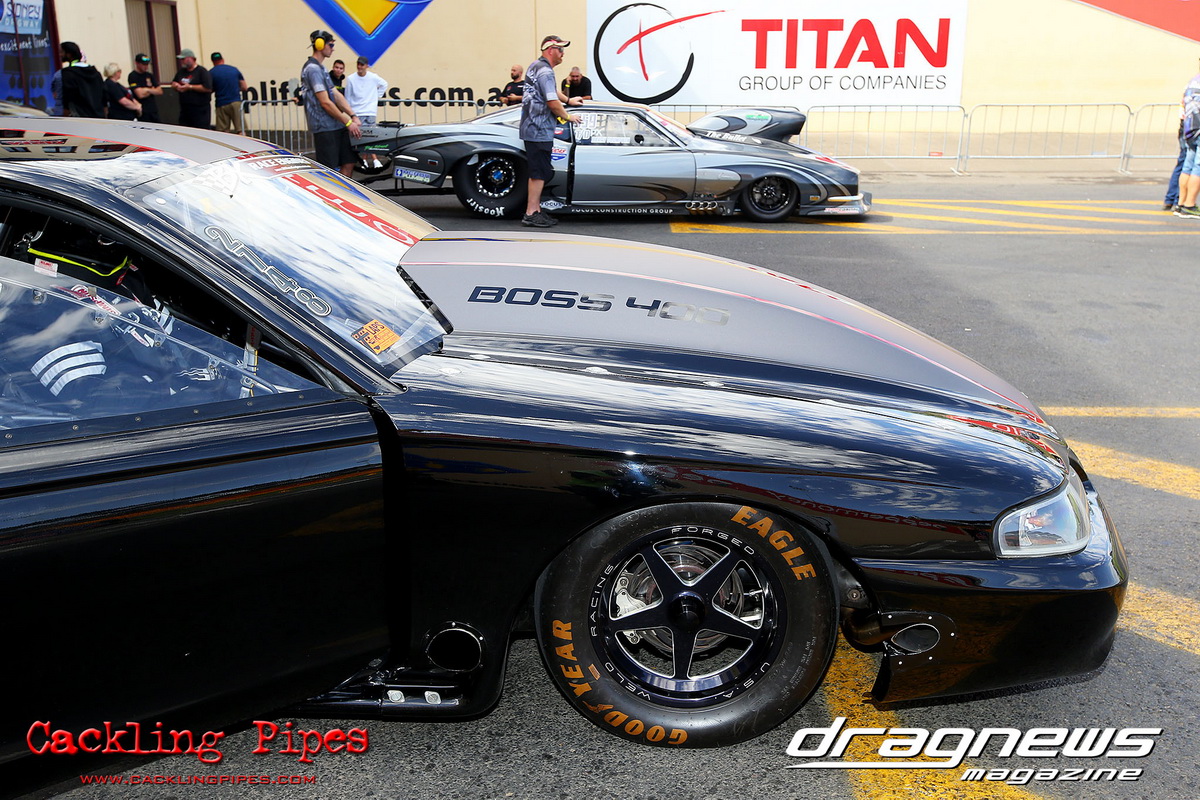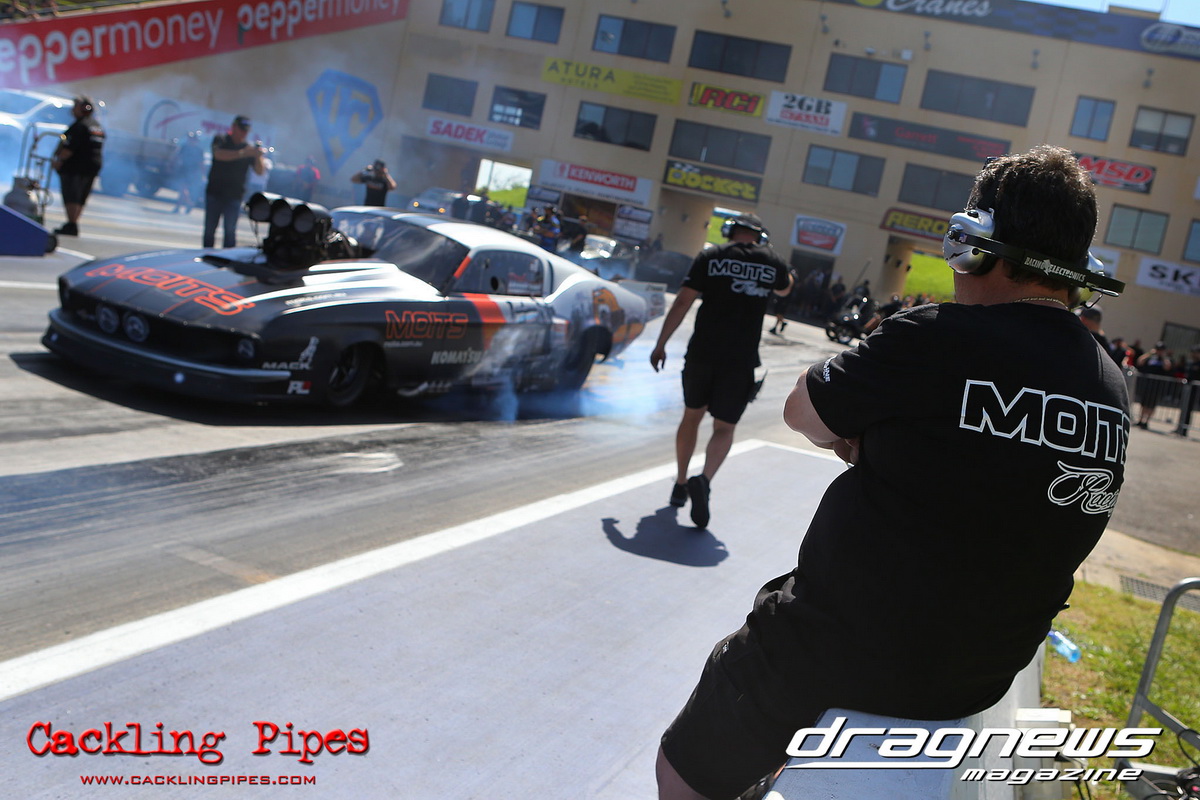 One shot qualifying saw Paul Mouhayet on point with a 5.66 but he did not front for eliminations with the Moits Pro Slammer. Close behind was Greg Tsakiridis is the former Moits twin turbo Mustang with a 5.69 PB and a flying 271mph. Emilio Spinozzi carded a 5.87 followed by Michelle Davies’ 5.96 in their Pro Slammers. Stunning everyone was Barry Plumpton who hauled his nitrous doorslammer across the ditch and dropped a 6.04 at 238mph from his 969ci Camaro – the quickest and fastest nitrous pass in the country by a long way.