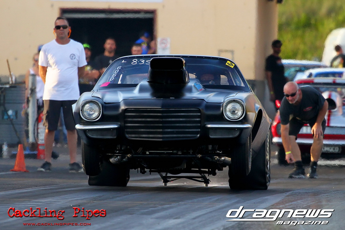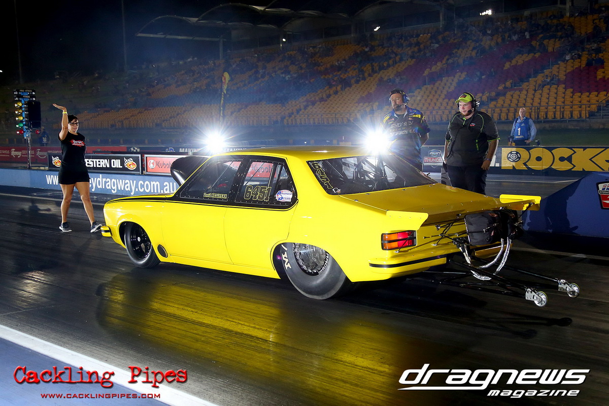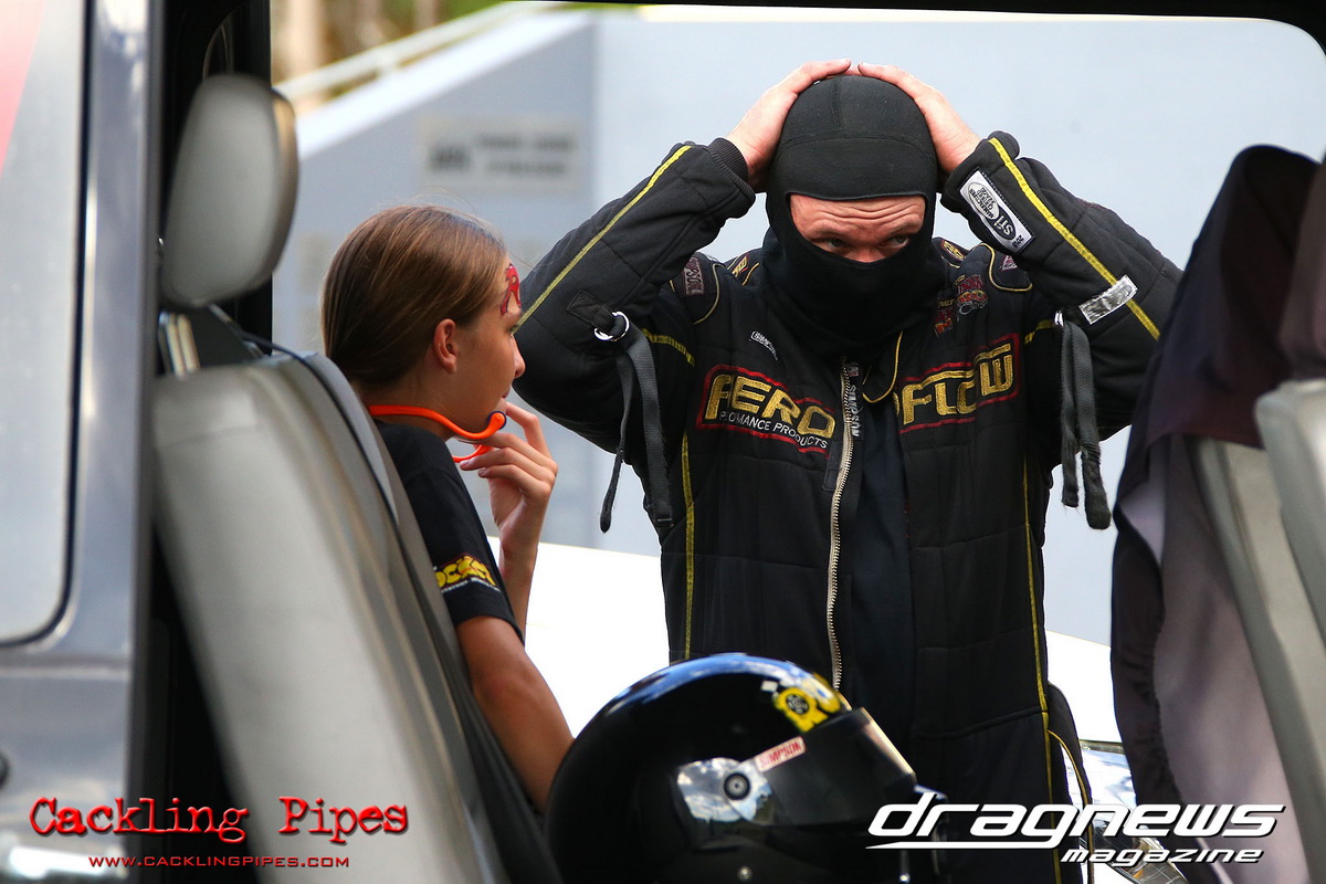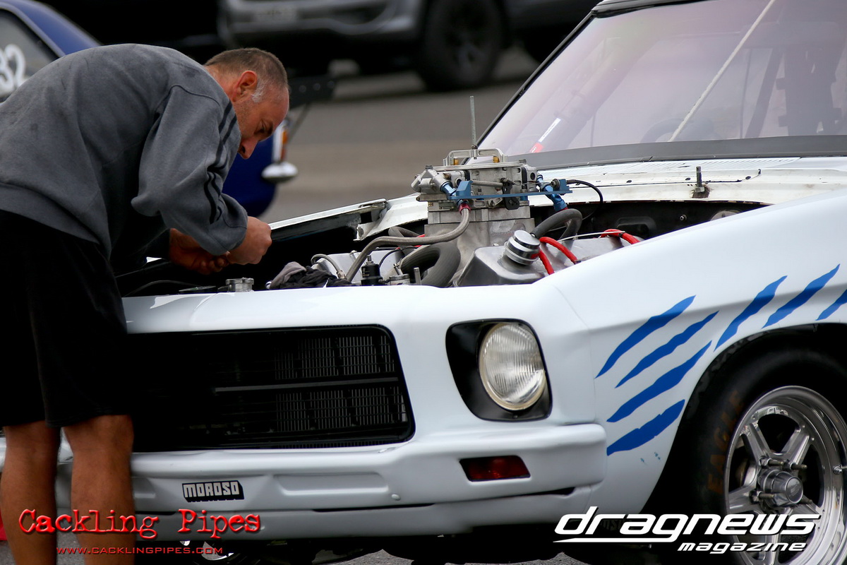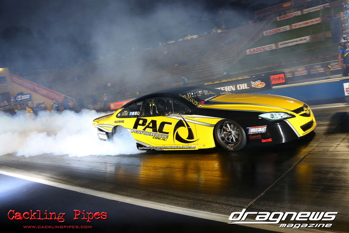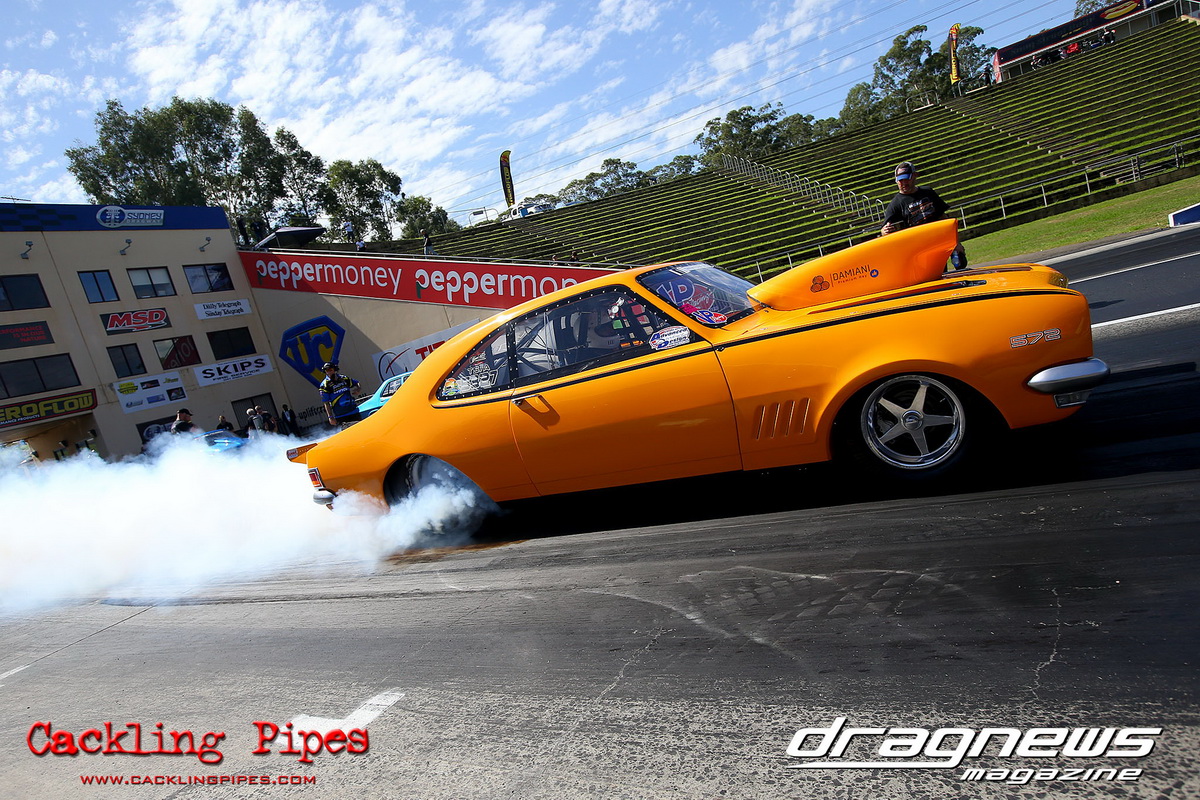 One shot qualifying saw Paul Mouhayet on point with a 5.66 but he did not front for eliminations with the Moits Pro Slammer. Close behind was Greg Tsakiridis is the former Moits twin turbo Mustang with a 5.69 PB and a flying 271mph. Emilio Spinozzi carded a 5.87 followed by Michelle Davies’ 5.96 in their Pro Slammers. Stunning everyone was Barry Plumpton who hauled his nitrous doorslammer across the ditch and dropped a 6.04 at 238mph from his 969ci Camaro – the quickest and fastest nitrous pass in the country by a long way.