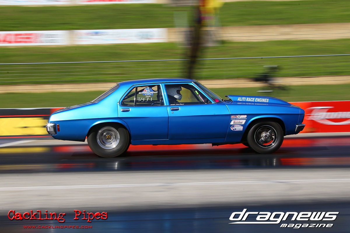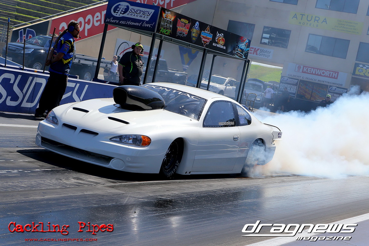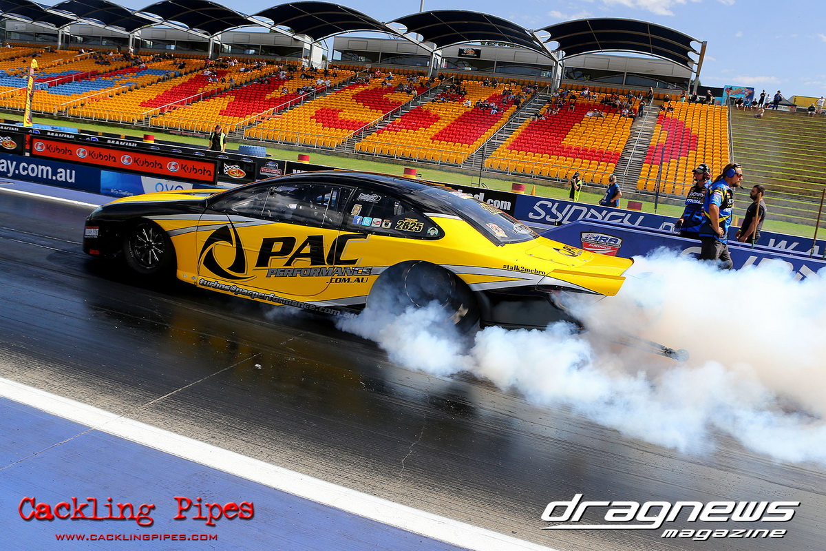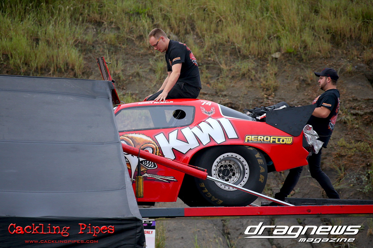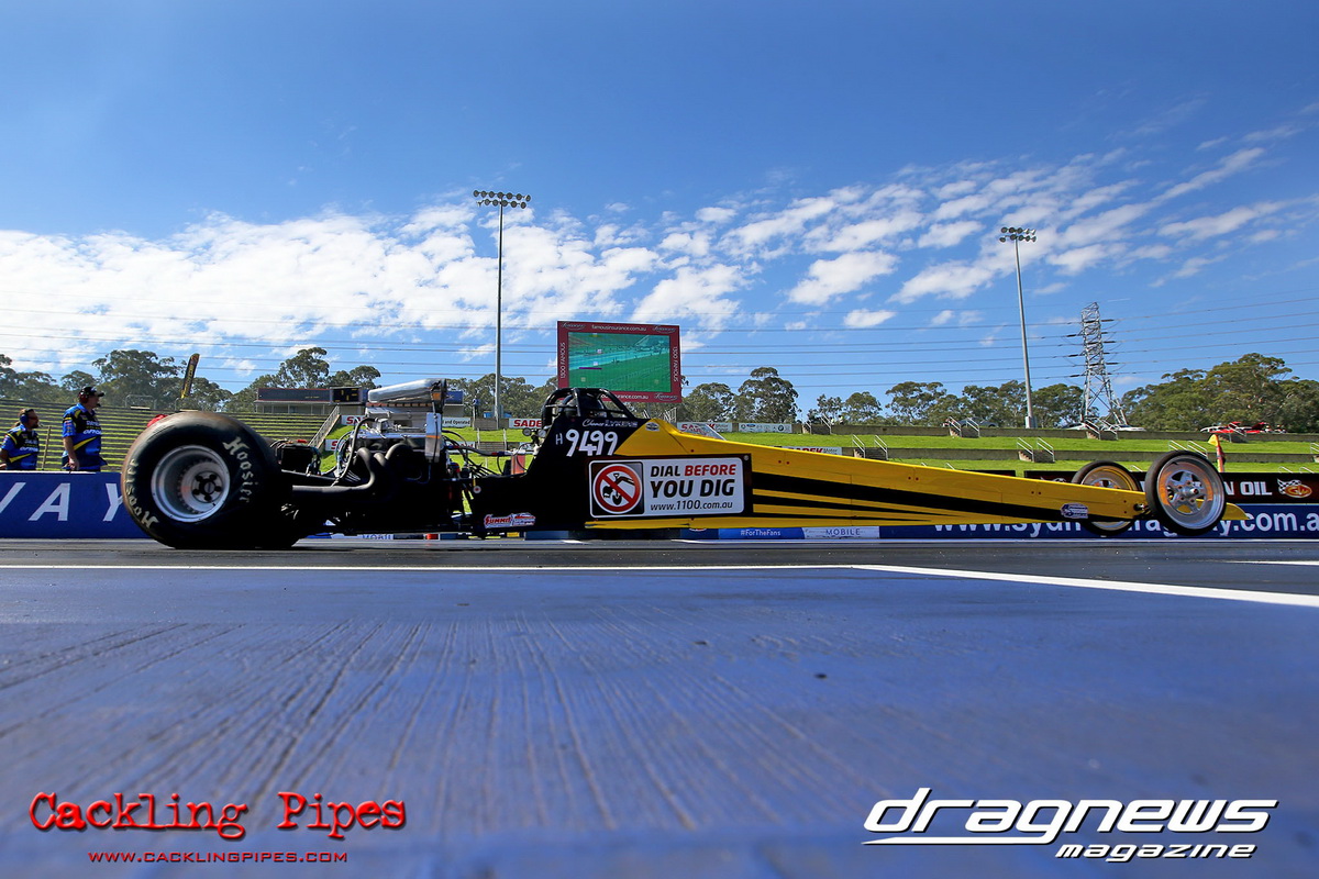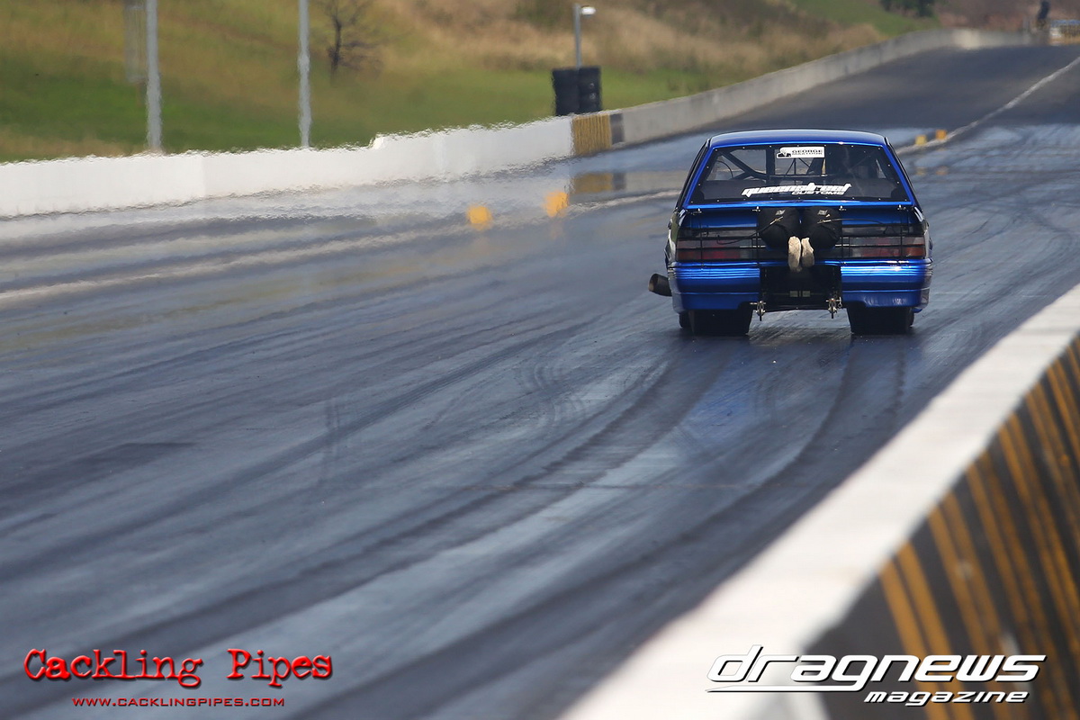 One shot qualifying saw Paul Mouhayet on point with a 5.66 but he did not front for eliminations with the Moits Pro Slammer. Close behind was Greg Tsakiridis is the former Moits twin turbo Mustang with a 5.69 PB and a flying 271mph. Emilio Spinozzi carded a 5.87 followed by Michelle Davies’ 5.96 in their Pro Slammers. Stunning everyone was Barry Plumpton who hauled his nitrous doorslammer across the ditch and dropped a 6.04 at 238mph from his 969ci Camaro – the quickest and fastest nitrous pass in the country by a long way.