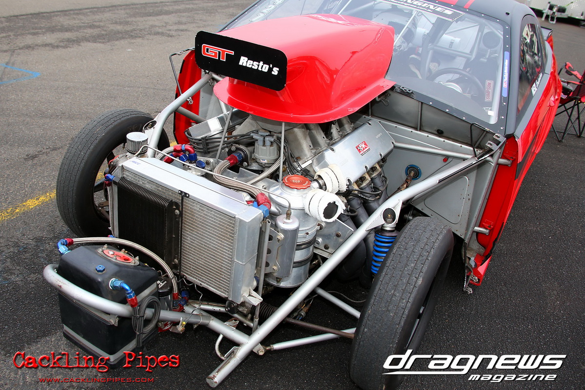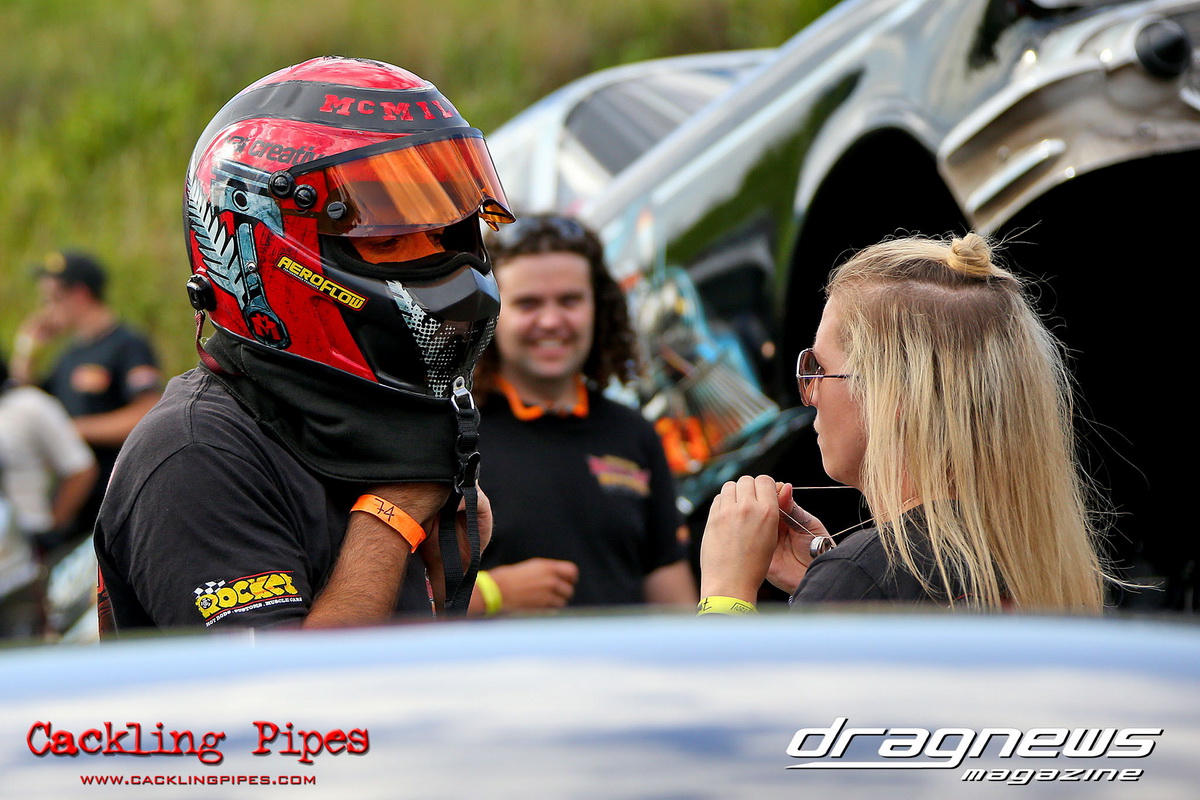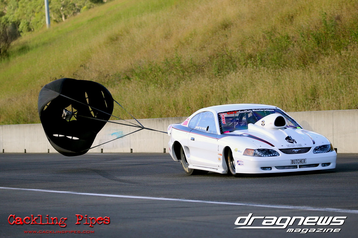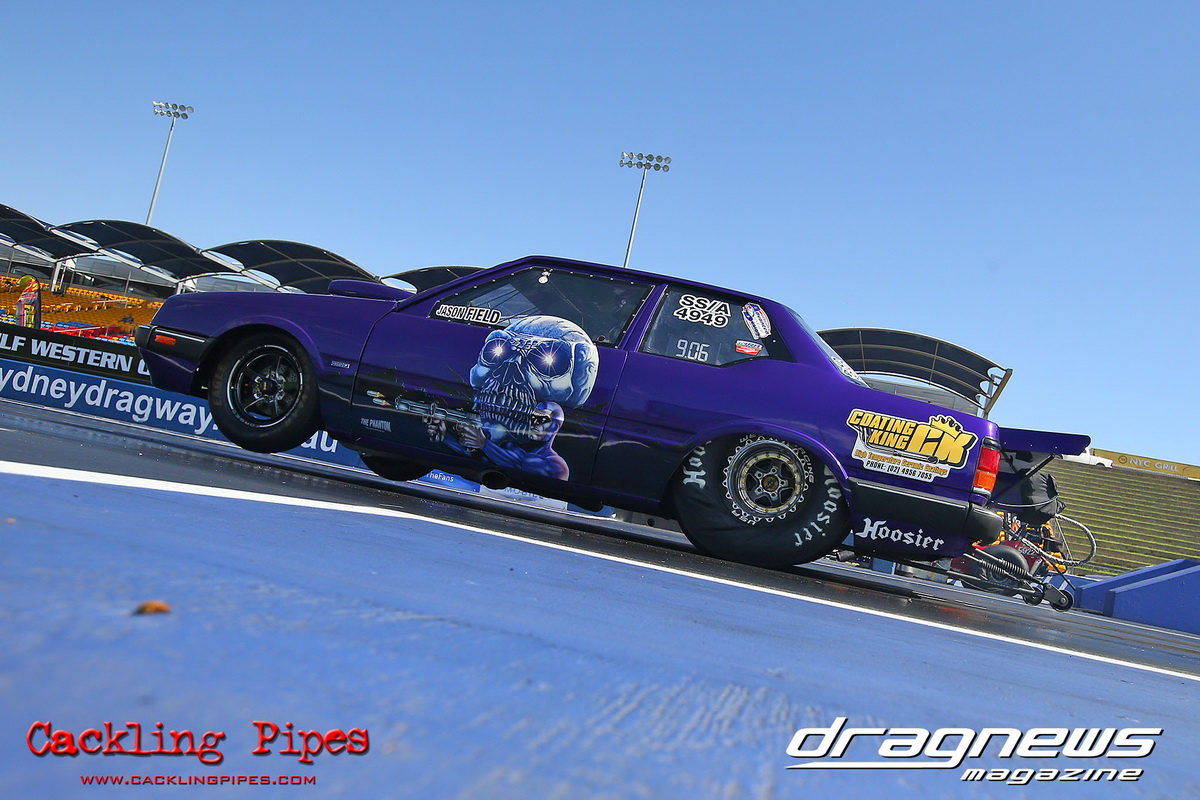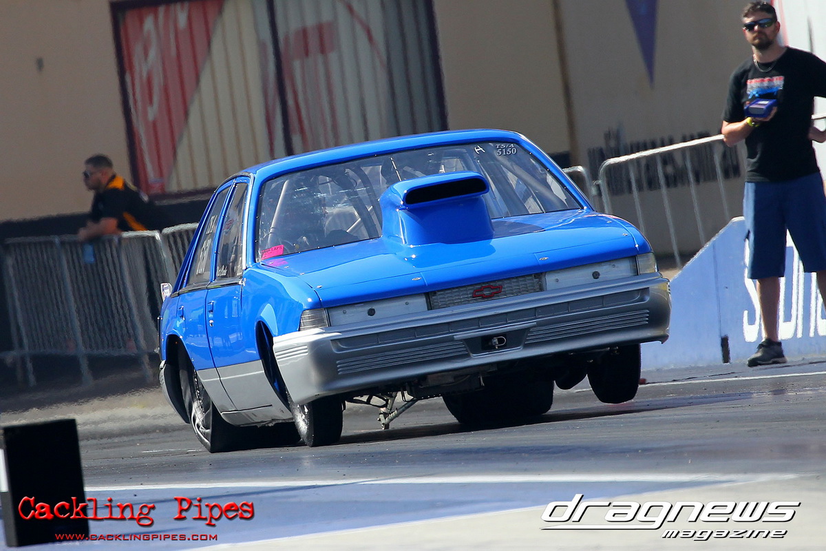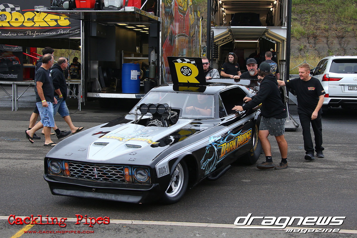 One shot qualifying saw Paul Mouhayet on point with a 5.66 but he did not front for eliminations with the Moits Pro Slammer. Close behind was Greg Tsakiridis is the former Moits twin turbo Mustang with a 5.69 PB and a flying 271mph. Emilio Spinozzi carded a 5.87 followed by Michelle Davies’ 5.96 in their Pro Slammers. Stunning everyone was Barry Plumpton who hauled his nitrous doorslammer across the ditch and dropped a 6.04 at 238mph from his 969ci Camaro – the quickest and fastest nitrous pass in the country by a long way.