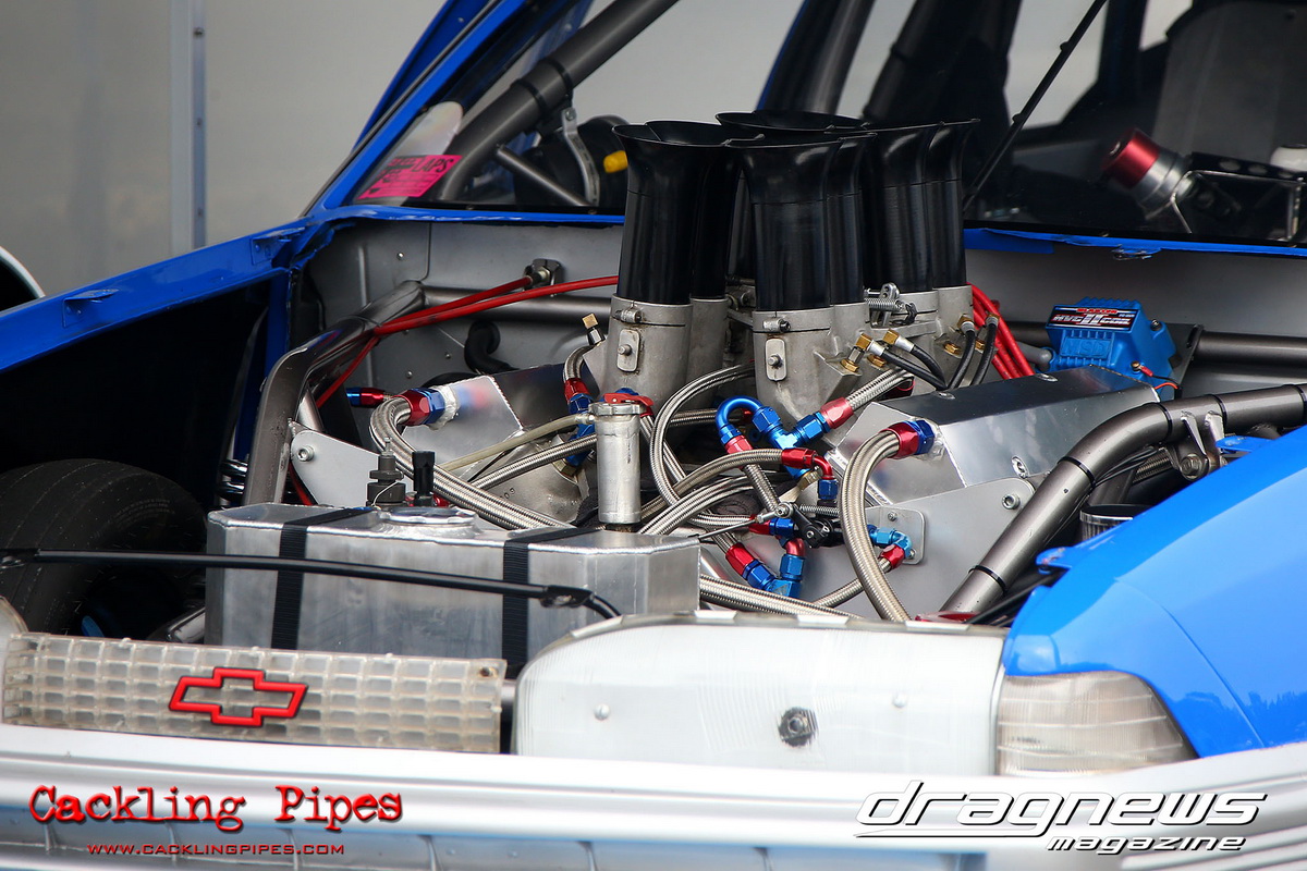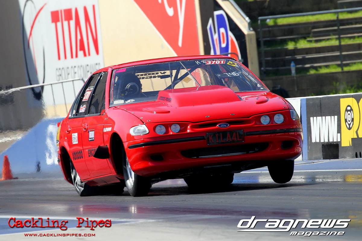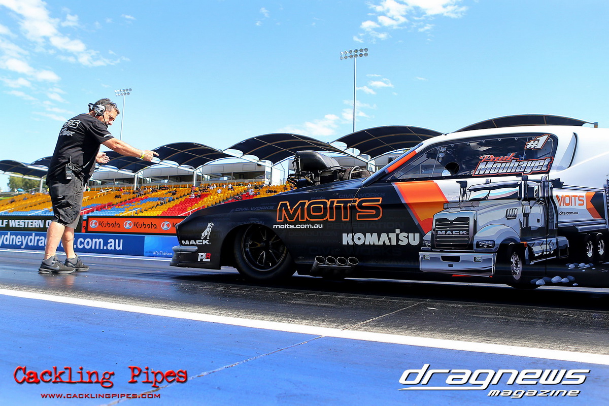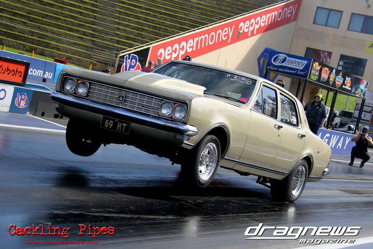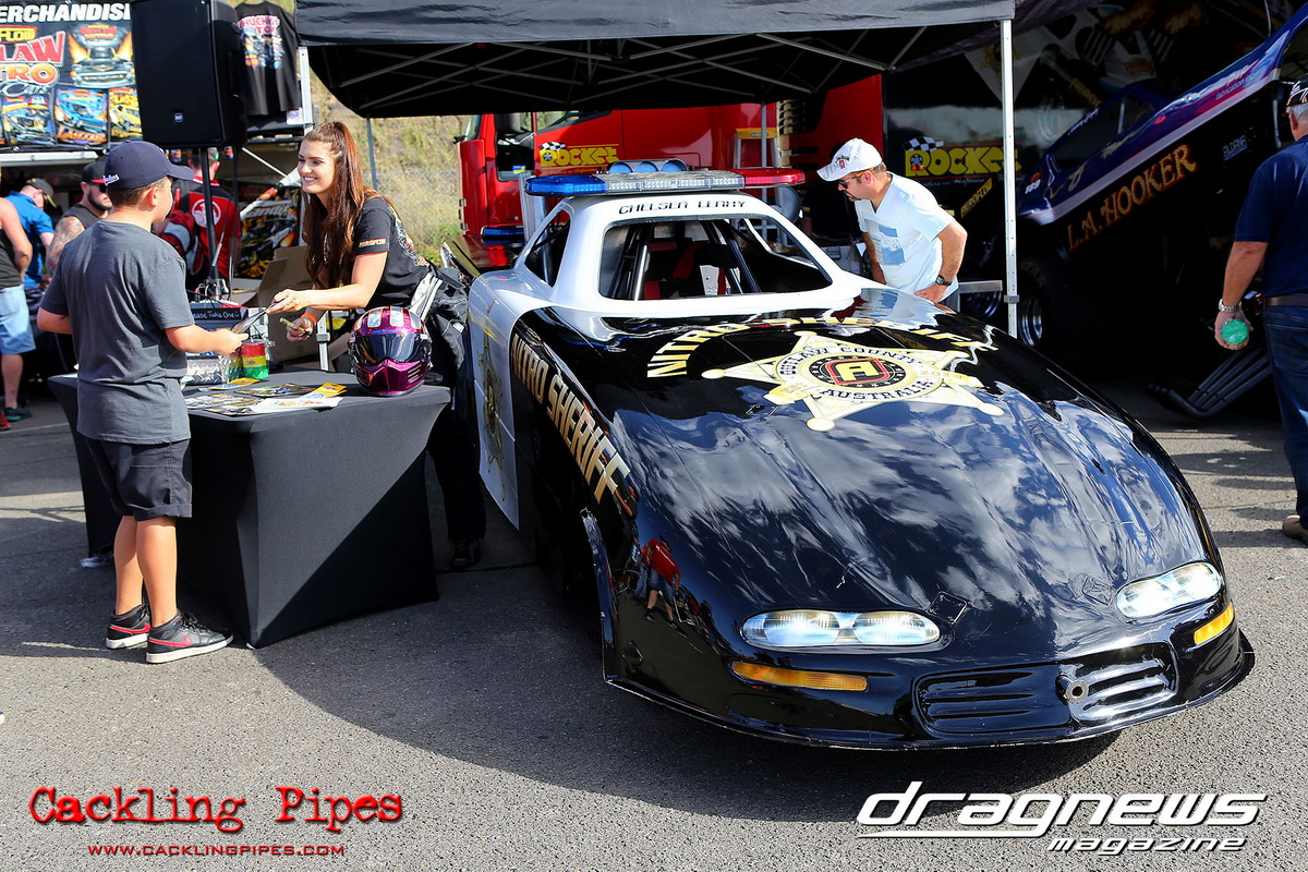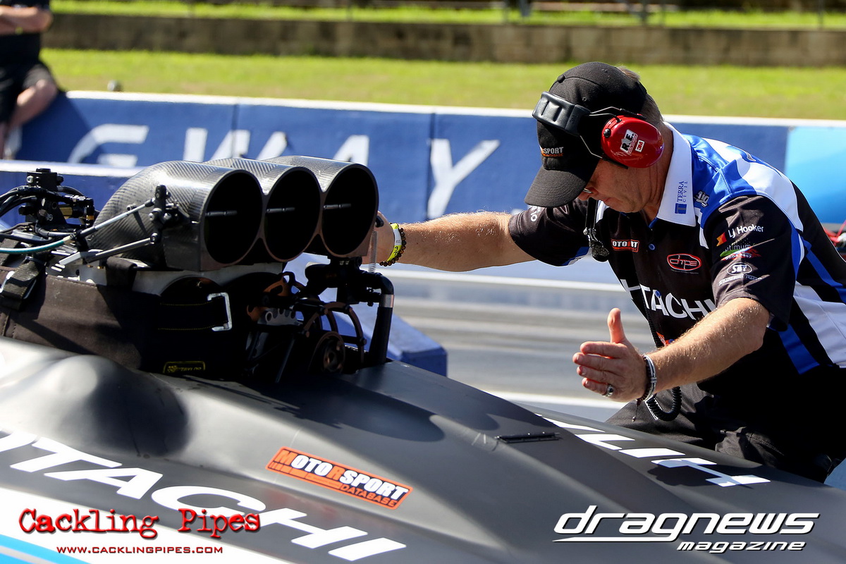 One shot qualifying saw Paul Mouhayet on point with a 5.66 but he did not front for eliminations with the Moits Pro Slammer. Close behind was Greg Tsakiridis is the former Moits twin turbo Mustang with a 5.69 PB and a flying 271mph. Emilio Spinozzi carded a 5.87 followed by Michelle Davies’ 5.96 in their Pro Slammers. Stunning everyone was Barry Plumpton who hauled his nitrous doorslammer across the ditch and dropped a 6.04 at 238mph from his 969ci Camaro – the quickest and fastest nitrous pass in the country by a long way.