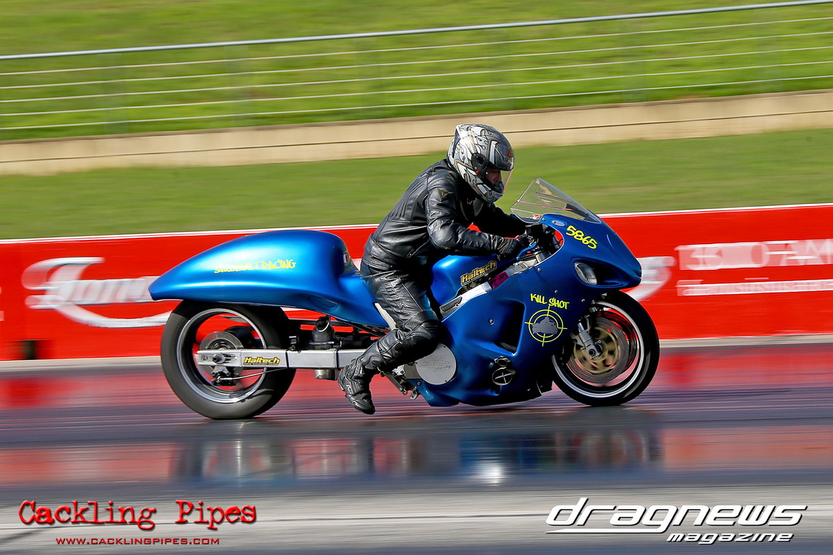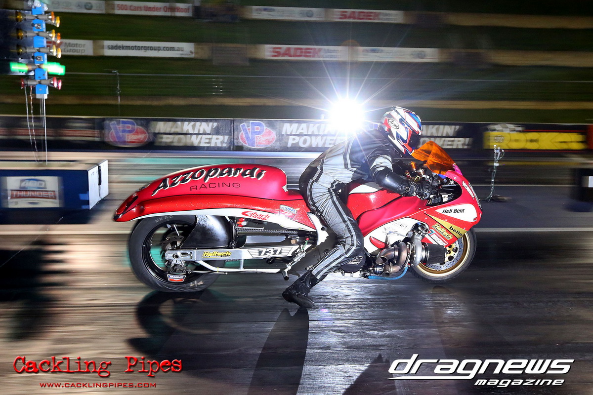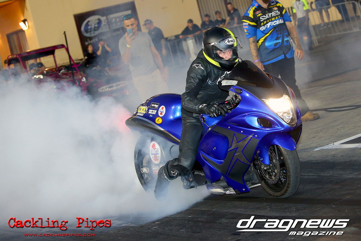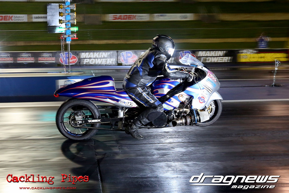 The pair virtually repeated their numbers in round wins over Rowan Lind and Darren Foley respectively, and again in round two. In the final round Lind soloed to a 7.62 at 185 and the two Azzopardi team bikes threw down. Borg had a huge jump, but it was not needed when the Azzopardi bike struck trouble and Borg rode away to a 7.32 186mph event win.