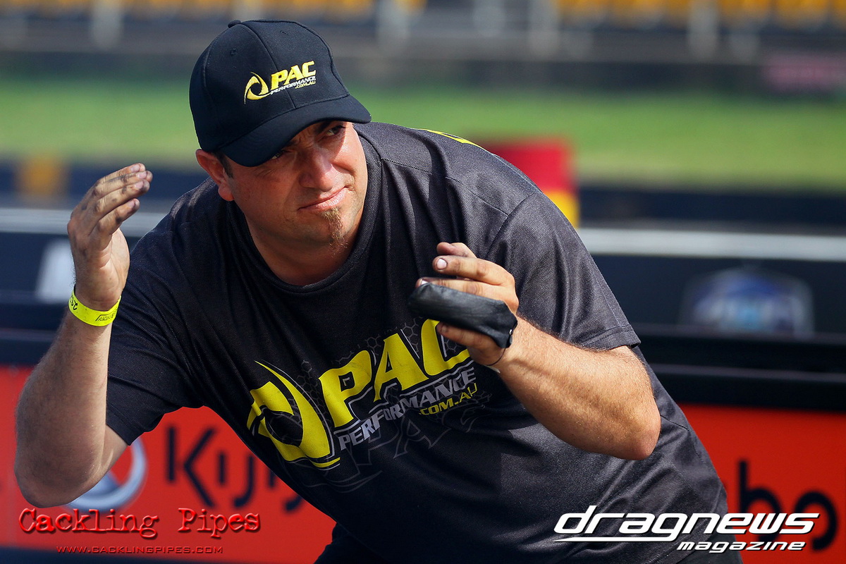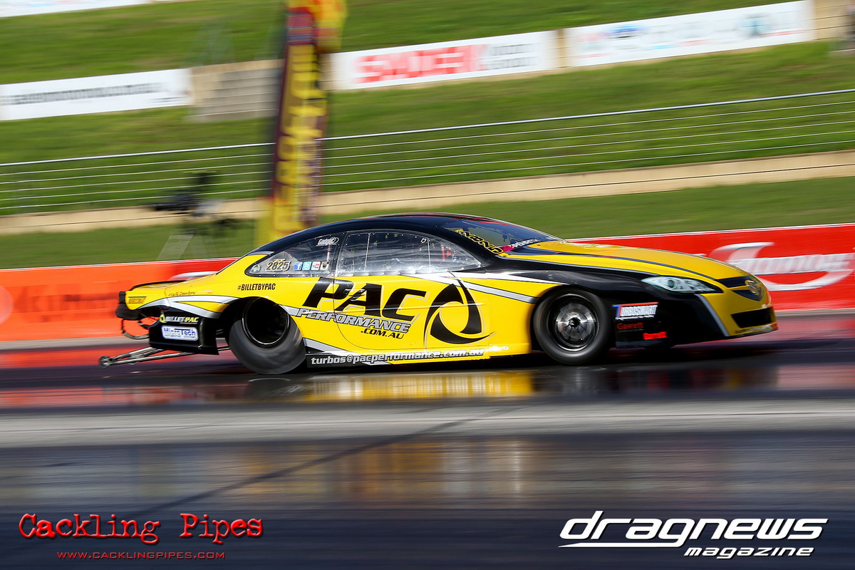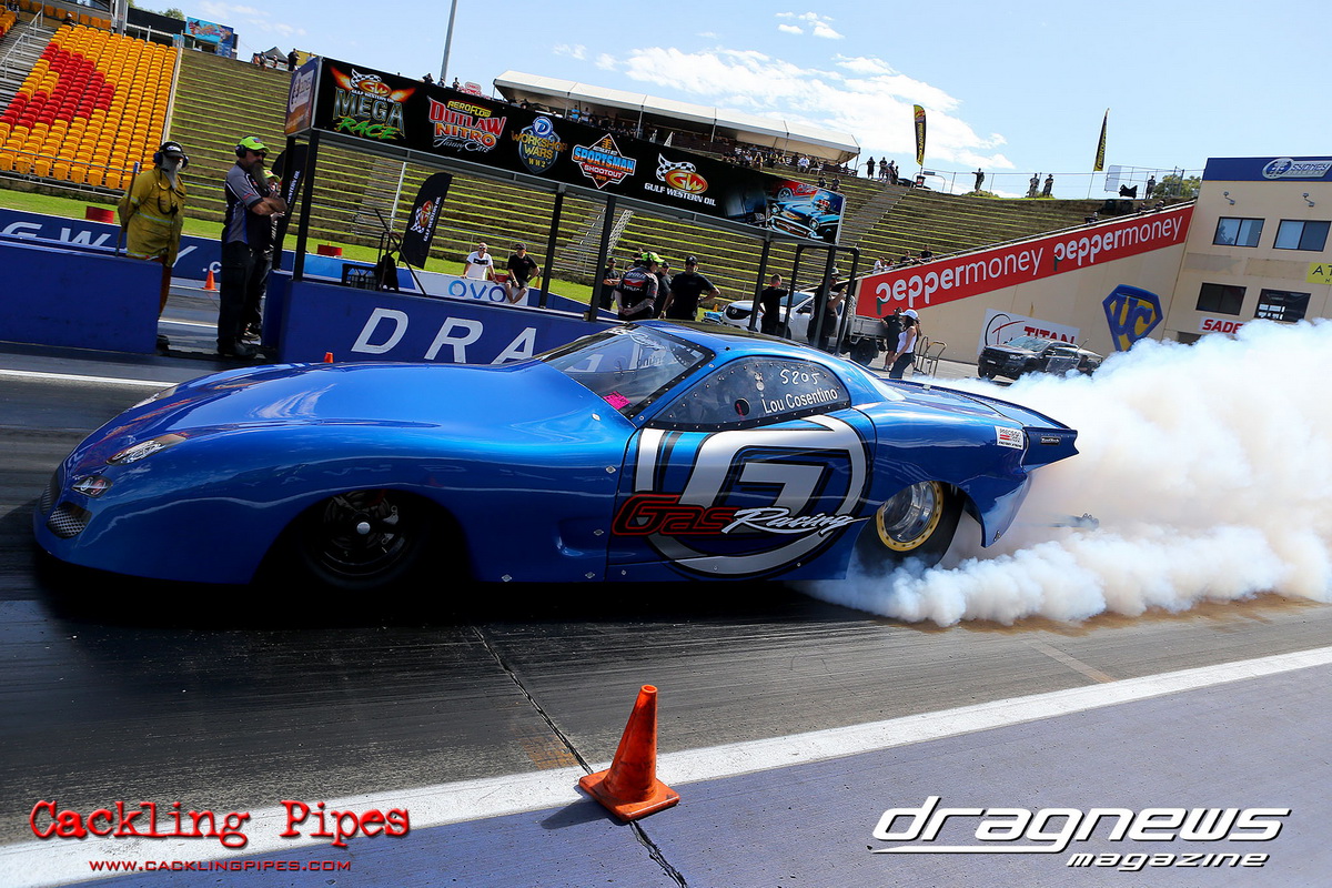 Plumpton cruised through the second round with a tyre shaking 6.21 for low ET of the round against Loues Consentino’s 2JZ RX7. Wins went also to Murina’s Corvette, Tsakiridis, who burnt a cylinder and Rehayem with a strong 6.37 in the PAC Performance rotary.