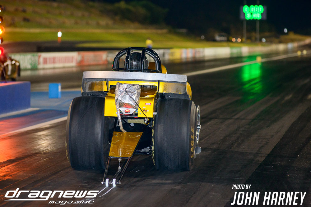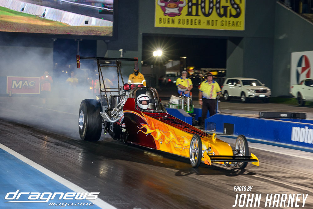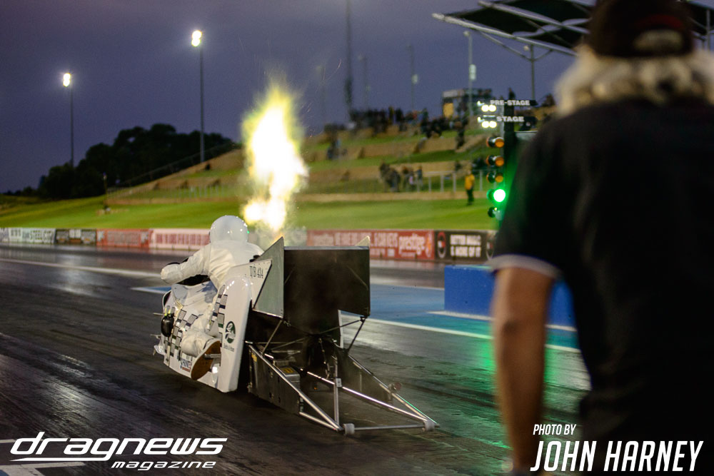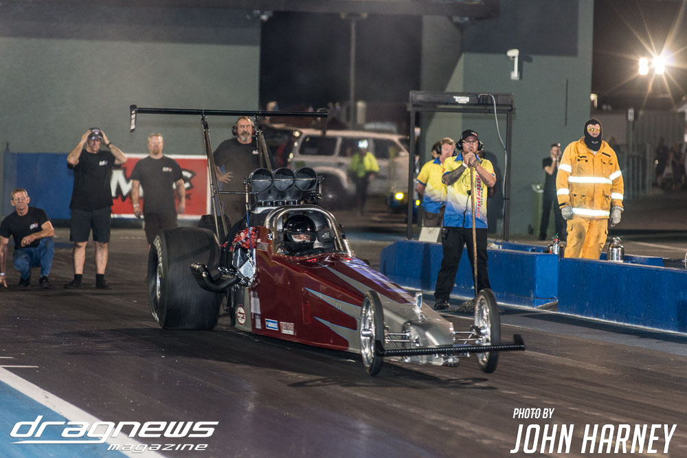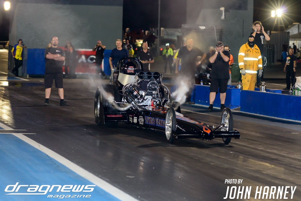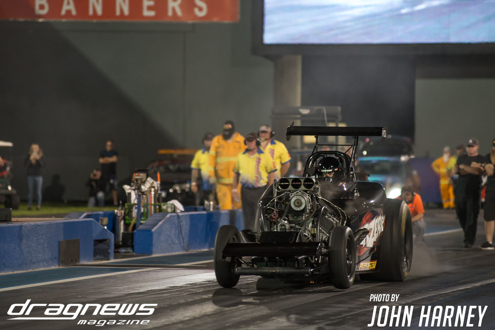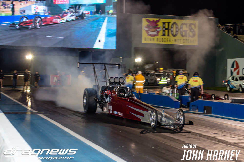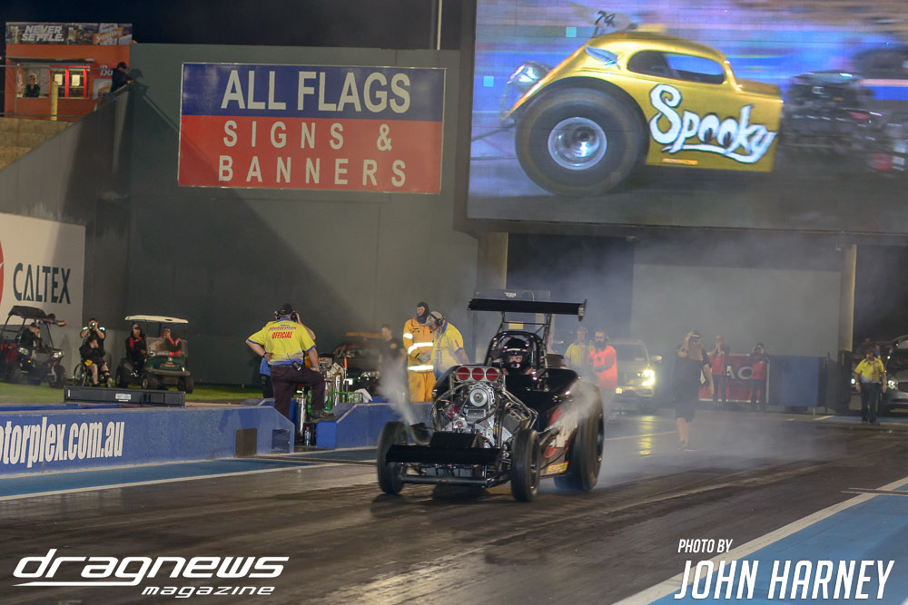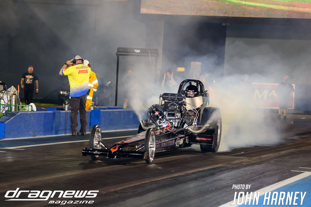 Mark Sheehan and Michael Brookes also matched up in their front engine Top Fuel Dragsters, with Sheehan recording his first 5sec. run in the ‘Black Widow’ car.