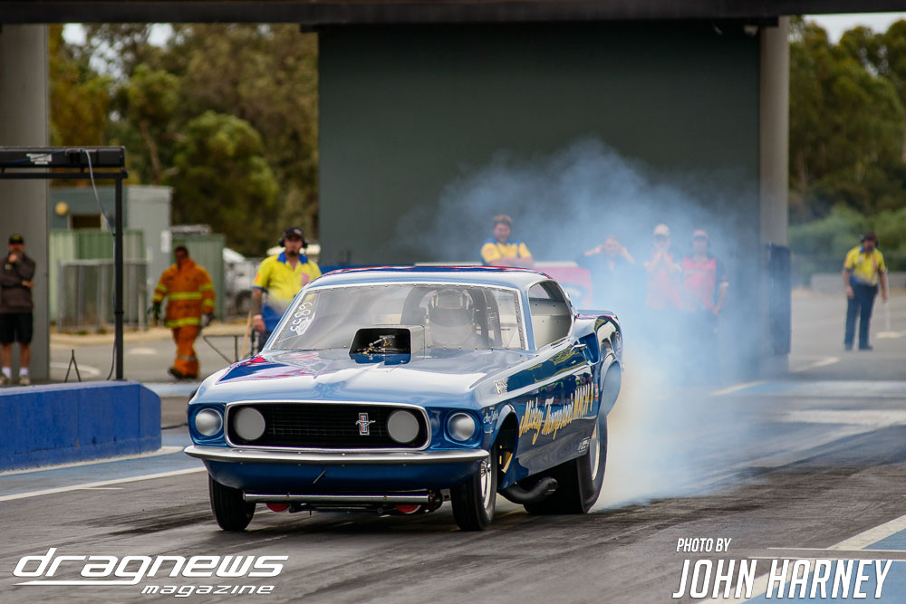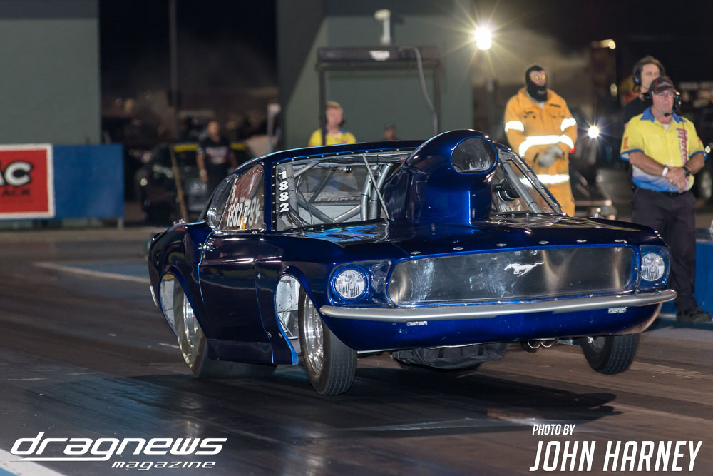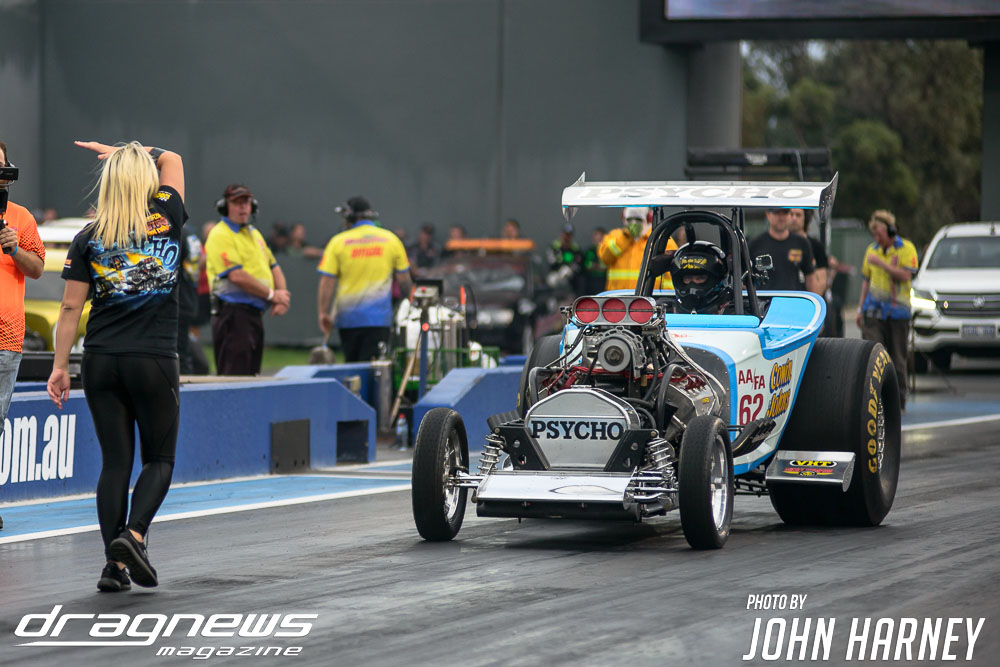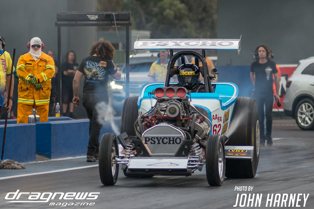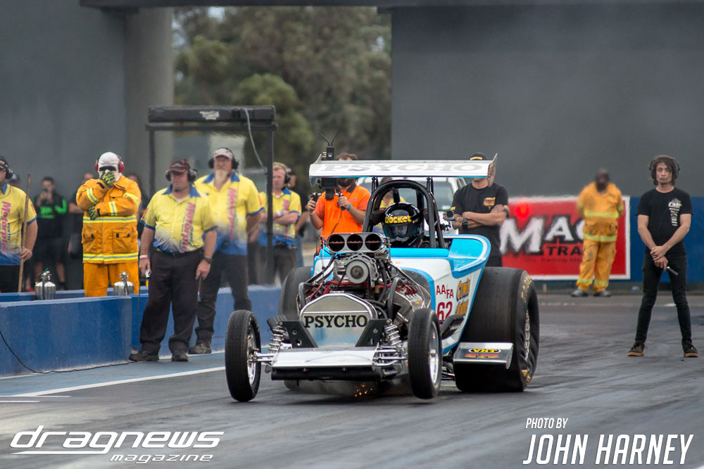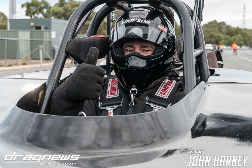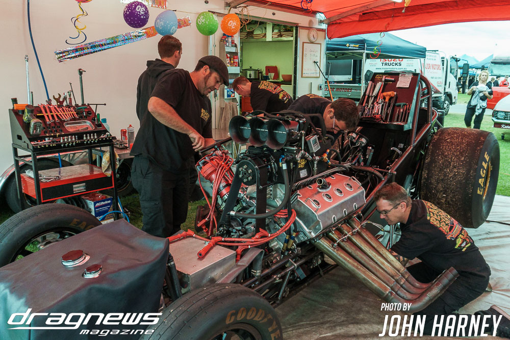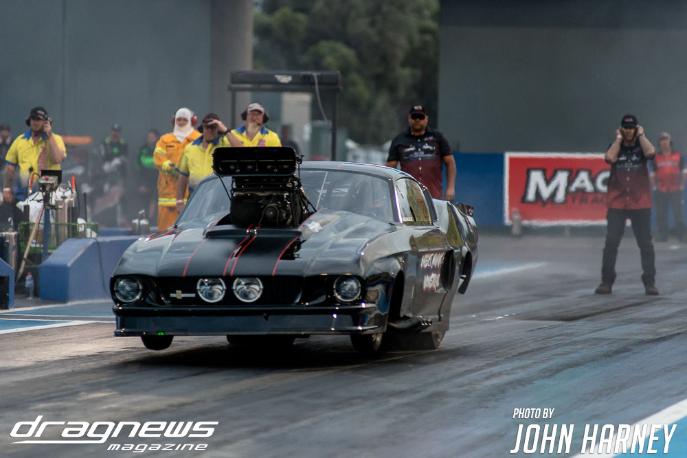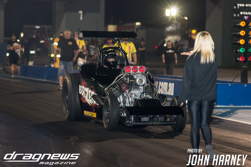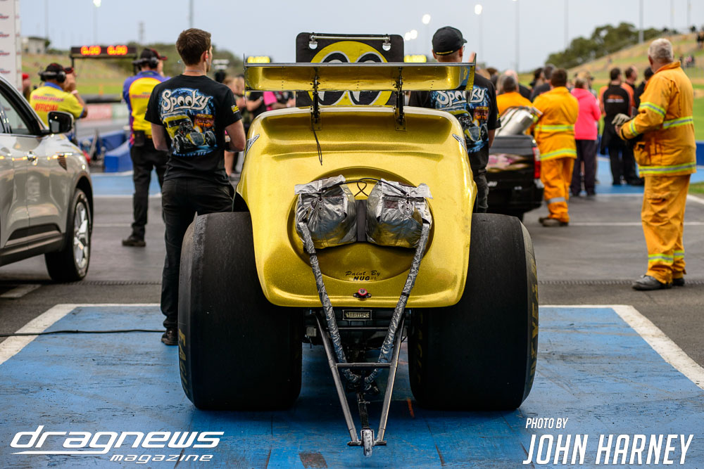 Mark Sheehan and Michael Brookes also matched up in their front engine Top Fuel Dragsters, with Sheehan recording his first 5sec. run in the ‘Black Widow’ car.