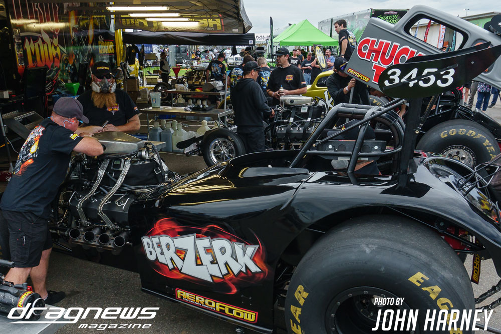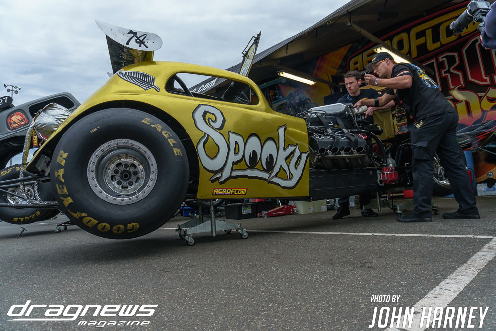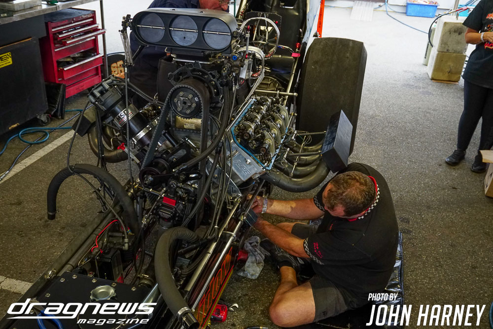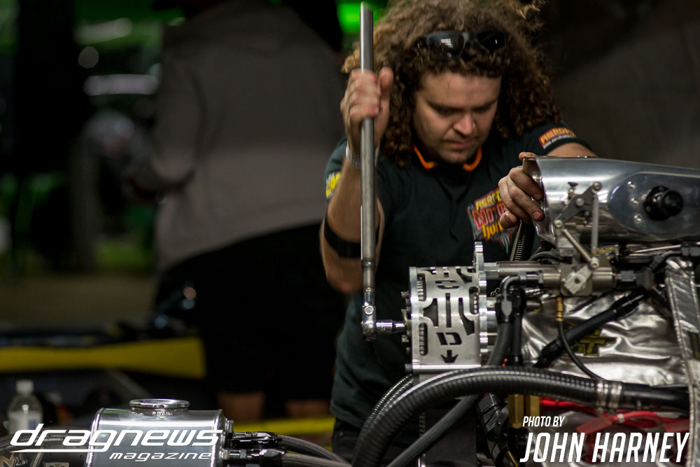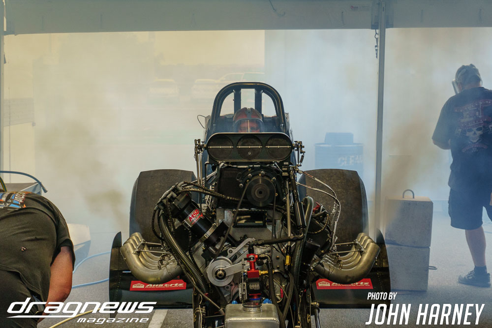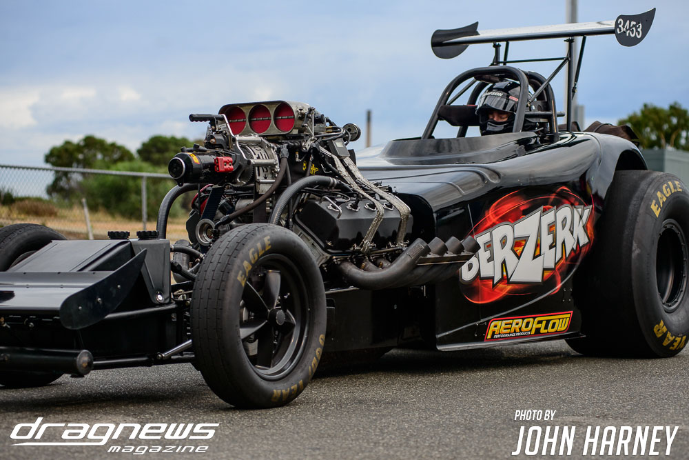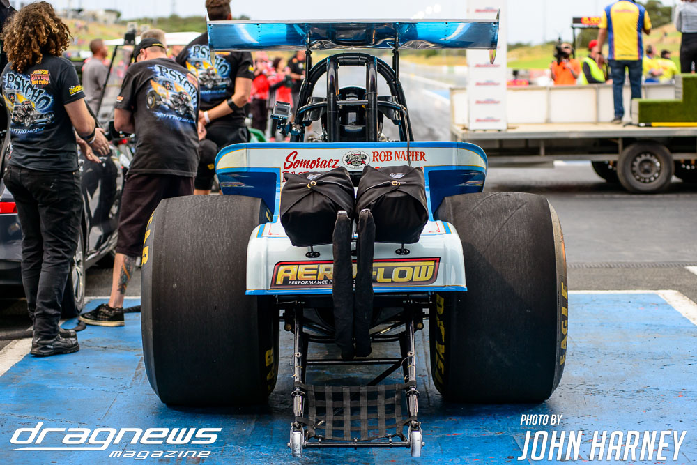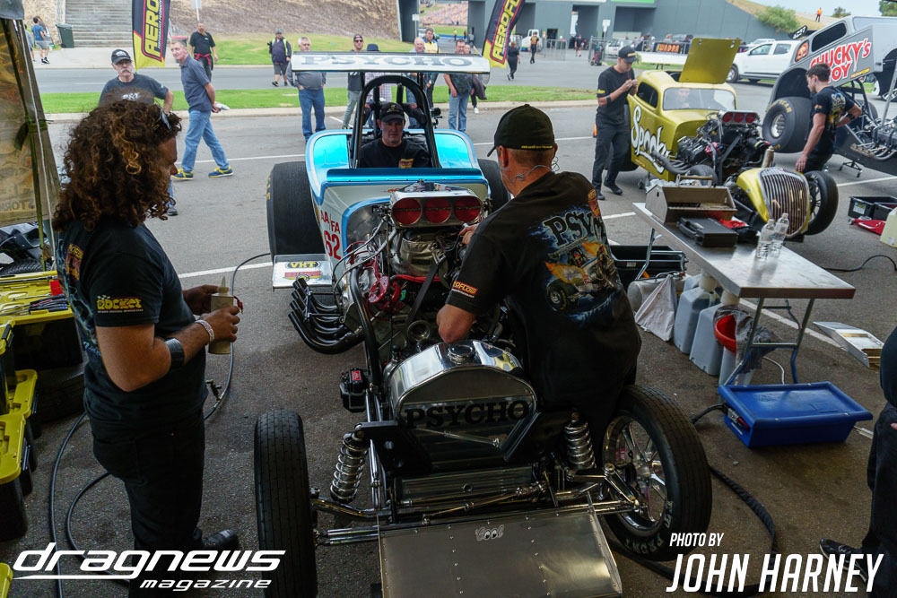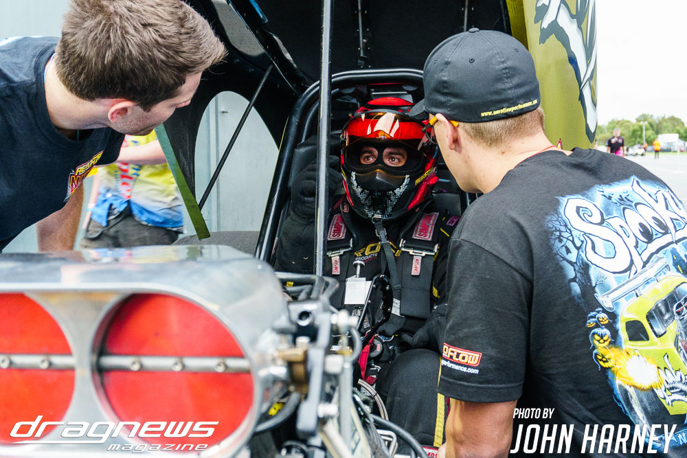 Mark Sheehan and Michael Brookes also matched up in their front engine Top Fuel Dragsters, with Sheehan recording his first 5sec. run in the ‘Black Widow’ car.