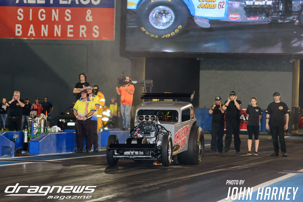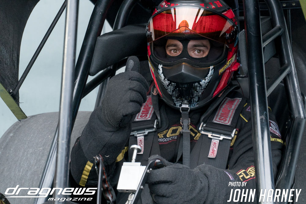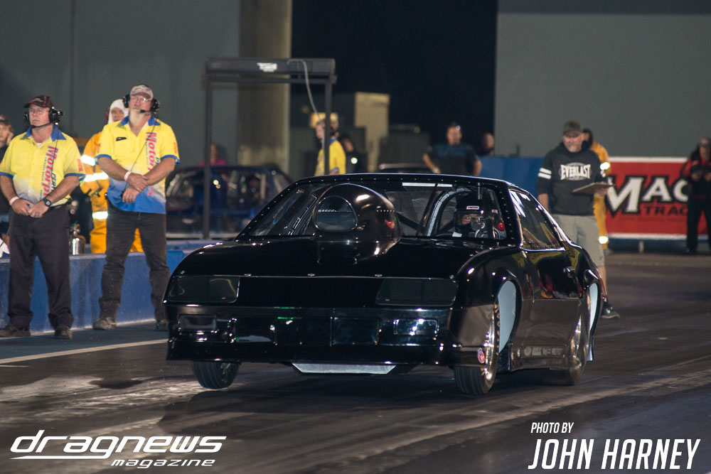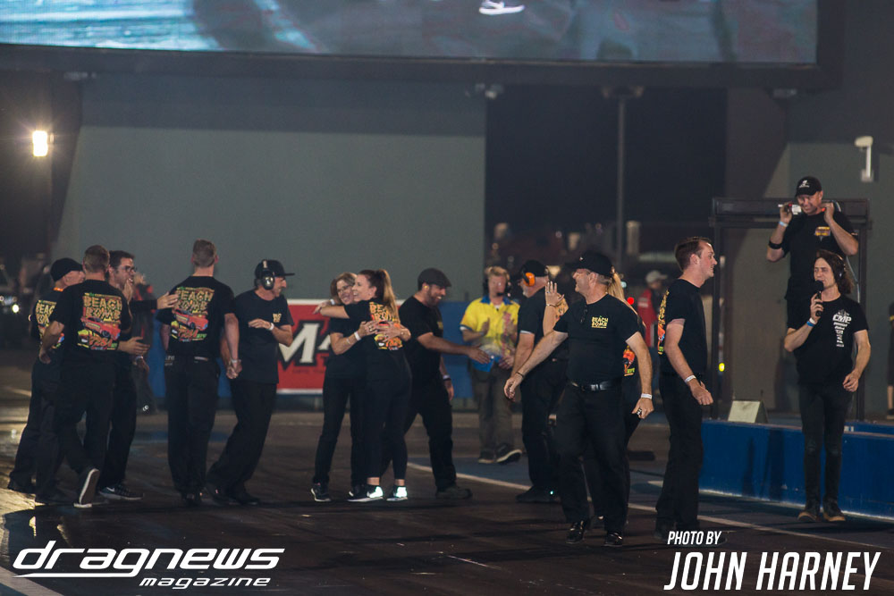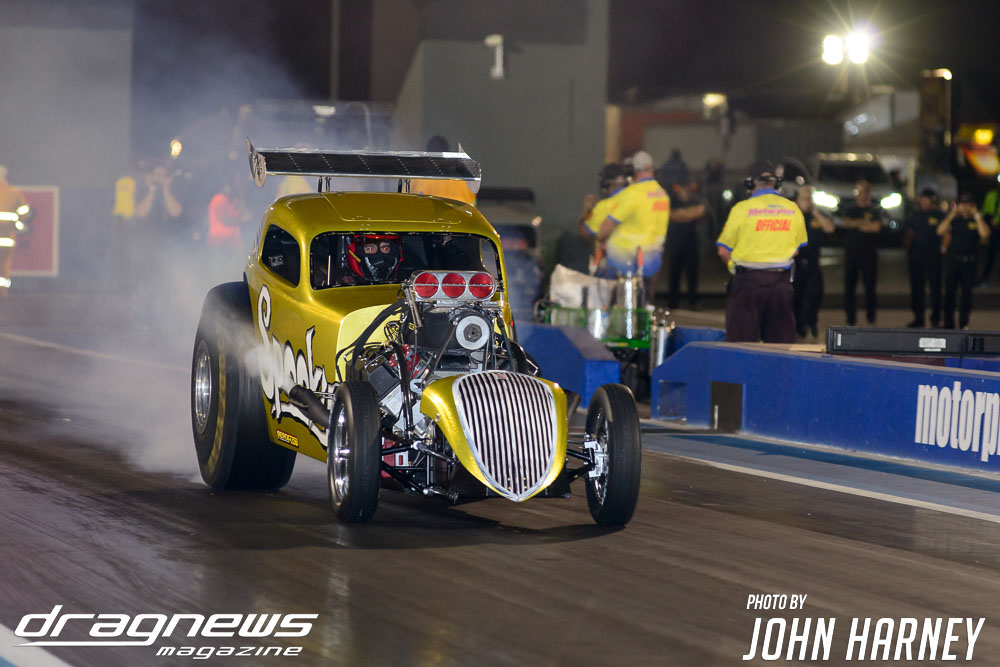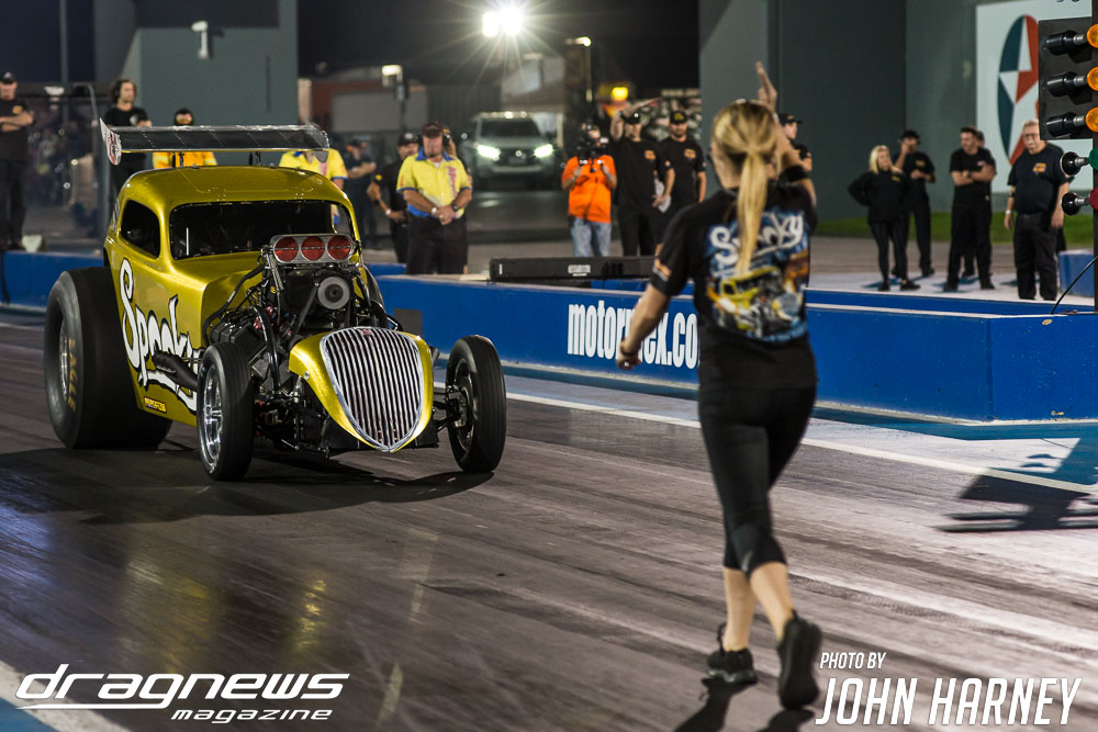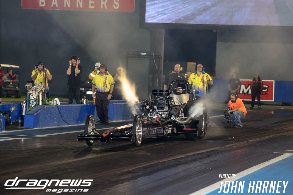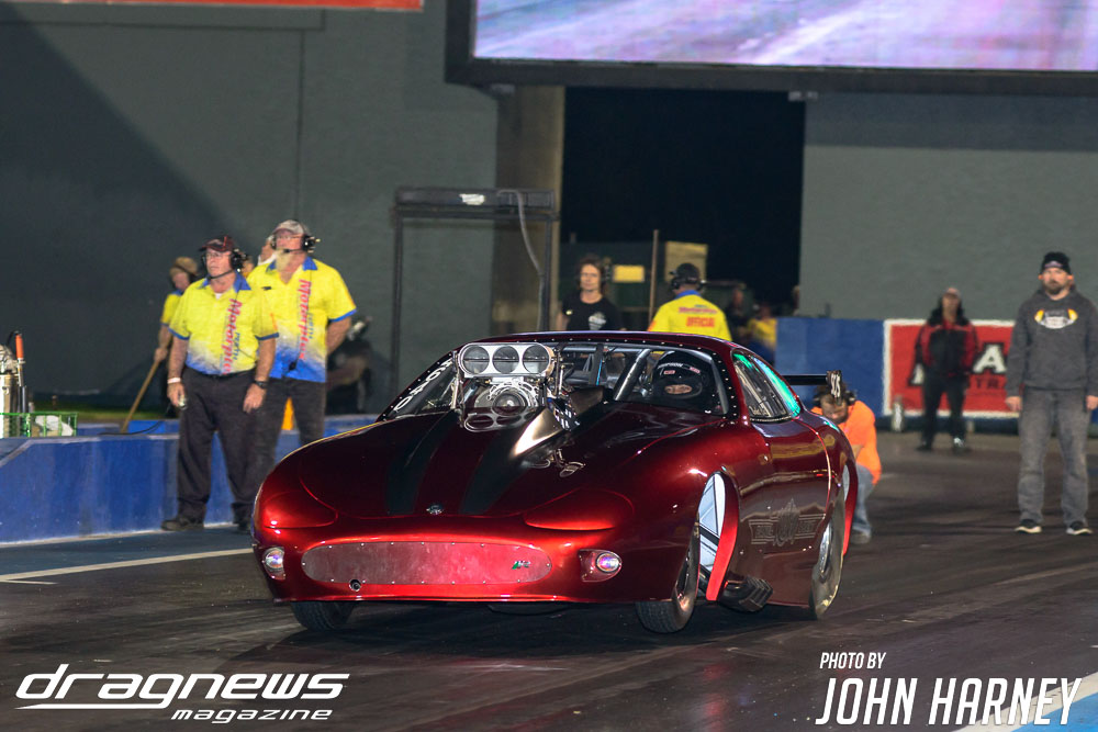 A superb final round run by Chris Roe in Top Sportsman went unneeded against Alby Bakranich, who red lit (foul started) himself out of contention by just eight thousandths of a second. Roe would have been tough to beat regardless, leaving the start line .016sec. after the green light and running a 7.851sec. time on his 7.84sec. handicap.