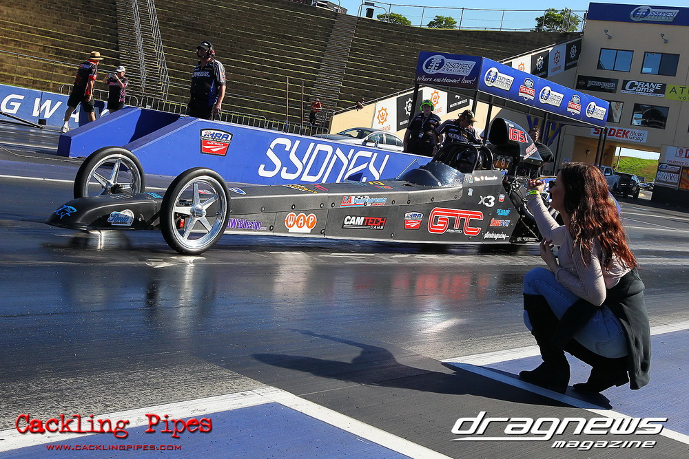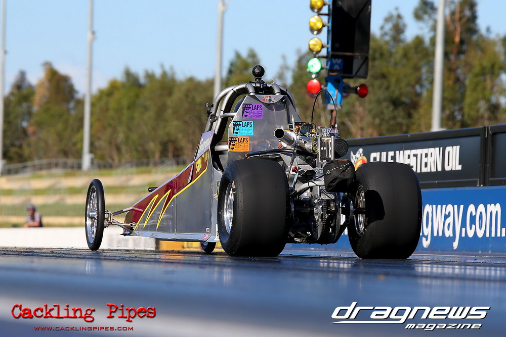 There was some Pro Series testing on hand as well, the Pro Alcohol Funny Cars of Brett White and Sainty with Alf Sciacca driving. White looked strong shutting off and still running a high five, while Sciacca suffered a fair boomer under the body on one run as they sort out the new car. It was shake city for the Pro Slammers of Brett Gillespie and Peter Blake. And Rod Barchet suffered a mammoth engine explosion on his nitrous sucking Top Bike that saw engine shrapnel and internals scattered all over the track.