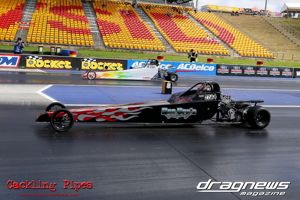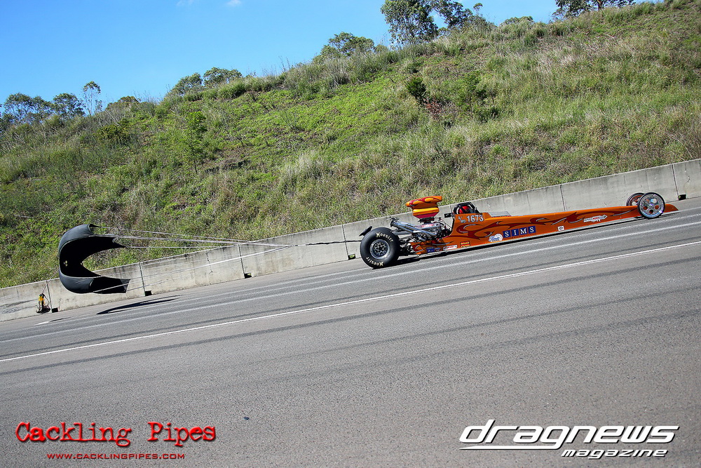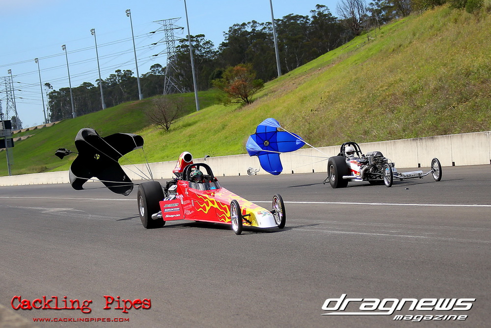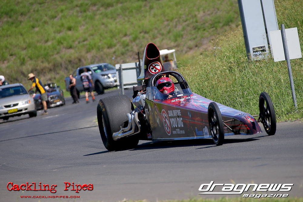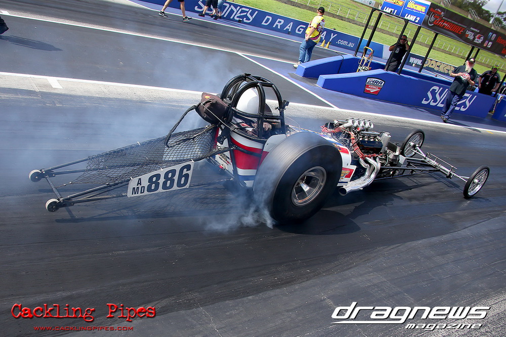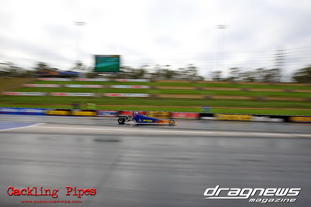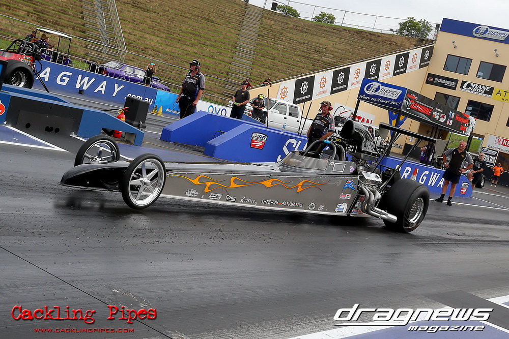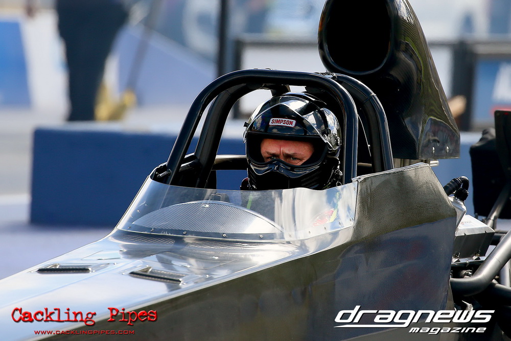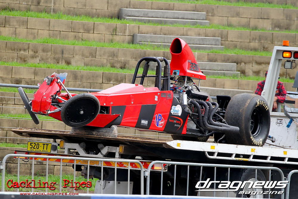 To that point the event was relatively incident free, bar Daniel Moore’s trip into the catch net which dented his freshly painted long-serving dragster.