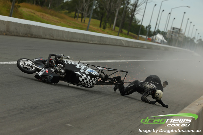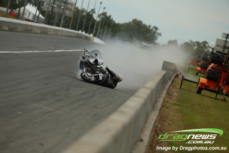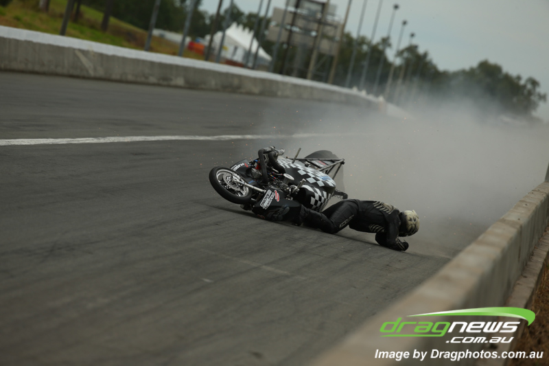 Chris ‘Bones’ Porter, above, suffered a braking area fall but avoided serious injury.