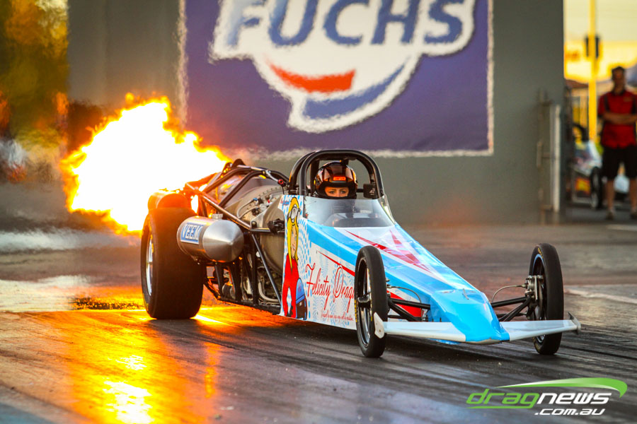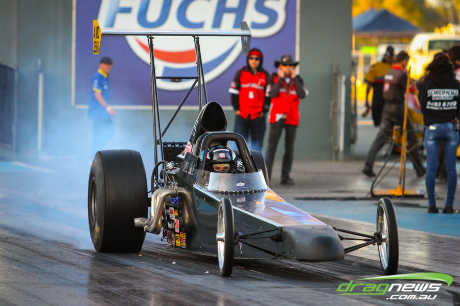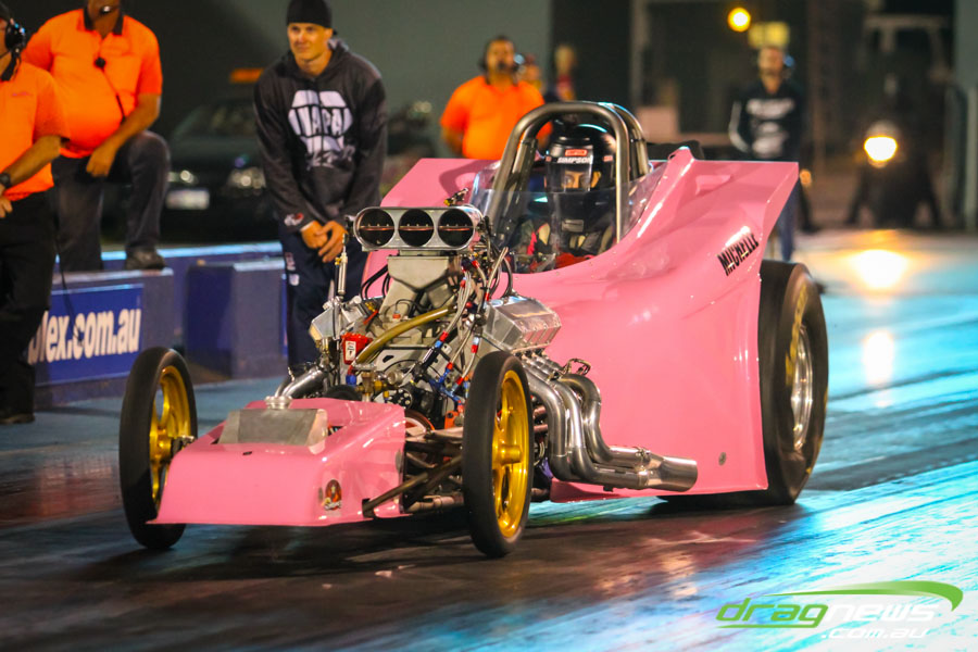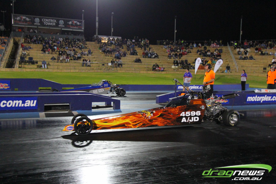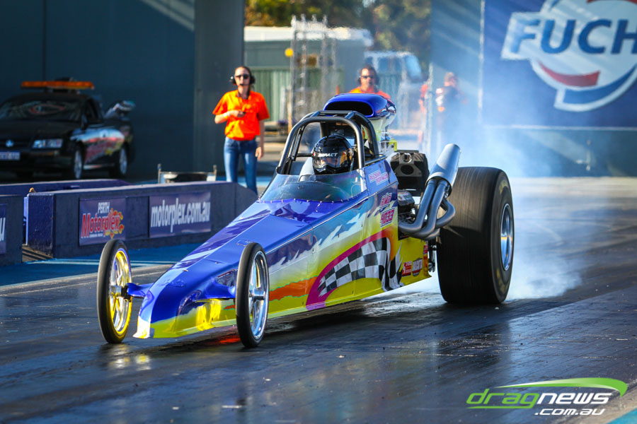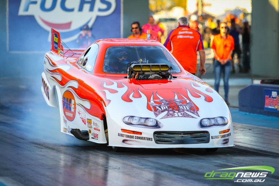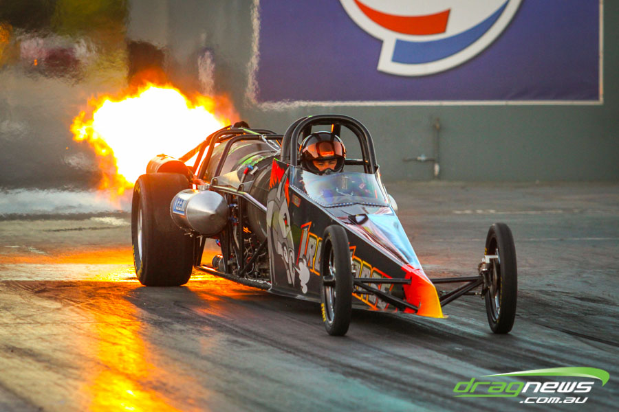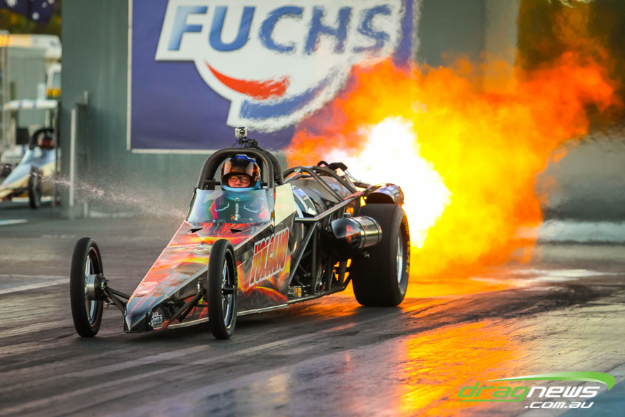 The jet dragsters were the main attraction again and did the right things in terms of the fire show. After some very serious incidents with the jet cars in recent years at Perth Motorplex, they have been slowed down somewhat to run in the high fives at about 280mph on a full pass. Chuck Haynes’ experience allowed him to make full runs, with rookie Rhiannon Allison going close to full track on two out of her three passes. Pieter De Wit was clicking off before 1000 feet on each of his passes.