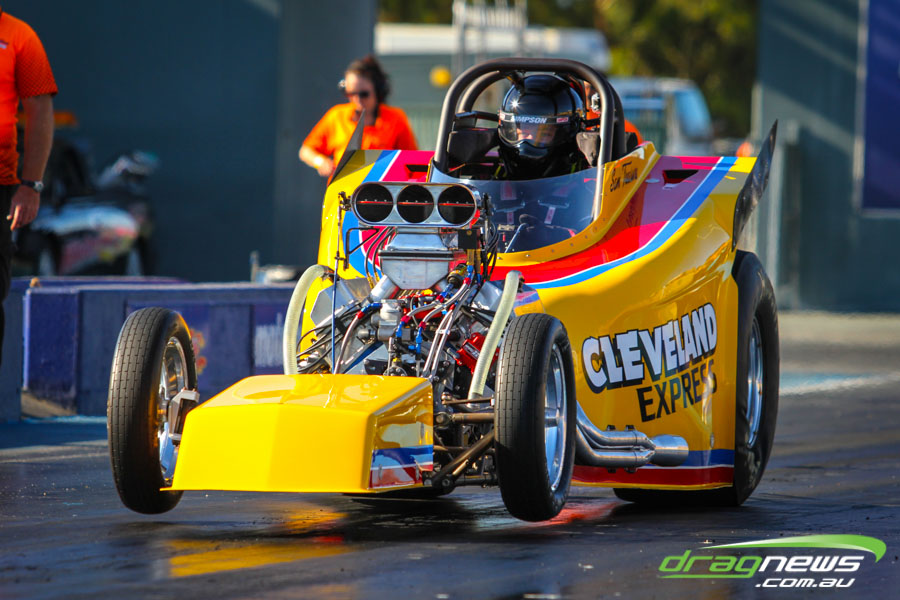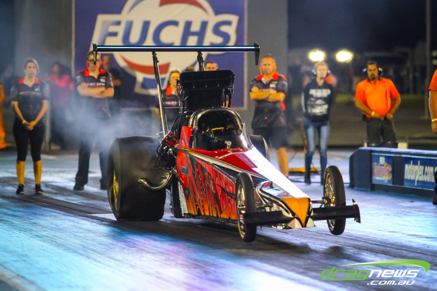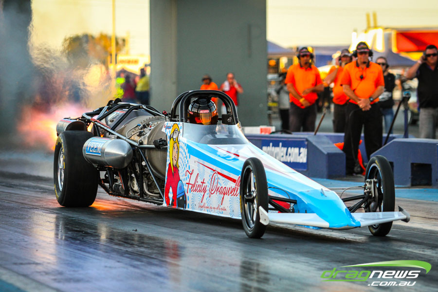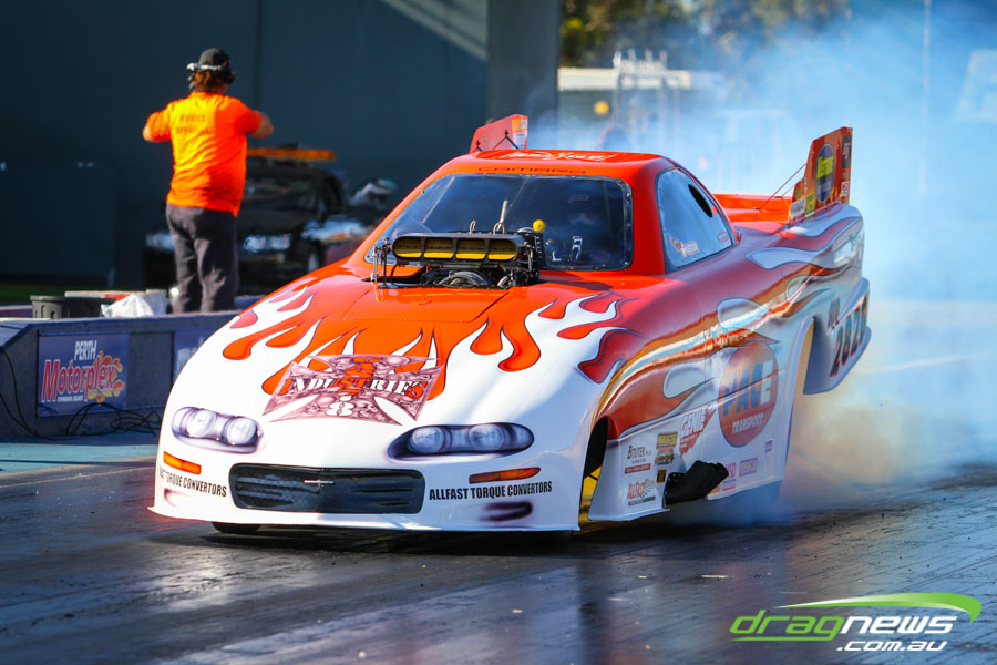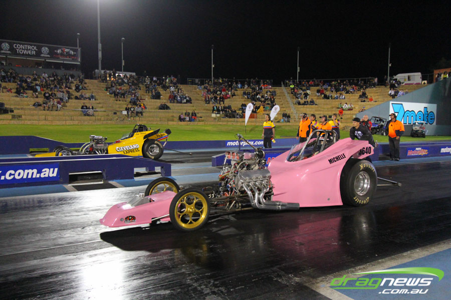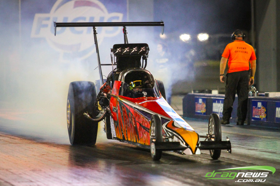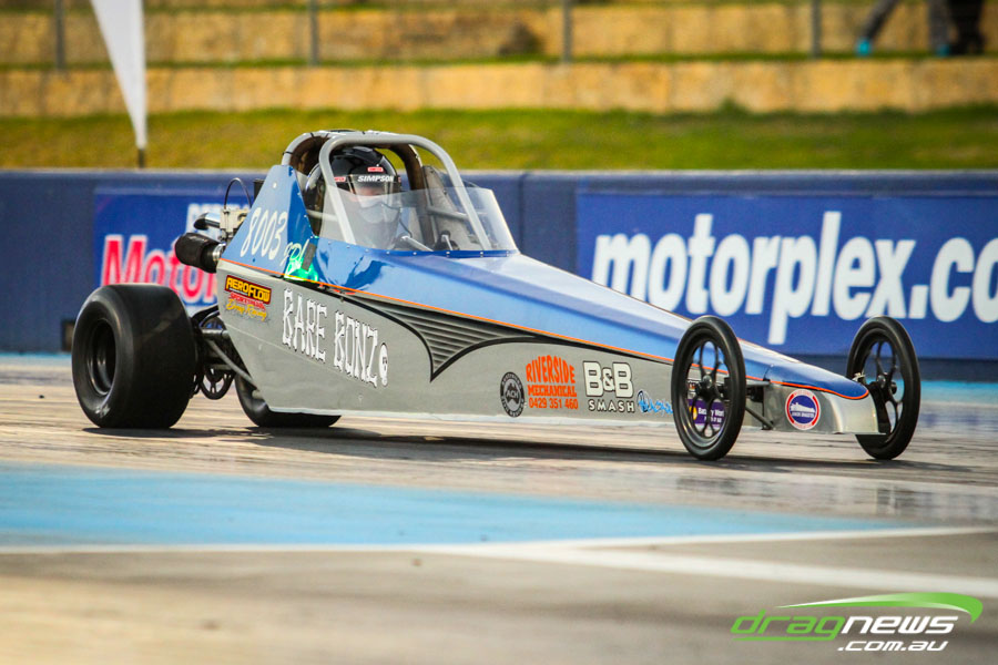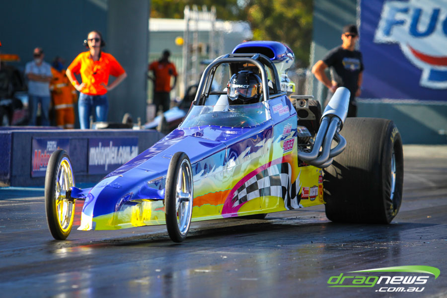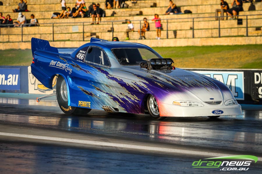 The jet dragsters were the main attraction again and did the right things in terms of the fire show. After some very serious incidents with the jet cars in recent years at Perth Motorplex, they have been slowed down somewhat to run in the high fives at about 280mph on a full pass. Chuck Haynes’ experience allowed him to make full runs, with rookie Rhiannon Allison going close to full track on two out of her three passes. Pieter De Wit was clicking off before 1000 feet on each of his passes.