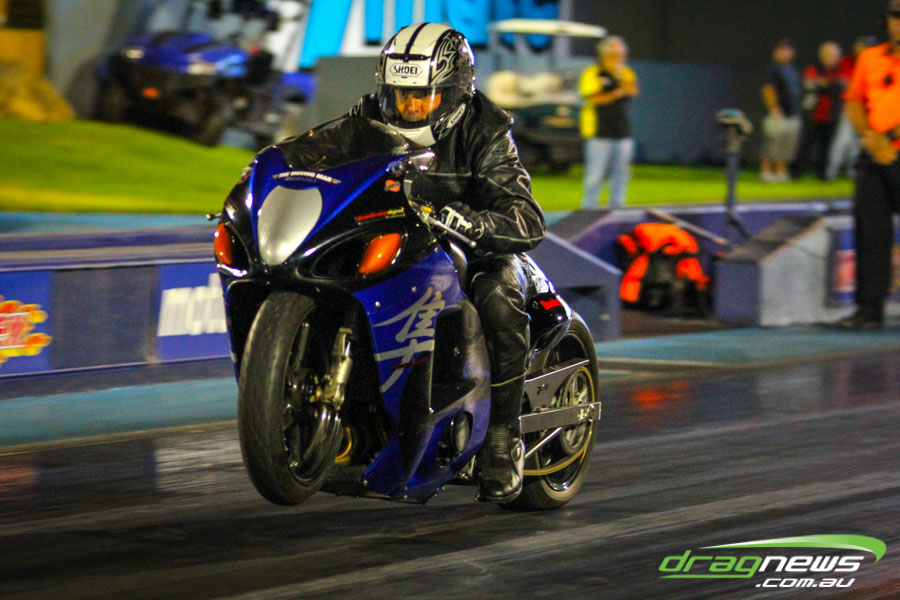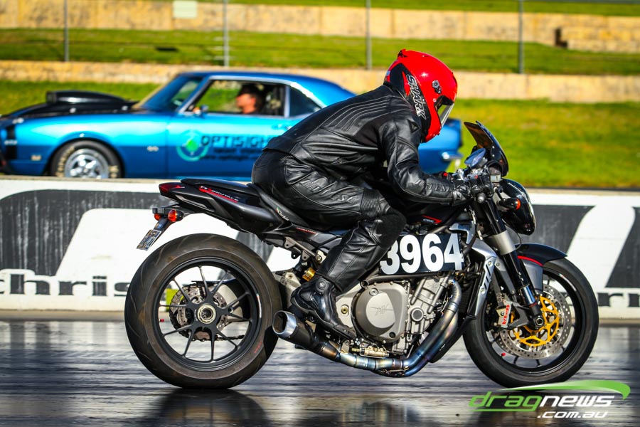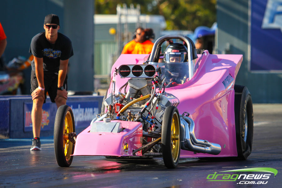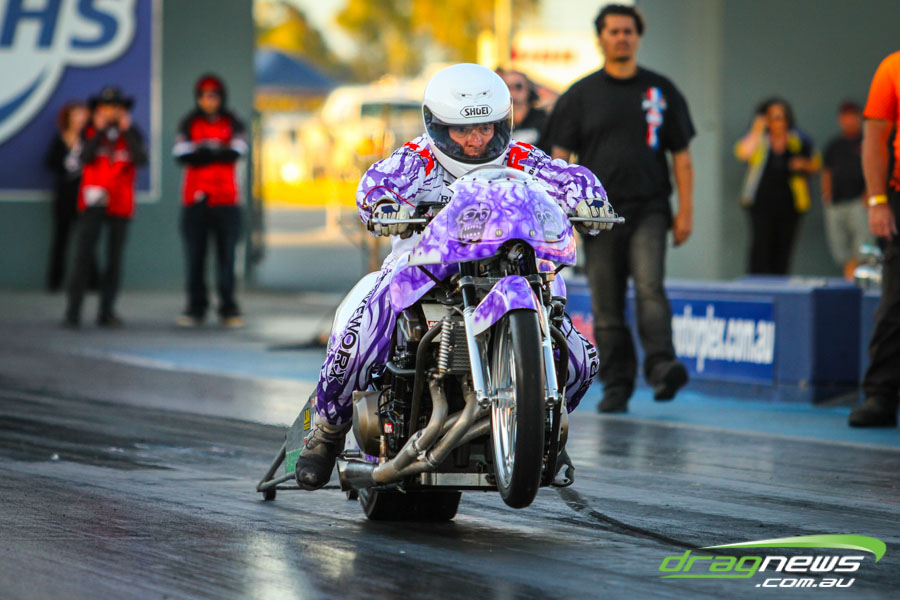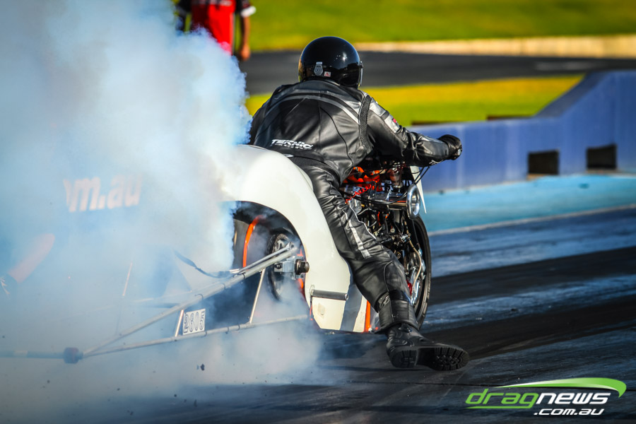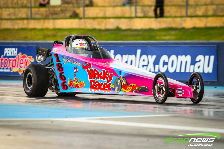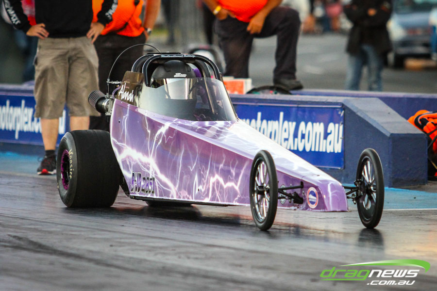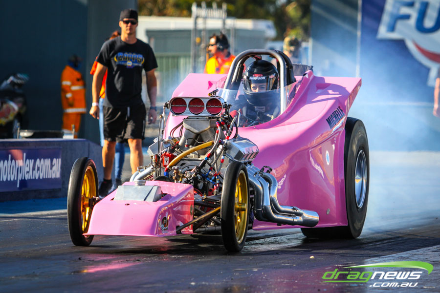 The jet dragsters were the main attraction again and did the right things in terms of the fire show. After some very serious incidents with the jet cars in recent years at Perth Motorplex, they have been slowed down somewhat to run in the high fives at about 280mph on a full pass. Chuck Haynes’ experience allowed him to make full runs, with rookie Rhiannon Allison going close to full track on two out of her three passes. Pieter De Wit was clicking off before 1000 feet on each of his passes.