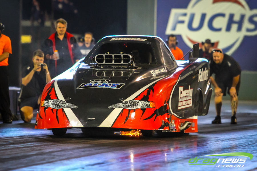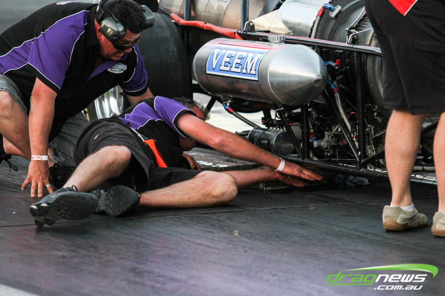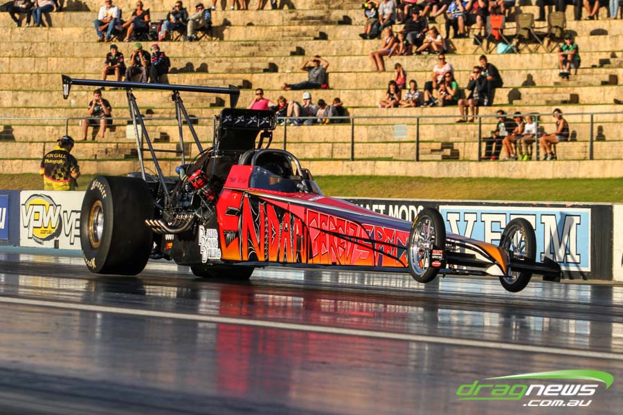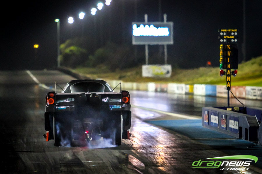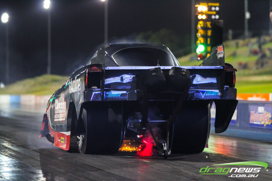 Shane Weston won Top Comp, going 5.63 and 5.65 in the cool night conditions. However on his test run at V2, tyre shake afflicted the car. Check out the way the rattle has lifted the front end of the car off the ground.