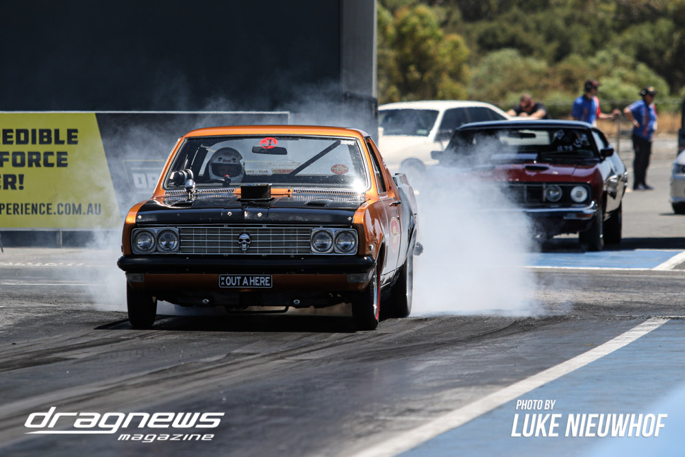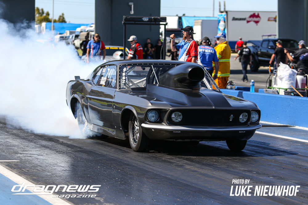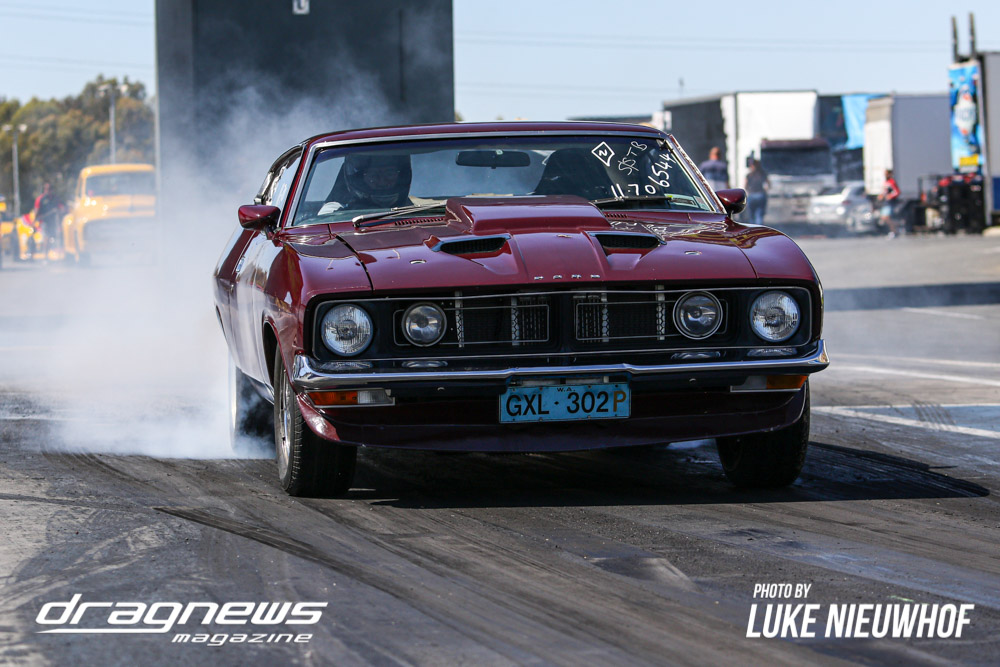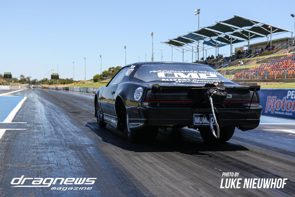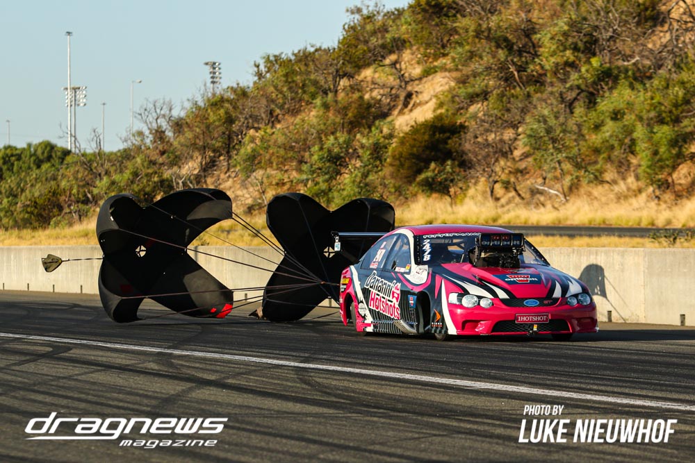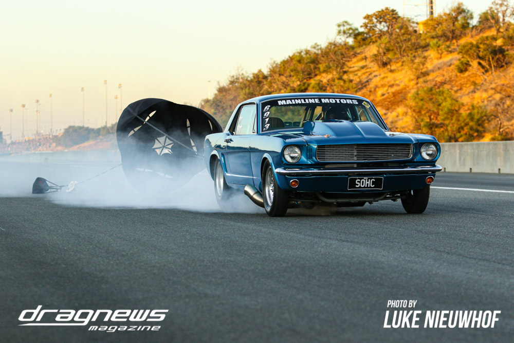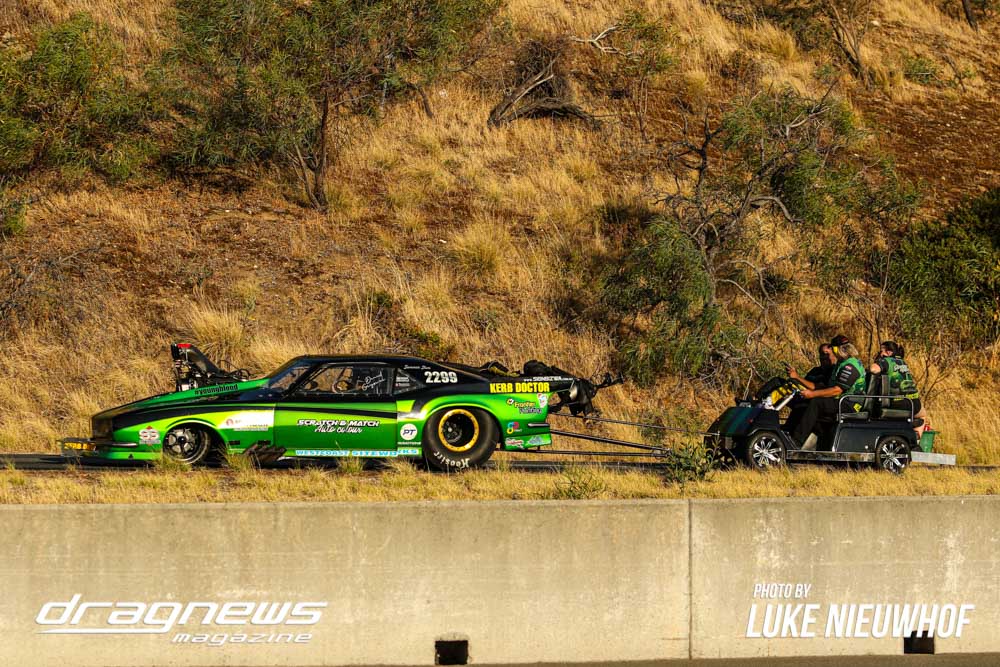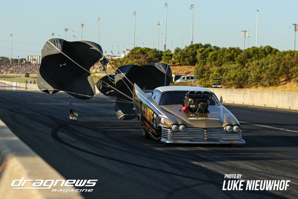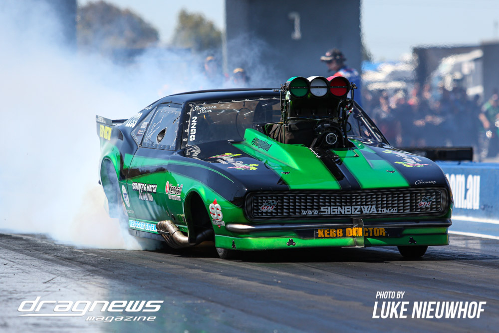 The Summer Slam proved a wild affair with three spectacular incidents during the elimination round. Kelvin Lyle had his Ford Mustang on two wheels at well over 200kmh, while Mark Chapman saved his Plymouth Fury from severe damage when he turned 180 degrees to face the start line after spinning the tyres. Not so lucky was Stuart Moresby, whose Studebaker made hard contact with the braking area walls after his parachutes failed to deploy.