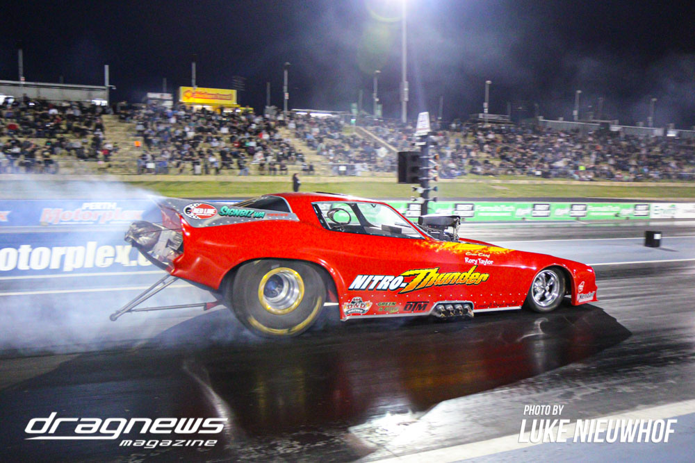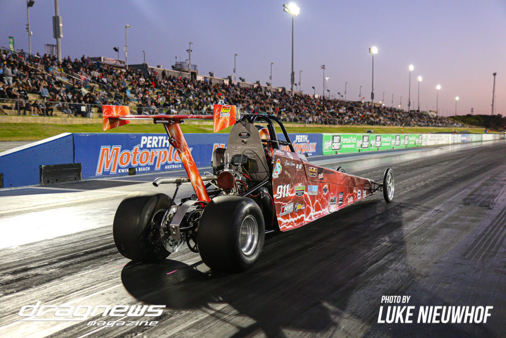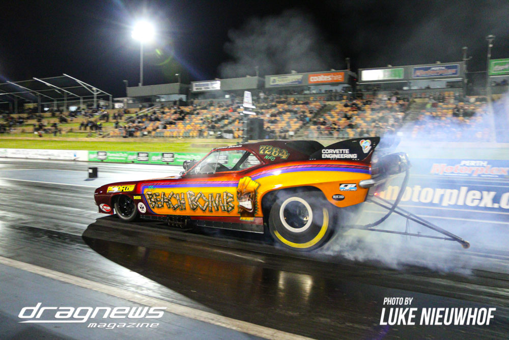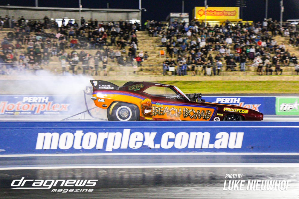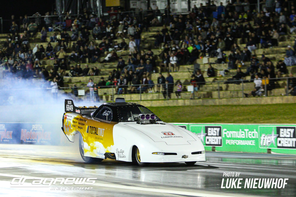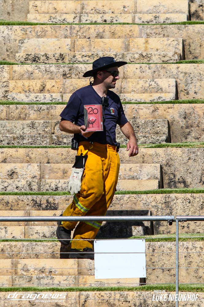 A capacity crowd turned out for the event, despite the Aeroflow Outlaw Nitro Funny Car headliners being stuck on the Nullarbor due to a highway closure caused by bush fires. With a dollar from each ticket going to the fire appeal, as well as fundraising from the local Mandogalup volunteer fire service, over $20,000 was raised during the night to go to bushfire victims and local brigades.