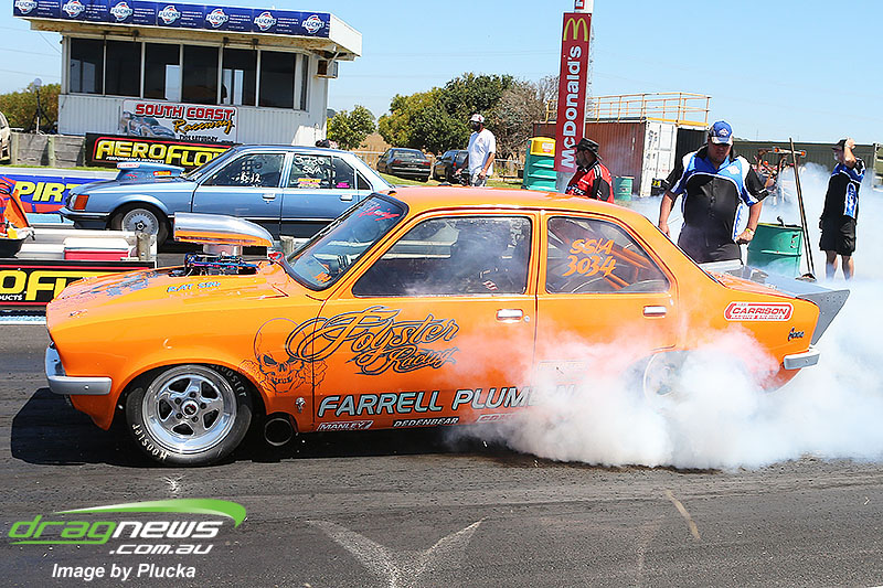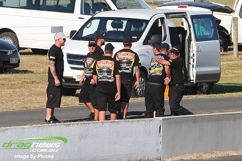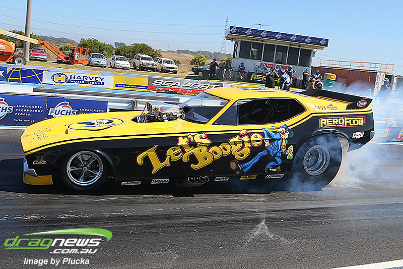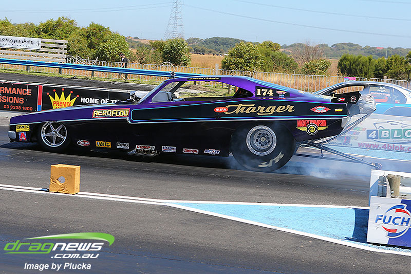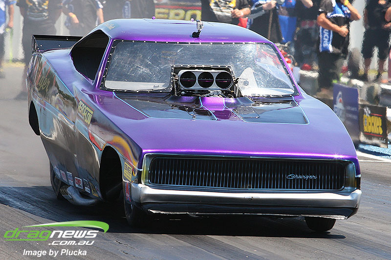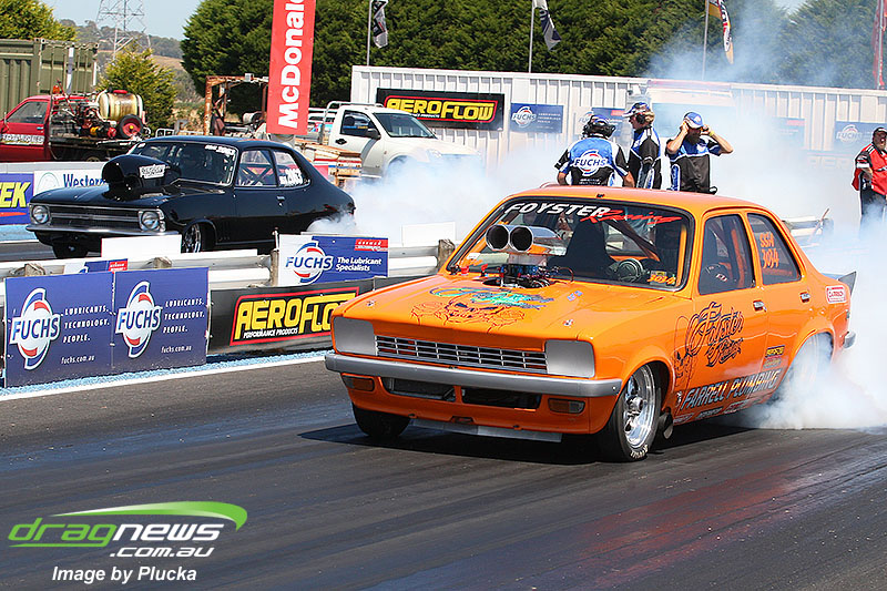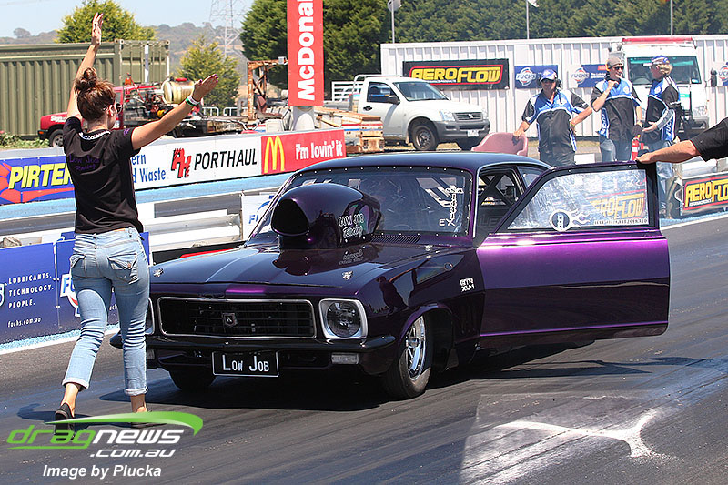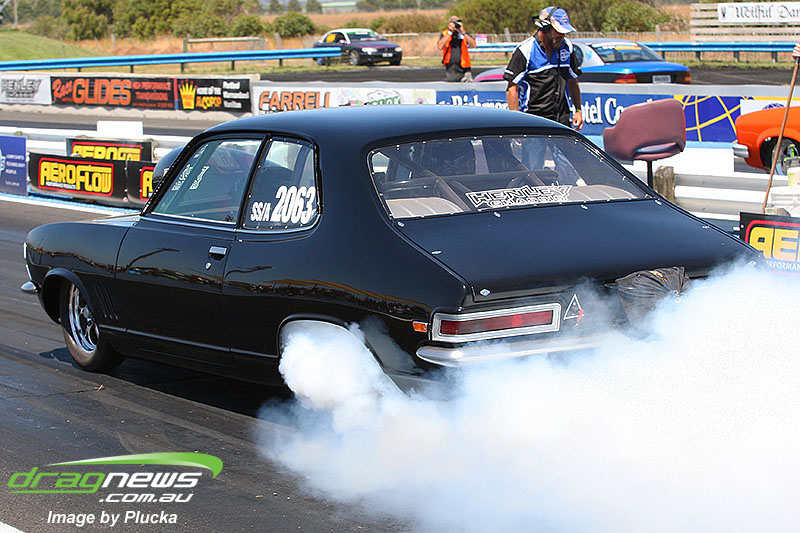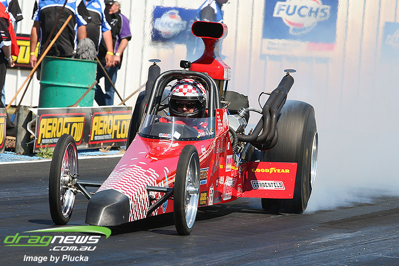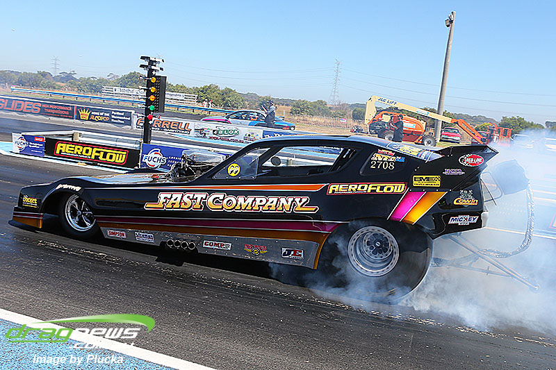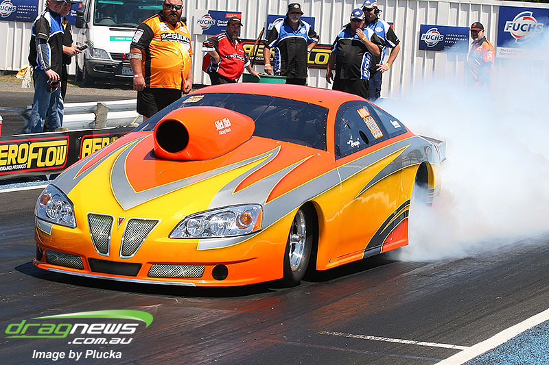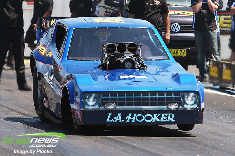 Shane Olive has been given the honours of driving the famed “LA Hooker” and won against Greg Leahy in “Harbour City Hustler” with a tyre smoking 4.84 to a 5.14. Last round winner Rick Gauci continued the fine form of “Nitro Express” with a 4.75 low ET of the round victory against Anthony Begley in “Fast Company”.