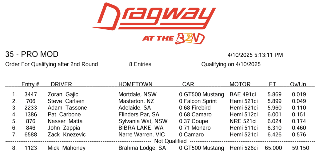 Australian doorslammer legend John Zappia made the jump into Pro Mod at this event, taking on a new challenge after years of dominance in Doorslammer. In a testing event Zappia claimed the C-Final win over young gun Zack Knezevic, who impressed in his debut outing. Championship winner Gajic wrapped up his season with a B-Final win over Nasser Matta, the result elevating Matta to second in the overall championship standings.