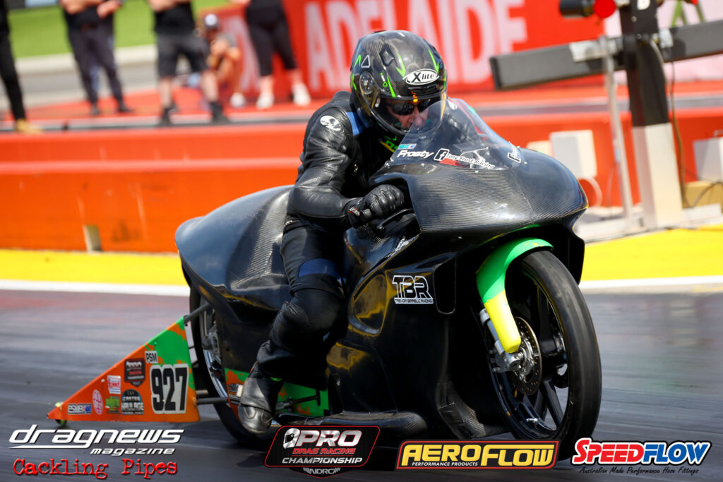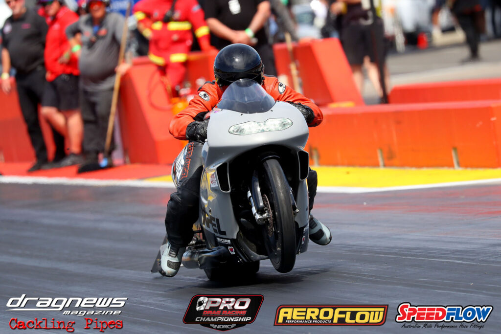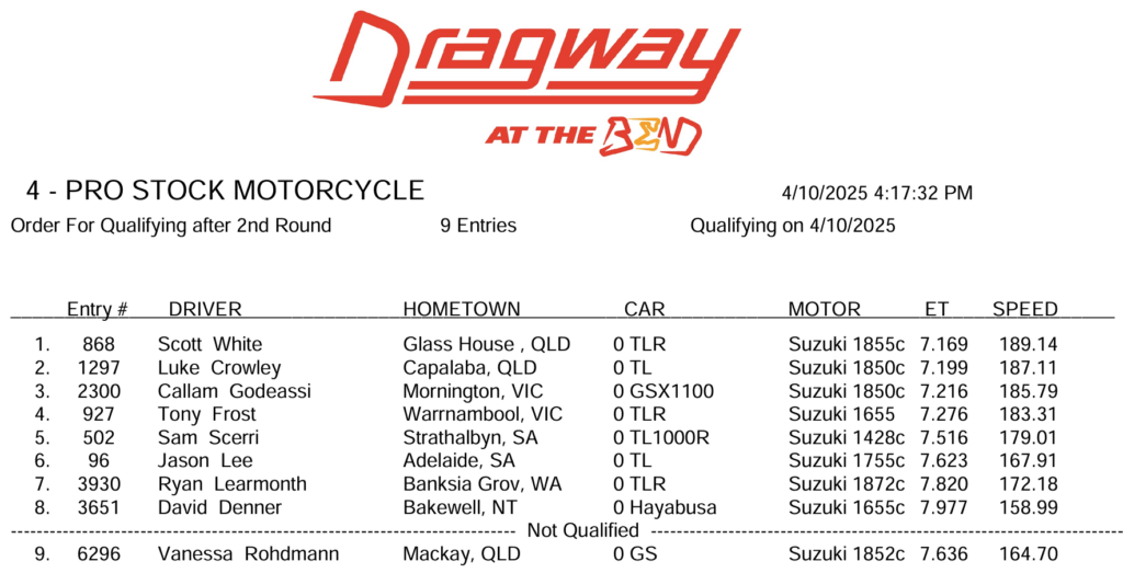 Northern Territory racer Scott White showed up everyone in qualifying with a 7.169 to claim the top spot, but his campaign ended early after a crosswind pushed his Suzuki across the centre line in round two against Crowley. That opened the door for Ryan Learmonth, who made the long haul from Western Australia, and Tony Frost, who battled through to the A-Final.