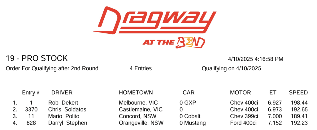 The PDRC Grand Final ran alongside a Top Fuel exhibition that delivered jaw-dropping performances, including Damien Harris setting a new Australian Top Fuel speed record at 333.51 mph (536.84 kph). Adding to the spectacle, John Ricca smashed his own Outlaw Pro Mod record with a 5.406-second run at 270.94 mph (436.03 kph) — the quickest and fastest by any blown sedan in Australia.