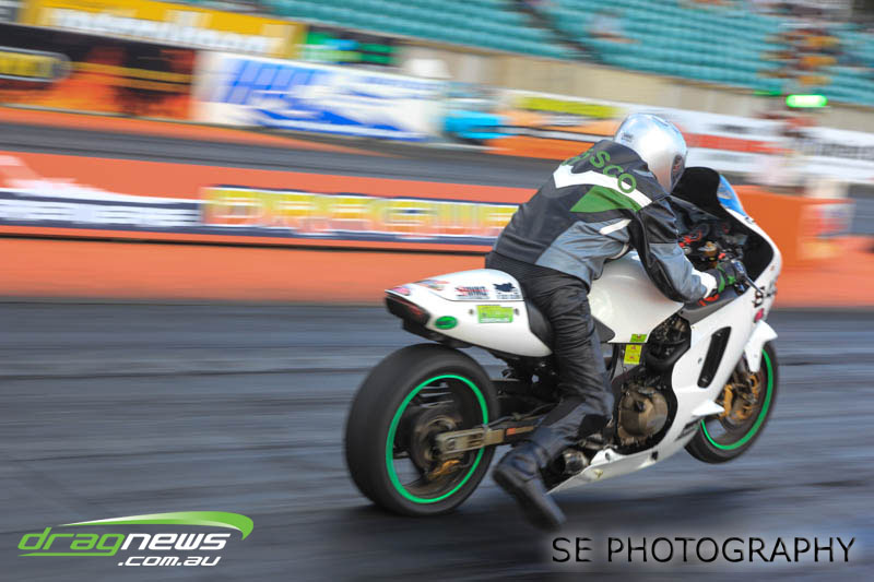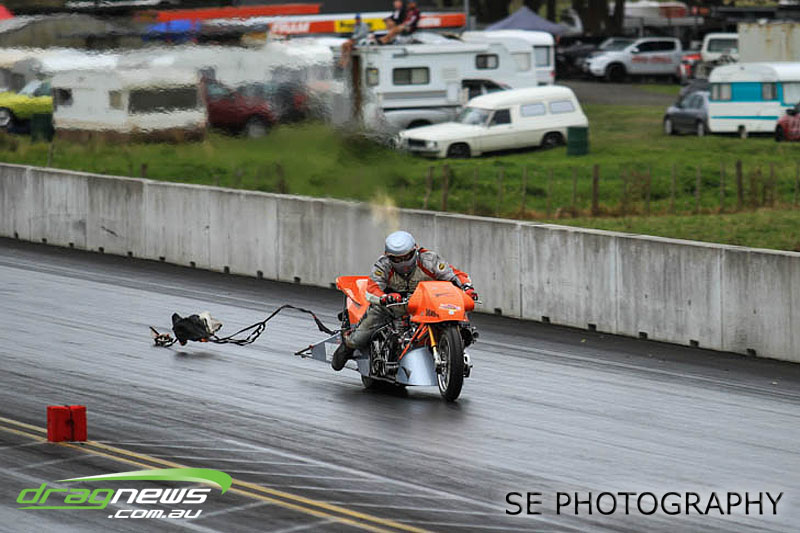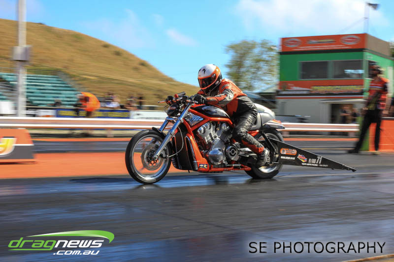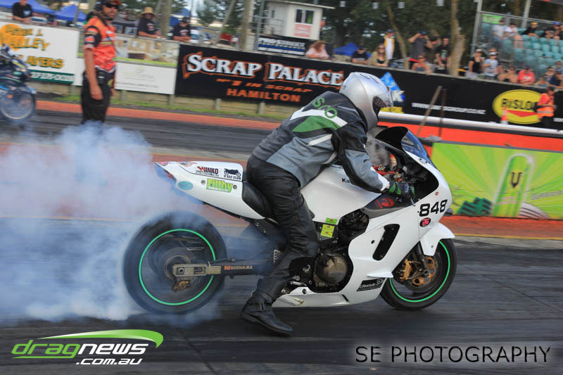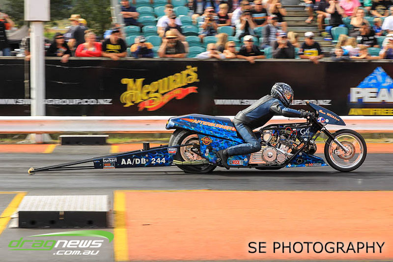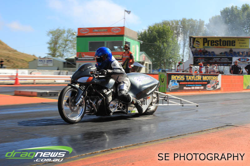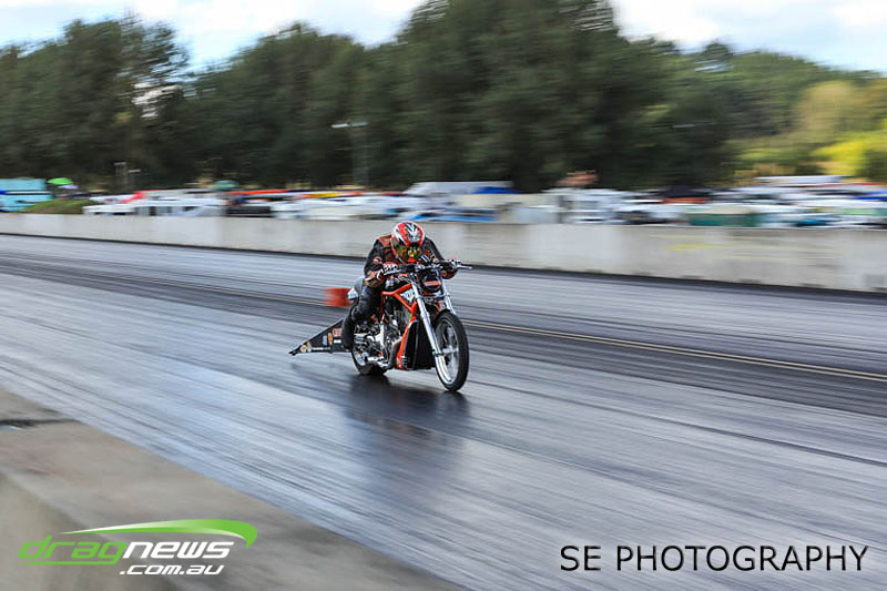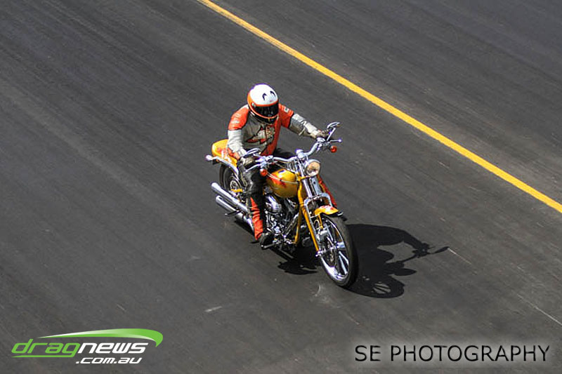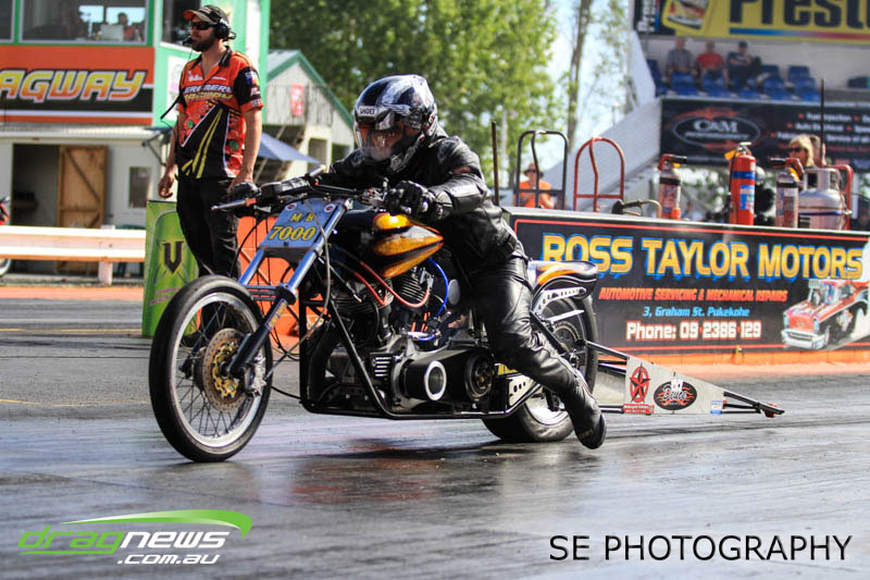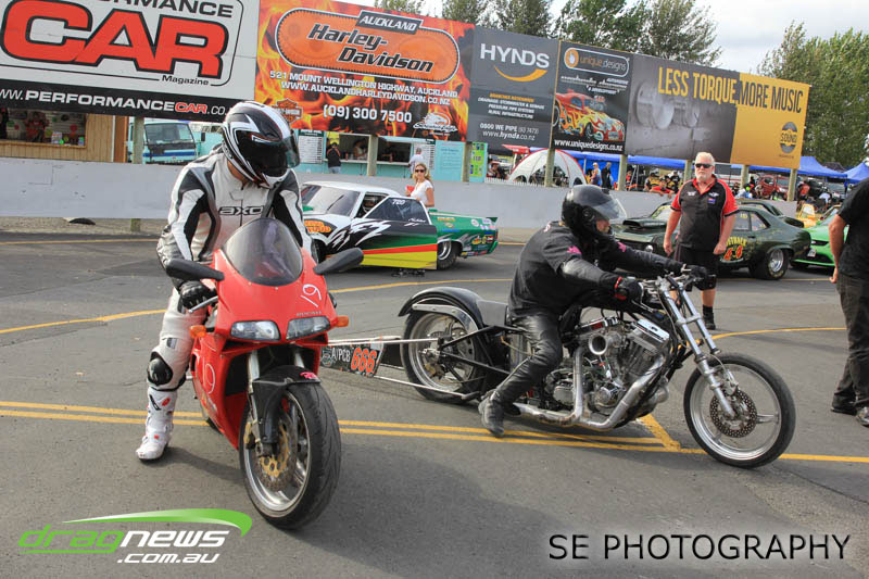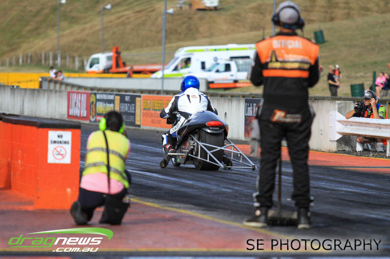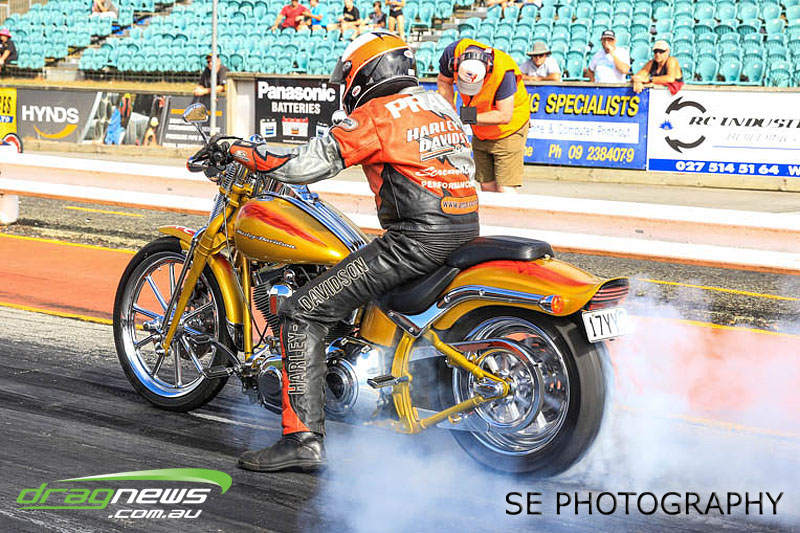 Auckland Harley Davidson is responsible for the resurgence of the Screamin’ Eagle class which saw an all Buell final between Geoff Bond and Jim Wells. Geoff Bond took victory this time round with a 10.990 on an 11.00 dial in over Jim “Flea” Wells who broke out running an 11.930 on a 12.00 dial in. That’s the beauty of finals racing.
