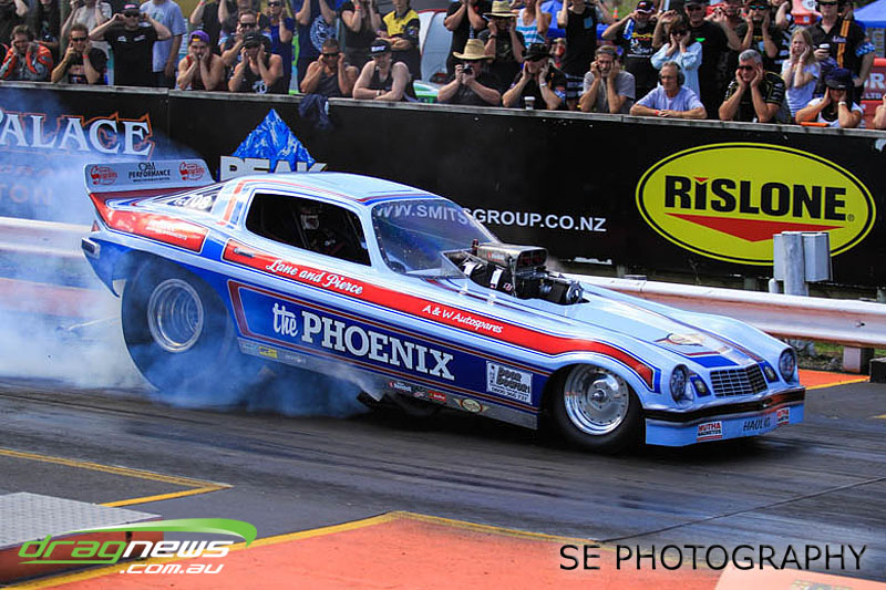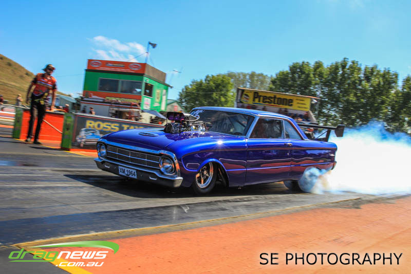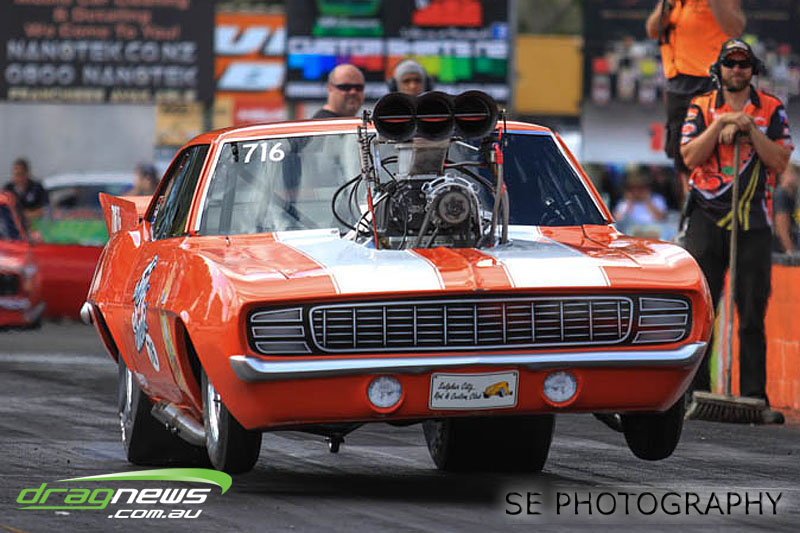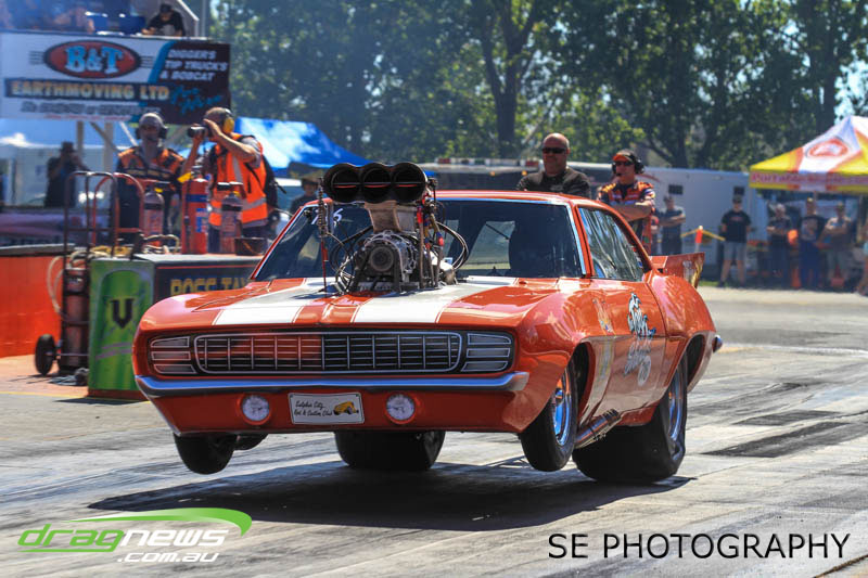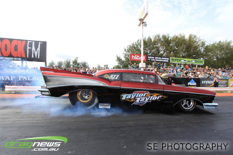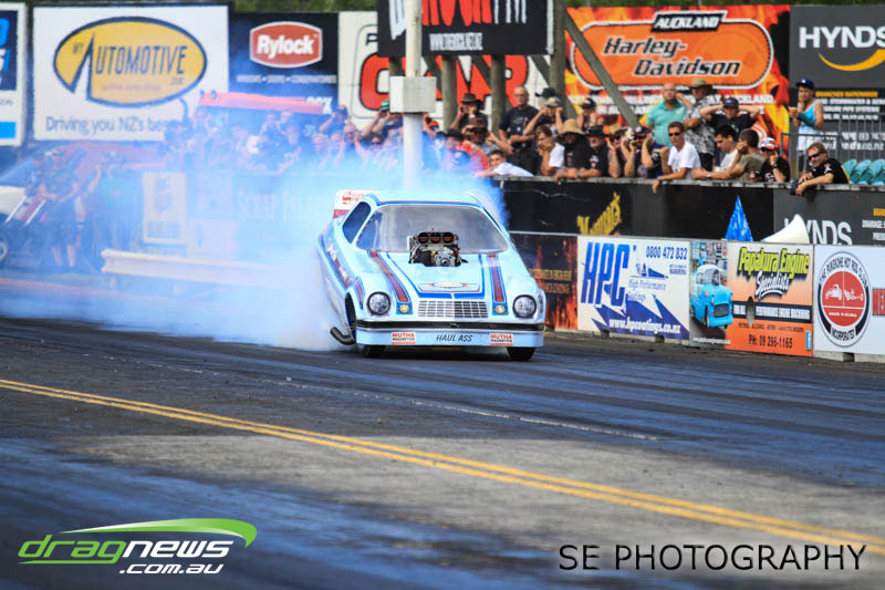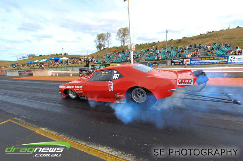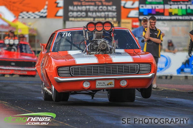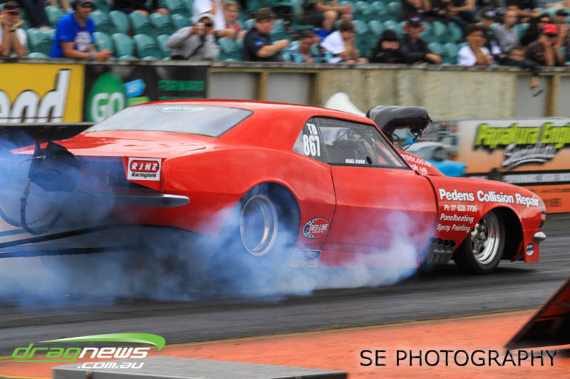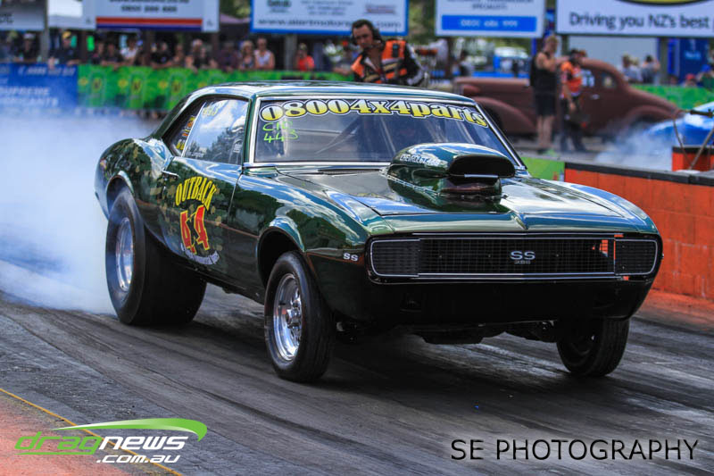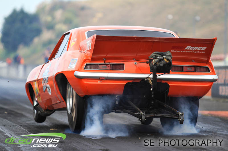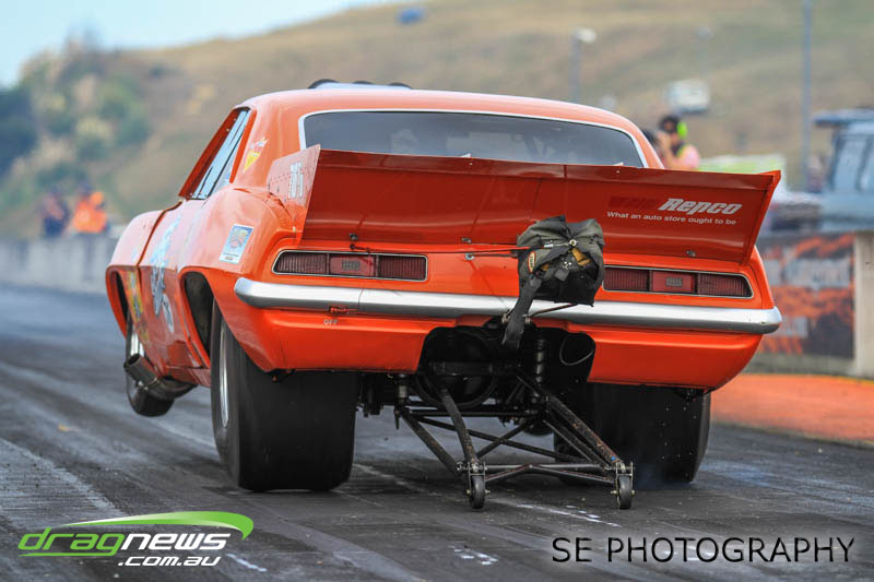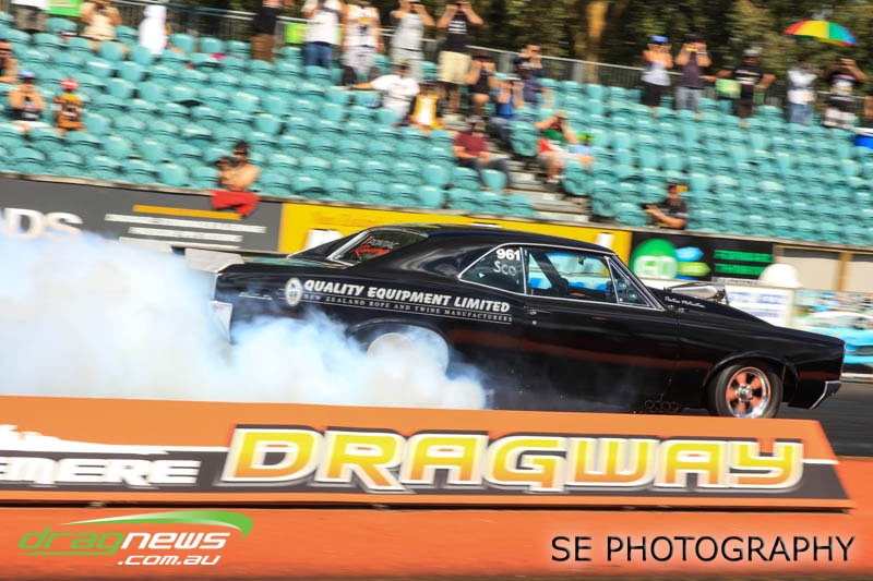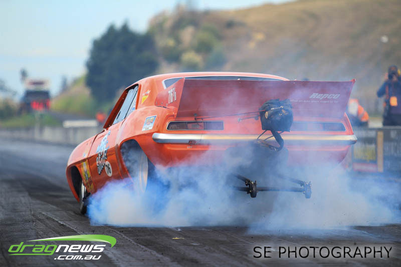 The battle of the P&I Pascoes Ltd Top Doorslammers has never failed to impress and this year would be no different. Trevor Smith in his Holden Statesmen continued his march deep into the sixes running a personal best time of 6.509 @ 216.51mph to qualify second behind Mark Bardsley in his 1968 Camaro with a 6.441 @ 223.10mph. But it was qualifier number 3 and 4 – Rod Benjes in his Chev Beretta and Ross Taylor in his Chev Sports Coupe – that battled out the final come Sunday afternoon. Rod Benjes took the finals win by 0.013 seconds running a 6.638 @ 207.53mph over Ross Taylor’s scenic route 6.651 @ 215.17mph. Consolation for Ross Taylor – rumoured to be stepping out of driving duties to make room for current crew chief and son Jason Taylor – is he tied up the IHRA NZ National Series with that finals appearance. Nigel Dixon in his 1968 Camaro also took consolation with a well earned 7.136 @ 193.02mph personal best and Gary Benham taking his personal best deep into the sevens with a 7.675 @ 169.30mph.