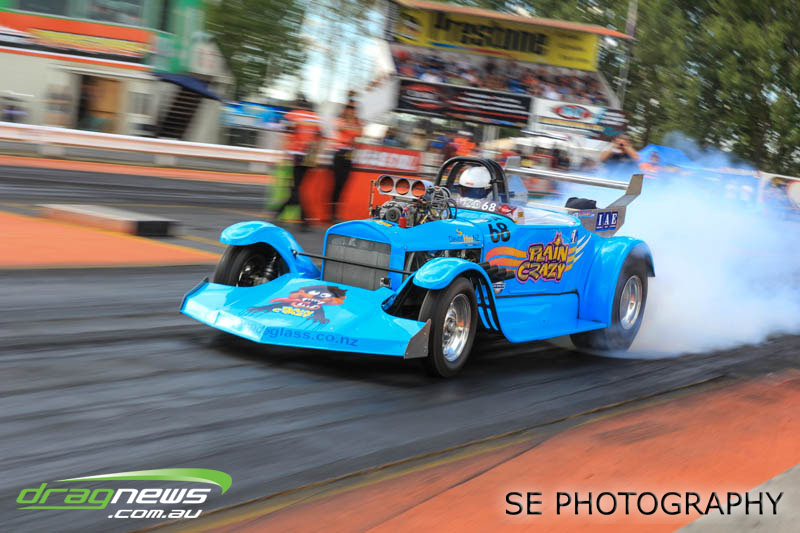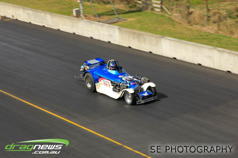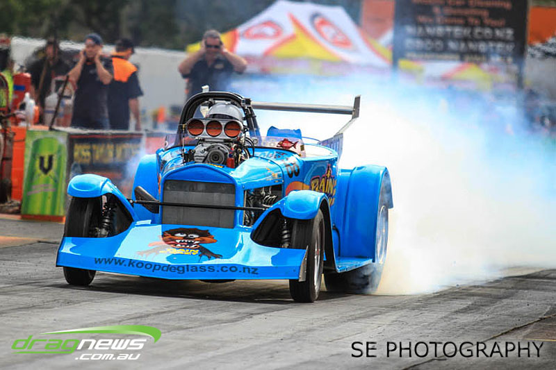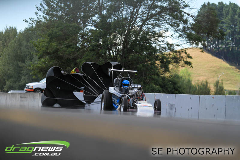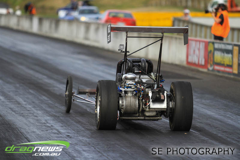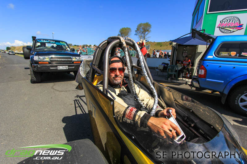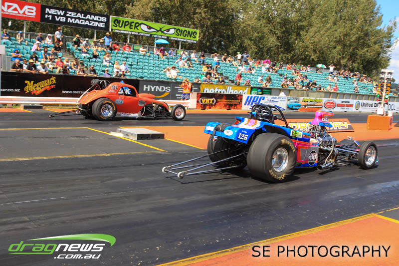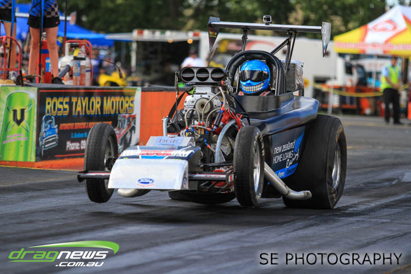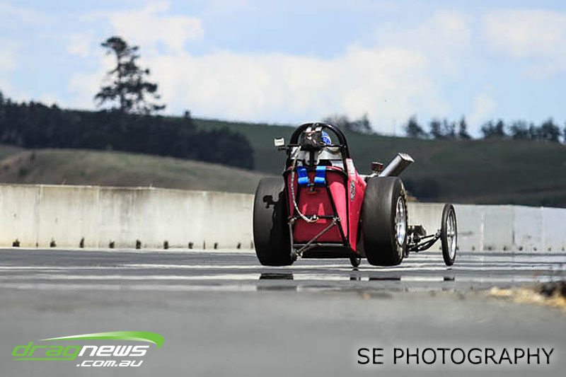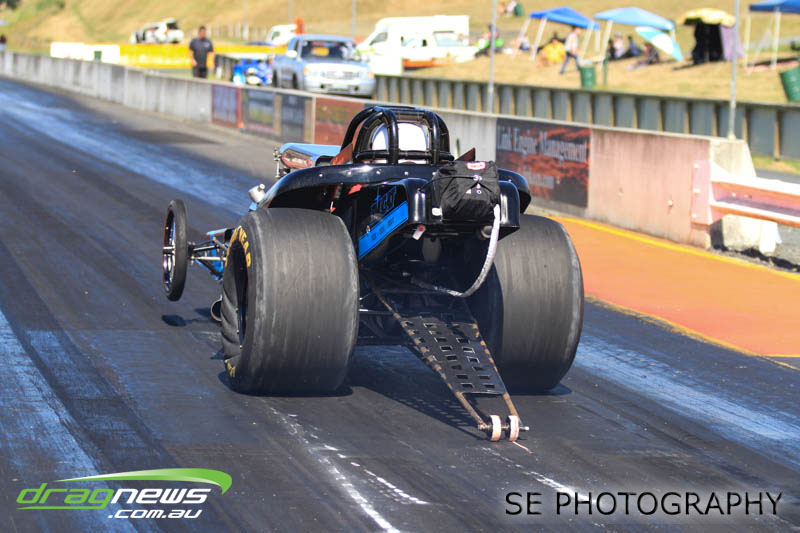 First season racer Boms “Bomber” Jamieson from Cambridge won his first meeting in the Segedins Auto Spares Modified division when it counted in taking out the Nationals title with a 9.481 @ 133.49mph. The road to the finals was littered with some experienced racers in the form of current Modified points leader Neville Smith followed by a final against veteran and regular podium visitor Trevor Watson in his Peugeot dragster but Bomber was on song for his first competition win.