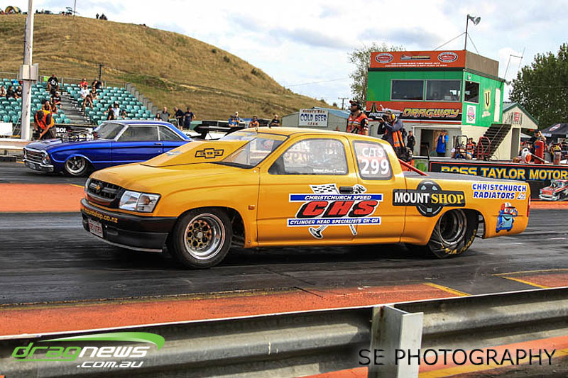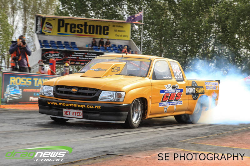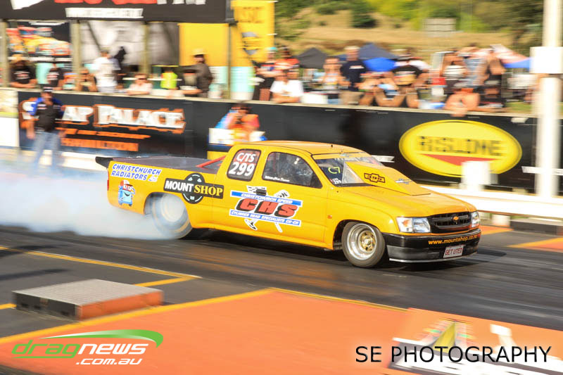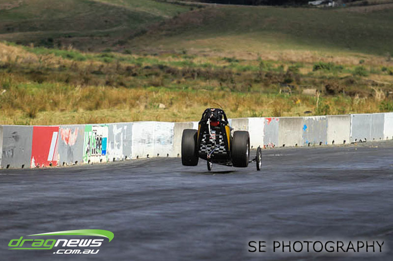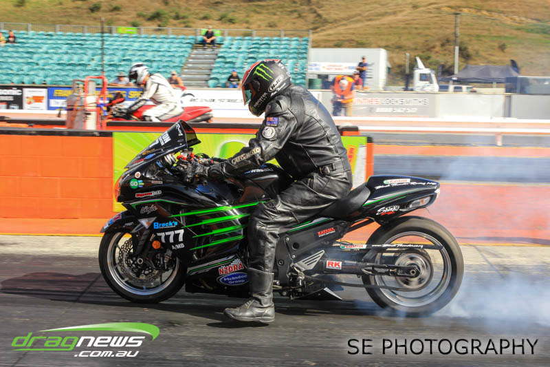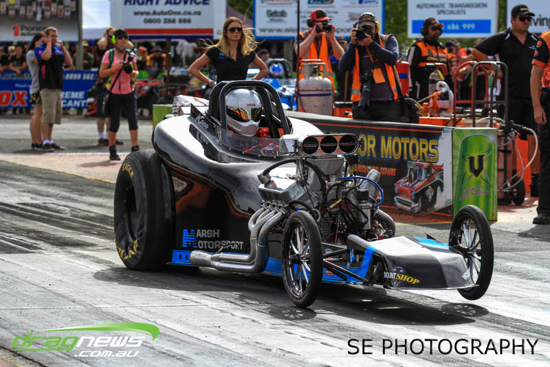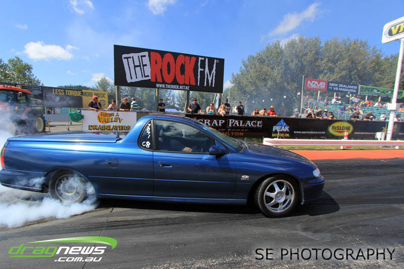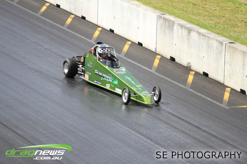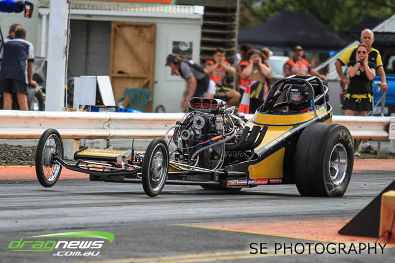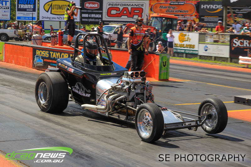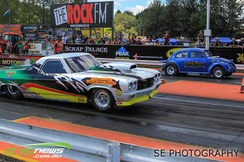 First season racer Boms “Bomber” Jamieson from Cambridge won his first meeting in the Segedins Auto Spares Modified division when it counted in taking out the Nationals title with a 9.481 @ 133.49mph. The road to the finals was littered with some experienced racers in the form of current Modified points leader Neville Smith followed by a final against veteran and regular podium visitor Trevor Watson in his Peugeot dragster but Bomber was on song for his first competition win.