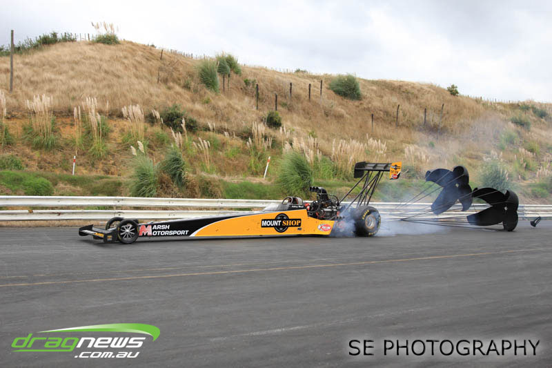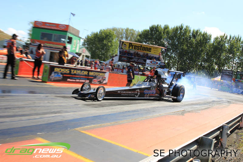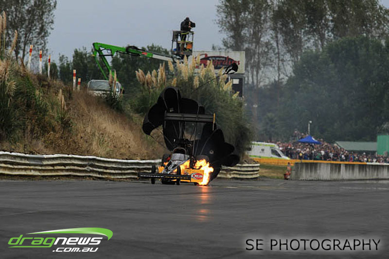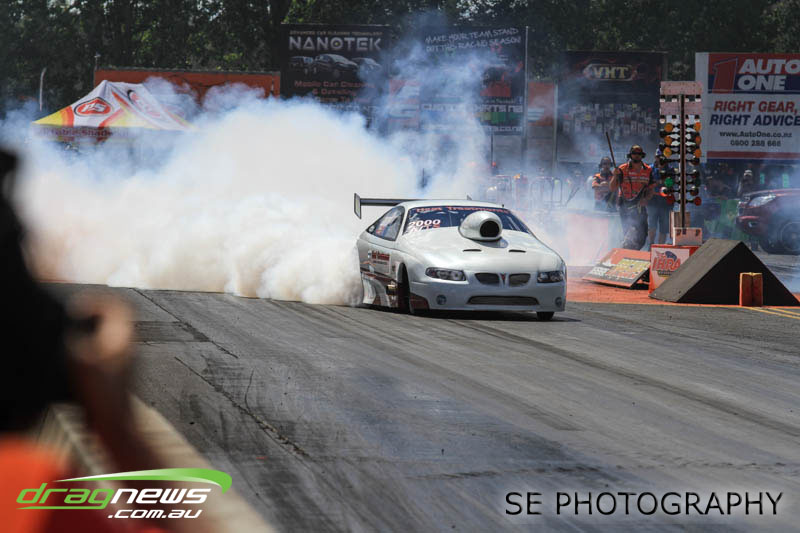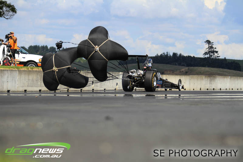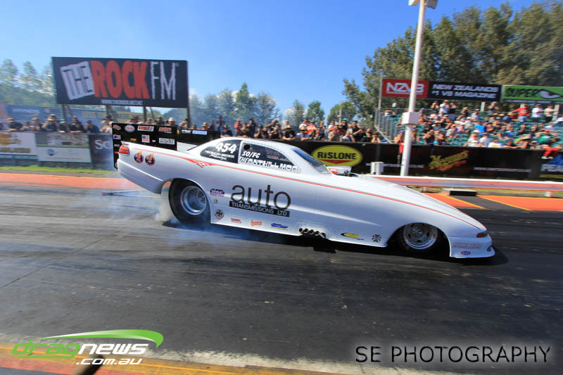 It’s hard to know where to start with performances, so we’ll start at the top. Per capita (if we can apply such a thing to drag racing), the BurgerFuel® Top Alcohol class would have to have been the best performing class with both Shane Lodge and Chris Johnston running under the national record twice…each. Chris Johnston posted a 5.632 @ 254.90mph and a 5.653 @ 250.23mph in eliminations on his way to claiming his ninth, yes ninth NZ Nationals title. Johnston had to settle for claiming just the MPH record as Shane Lodge thundered through with some impressive power wheelstands just past the 60” mark to post a 5.516 @ 252.95 in qualifying. Lodge backed up Saturday’s performance with a 5.537 @ 249.63mph in eliminations racing on Sunday to take runner up position and the Top Alcohol E.T. record.