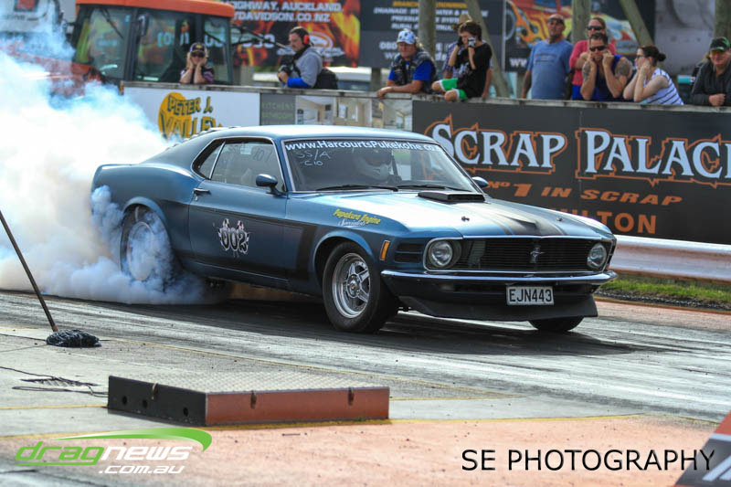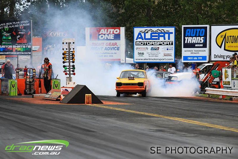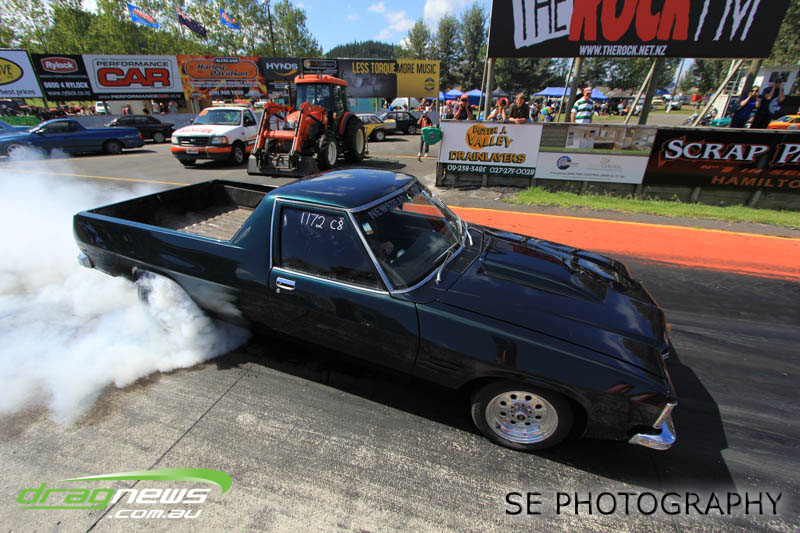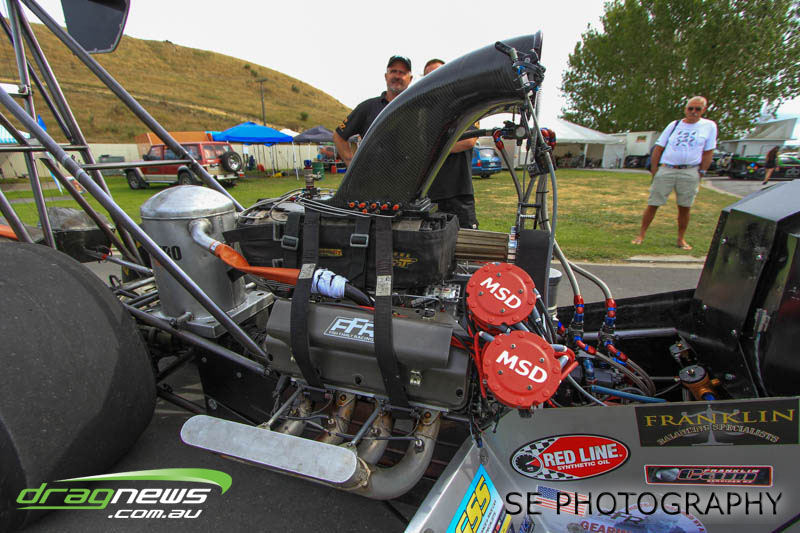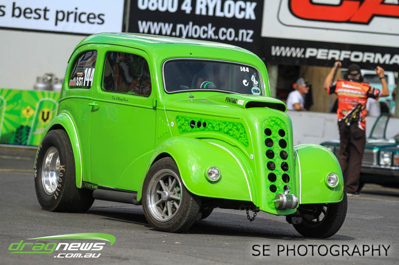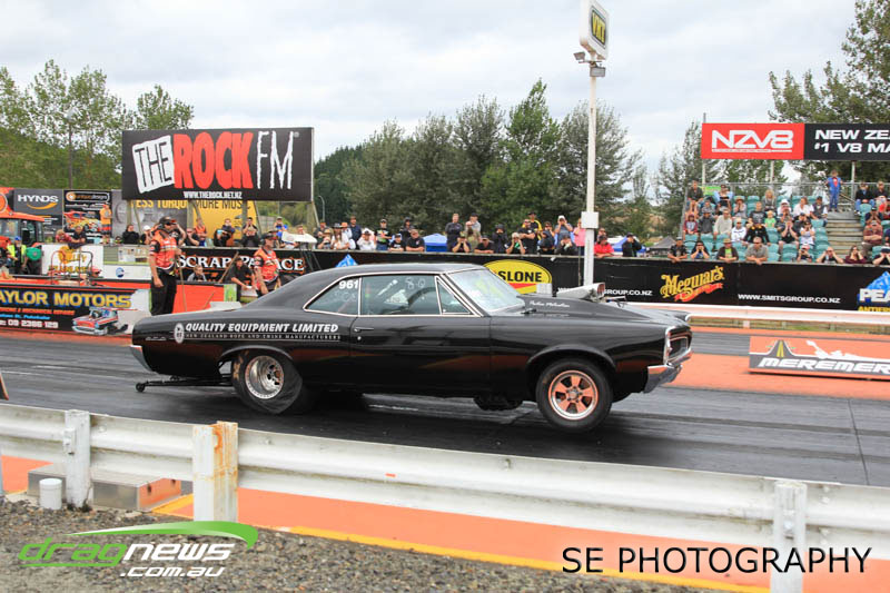 Franklin Long Roofing Supercharged Outlaws is our melting pot of racers from all around New Zealand. It hosted the Hartley’s from Lower Hutt, Christison from Wellington, Richard McCarthy from New Plymouth, the Minchingtons from Christchurch and eventual winner Craig Griffiths from Motueka with a smattering of local Auckland/Waikato based racers Aaron Lelean, Dave Mason, Darren Hays and Michael Franklin. The Minchingtons were leading the points score series coming in to this event but issues with the transmission at the end of qualifying put paid to their third straight championship chase. Those honours now belong to Graham Christison despite losing the semi-final to relative newbie Michael Franklin in his immaculately prepared Pontiac GTO. Aaron Lelean of AI Exhausts Racing was knocked out in the quarterfinals but couldn’t stop grinning after posting another 6second pass for a PB of 6.924.