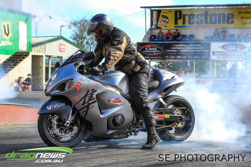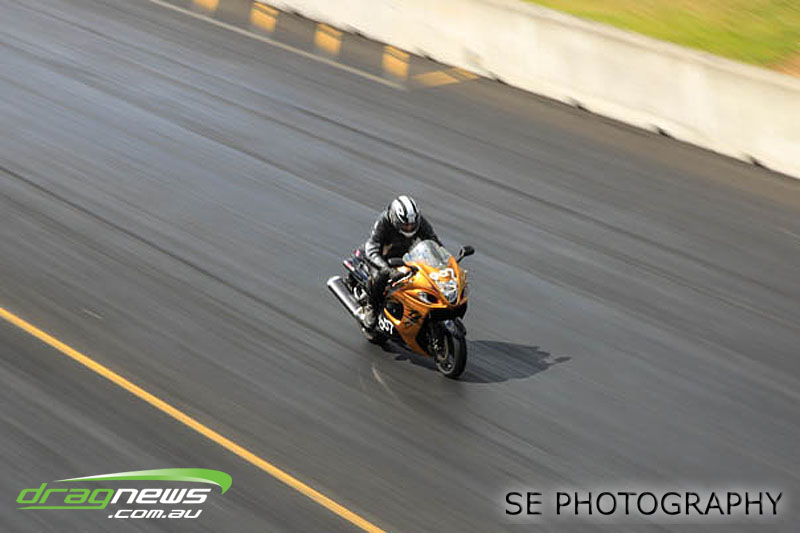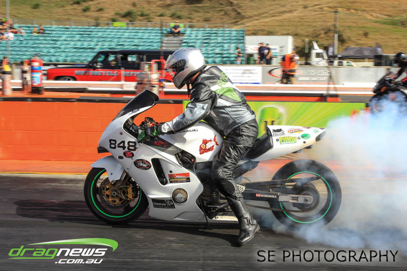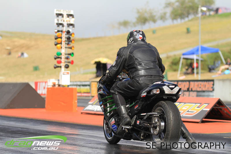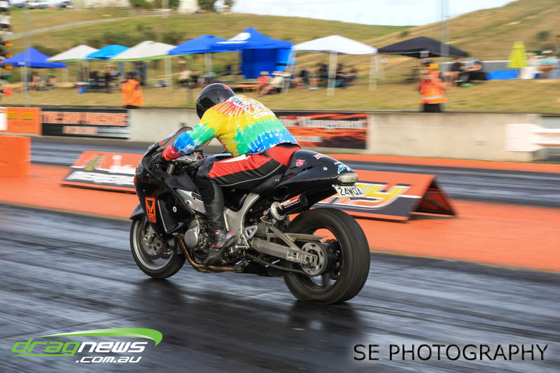 Bill Hamilton on his Hayabusa sewed up his fourth Auckland Harley Davidson Competition Bike meeting win in a row coming from 5th qualifying position to snatch the Nationals from Ian Hilder on his aptly named “Rice Rocket II” Suzuki GSAX. Both men claimed national records (Hamilton AA/AB E.T. record 8.090 and Ian Hilder A/DB E.T. record 7.810) on their trek to the finals alongside Ian Wilkins who despite dropping out in round 1 did enough to reset the AA/DB MPH record to 182.35mph.