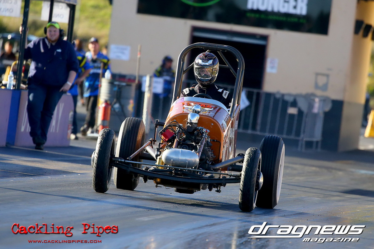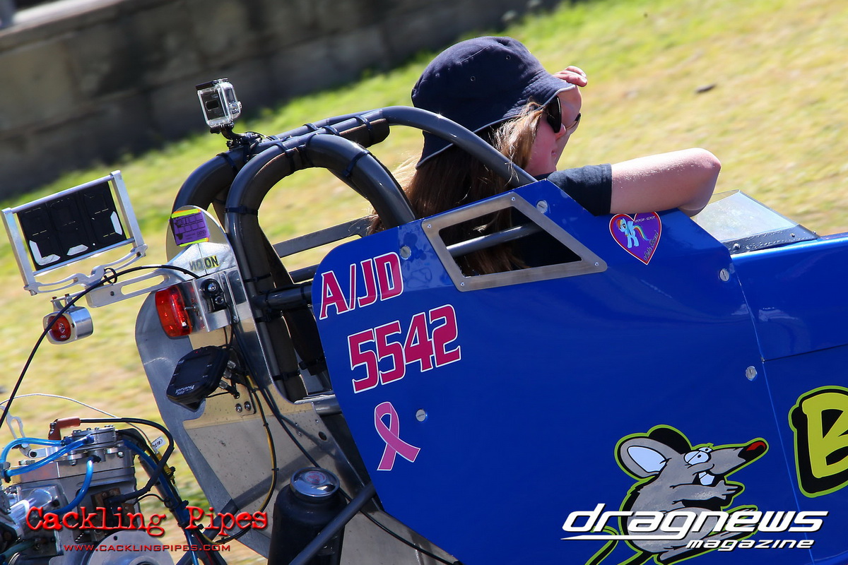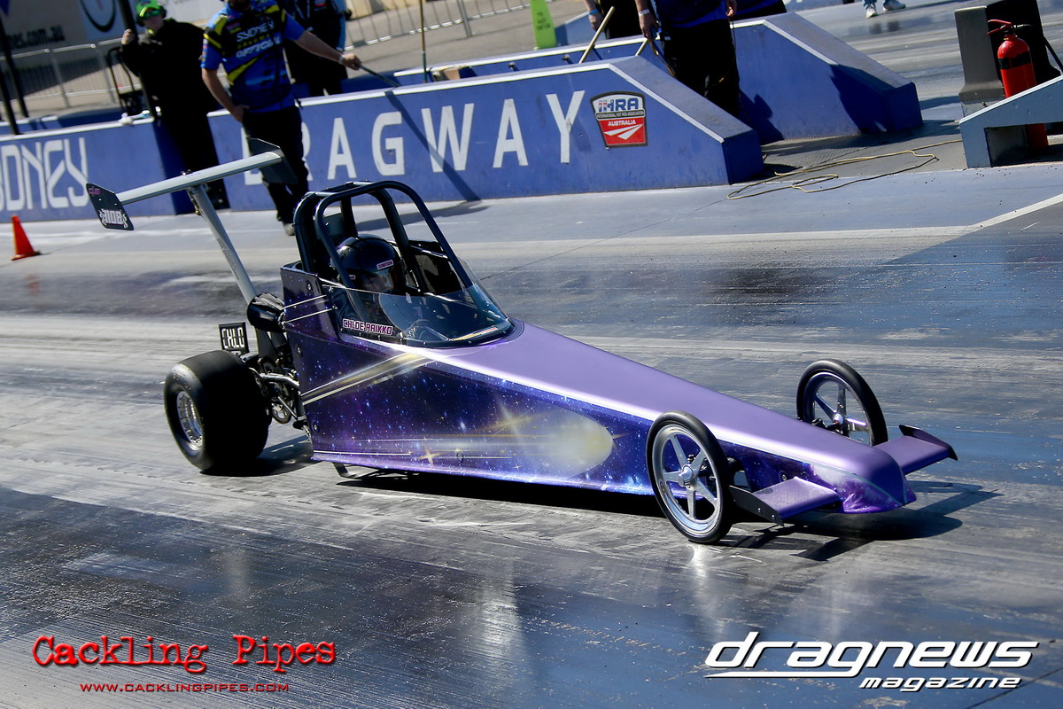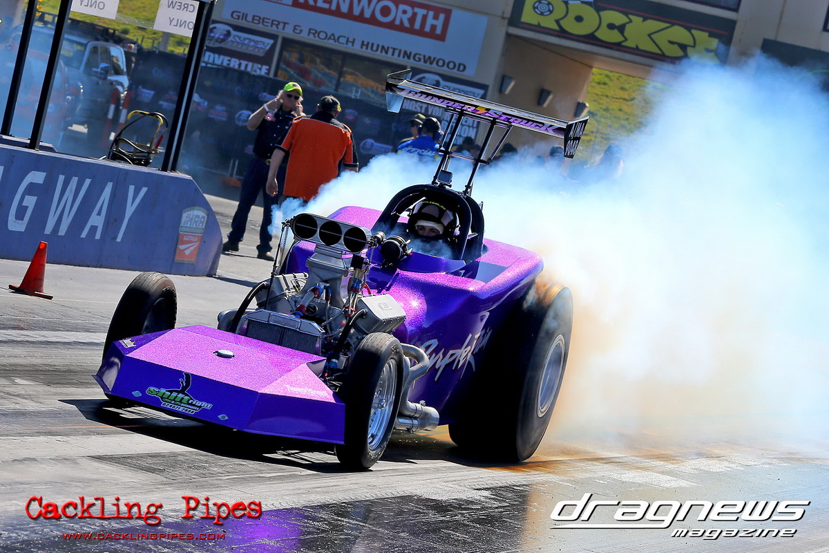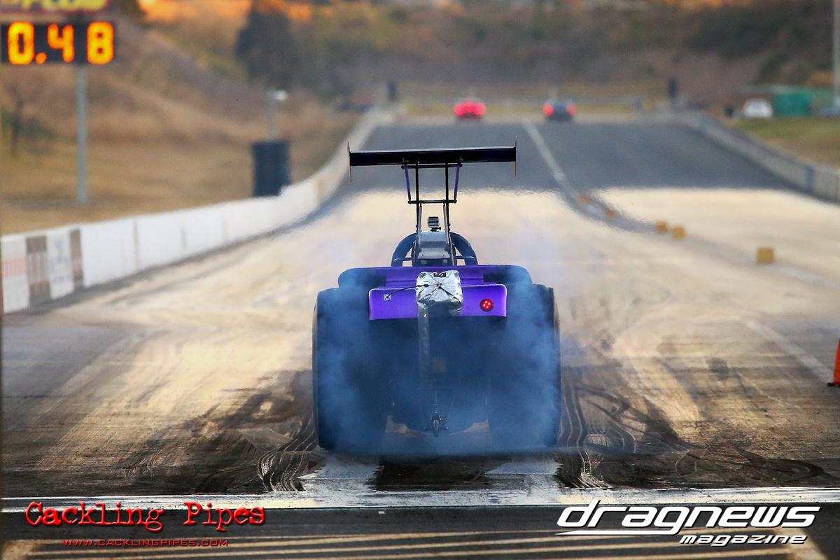 It was a case of better to be lucky than good in Modified with Cheyne Williams taking his first ever win in the class. Williams won every race on behalf of his opponent red lighting – Chris Manks -.016, Brendon Luke -.002 and Peter Ilsley -.023. In the final he faced Allison Stewart in the Boss Bullet dragster, Stewart had top qualified with a perfect reaction but let the button go a perilous 3 thou too quick and Williams in the sweet looking Purple Rain altered would take the event win.
