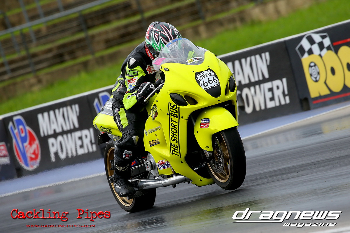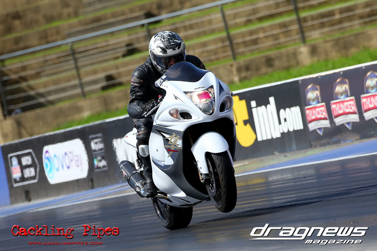 The heads-up Extreme Bike class competes with the All-Run format. The final featured Brad Mannix and Pro Slammer racer Geoff Gradden who moonlights in the two-wheel classes with his Hayabusa. Mannix had the jump at the letting go of the clutches and increased the win margin at the line with an 8.84 to a 8.94.