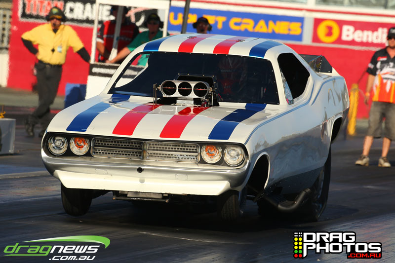 Les Rodgie’s “Teacher’s Pet” QDRC Outlaw Funny Car was certainly sporting a radical new look with a Dodge Challenger body now flopped over the chassis. In a small QDRC Outlaw field Rodgie earned a final shot against the ever consistent Josh Fletcher.