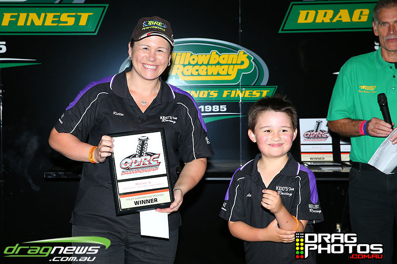 Kellie Kidd asserted herself as the one to beat going into the last round of the QDRC as she defeated Andrew Sargent in the Modified final. Kidd overcame a .009 light dropped on her from Sargent to run a 7.489 on a 7.48 to take the all dragster final over Sargent’s 7.903 on a 7.86.