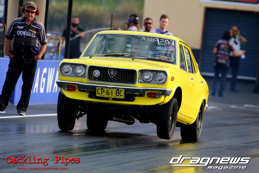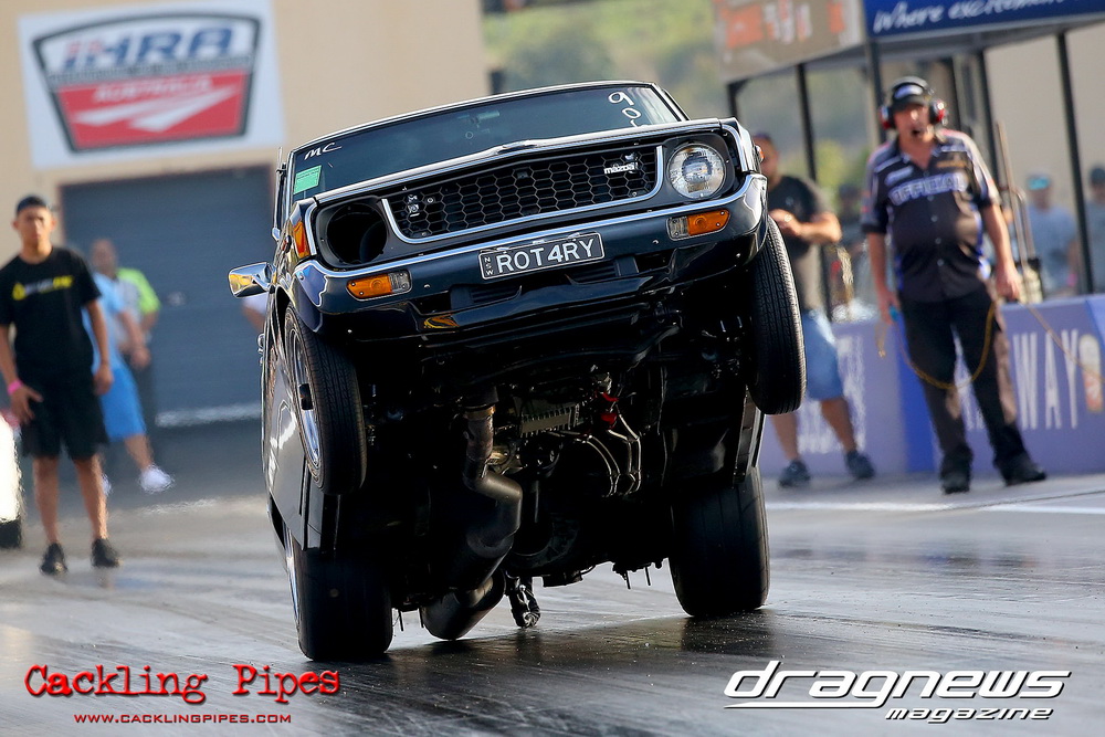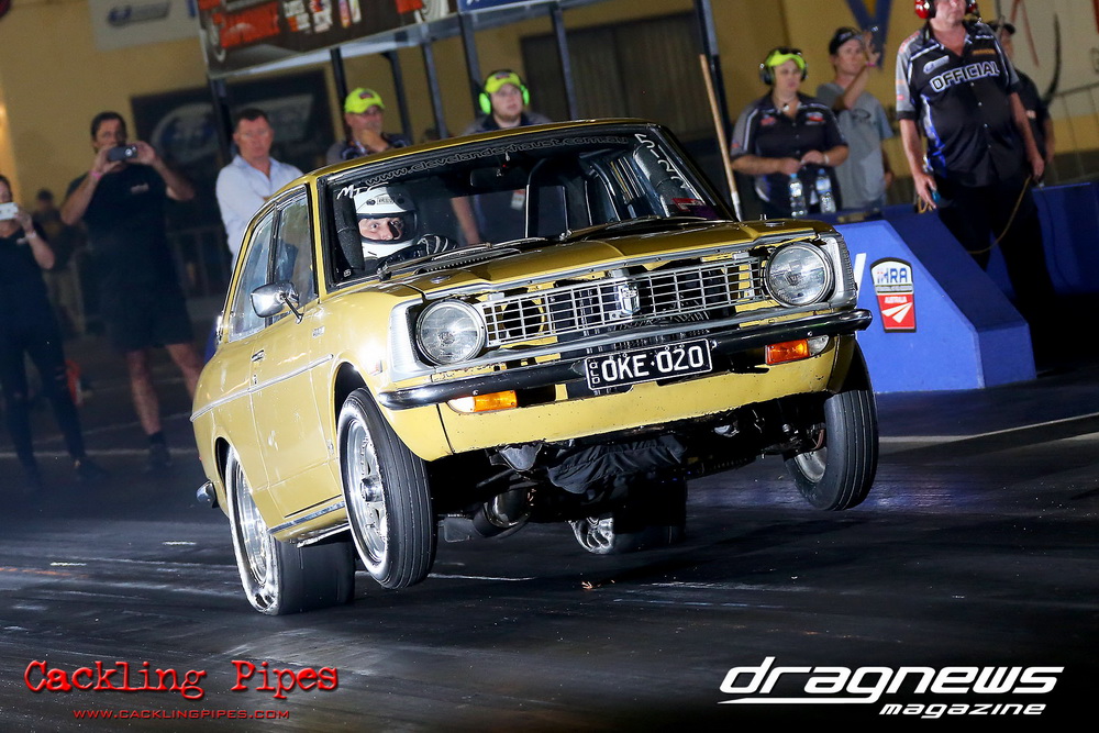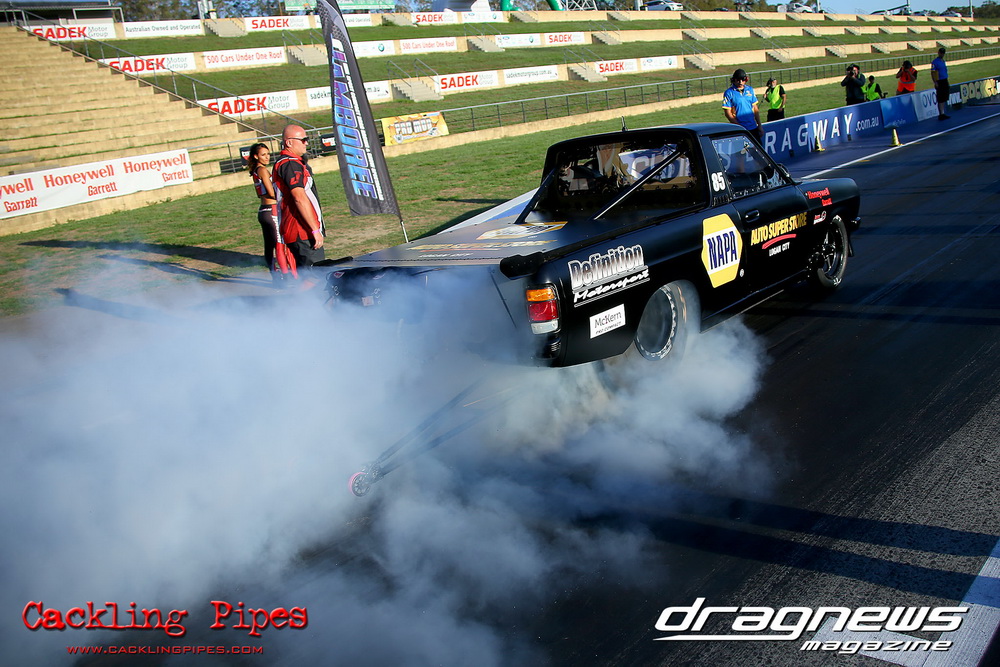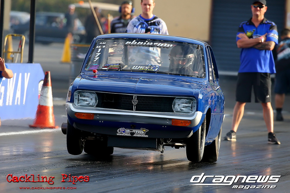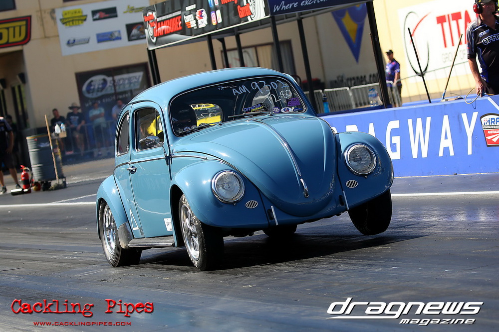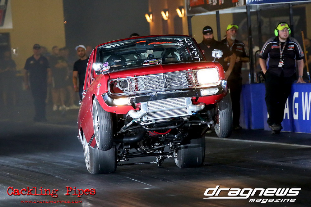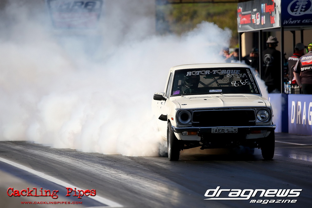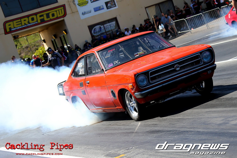 Freight Management Australia All Motor had a 13-car DYO field, with the wild 13BPP powered Datsun 1200 of Mark Costanzo reeling off a 9.70 to grab top spot from Matt Rice in the similarly-powered “Chainsaw” R100 with a 9.86. It was then daylight to third spot with Jason Frost’s 2276cc ’61 Beetle running 11.29, Jason Stoodley’s Barra-powered Cortina in 4th with 11.66 and Henry Spicak’s 2332cc ’56 Beetle running 12.20 for 5th. Costanzo soloed in round one with a 9.75 on a 9.70 dial, whilst Stoodley overcame Matt Berry’s 2007cc ’59 Beetle with a closer 11.77 on his 11.72 dial. Costanzo then faced Spicak in round two,where he waited 2.25 seconds before chasing him down with a tight 9.71 on a 9.70. Stoodley out-reacted former finalist Tim James in his Falcon panel van and used an 11.75 on his 11.65 dial to defeat James’ closer 12.31 on his 12.28 dial. Costanzo then had a longer 3.15 second wait against Brendon Burnett’s 2332cc ’62 beetle, but a red light ended the chase early, with Costanzo’s impressive 9.658 on his 9.65 dial-in leaving no doubt. Stoodley then dispatched the lone Honda of Jessica Simmons with an 11.78 on his 11.63 taking out the 2200cc Civic’s closer 12.28 on a 12.20 dial by virtue of his .072 to .336 light. With his smallest chase of the day in the final, Costanzo had nearly a two second wait against Stoodley’s 11.63 dial-in. And with the Cortina ripping off a great .017 light, he knew a red light would not be ideal. His safe, but slower .261 light made his job hard, and Stoodley made it harder by keeping close to his dial in with an 11.67. Costanzo’s chase was exciting as the screaming rotor banged though the clutchelsss 5-speed, coming up short by a wafer thin margin, running a close 9.68 on his 9.65 dial.