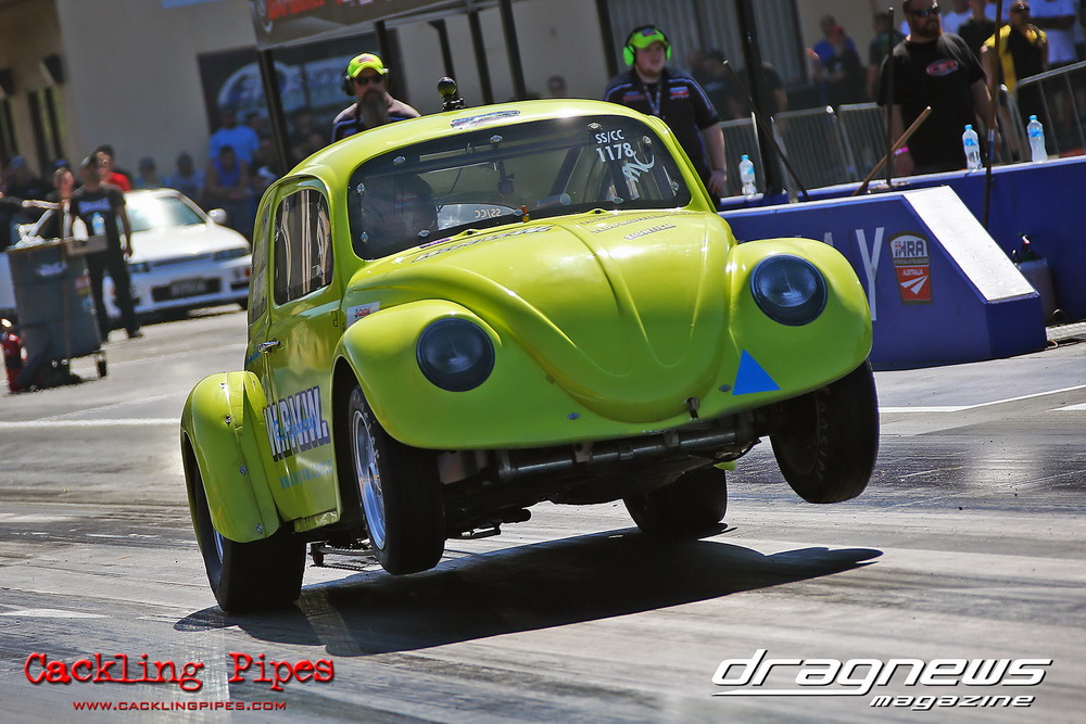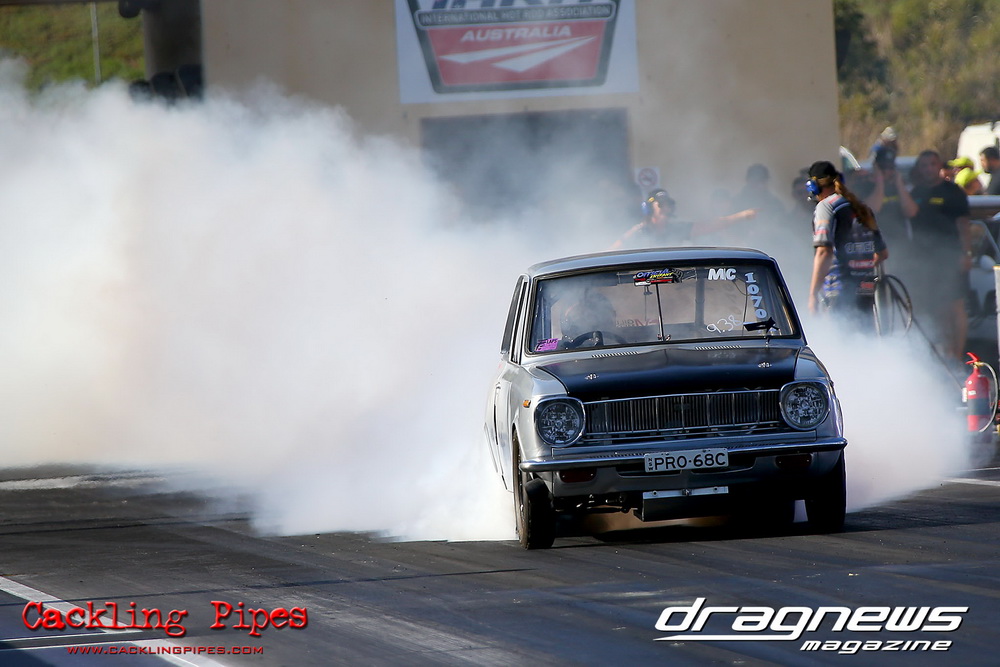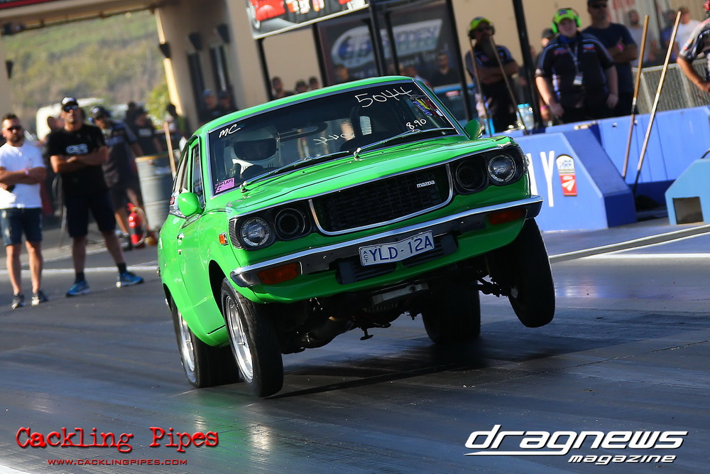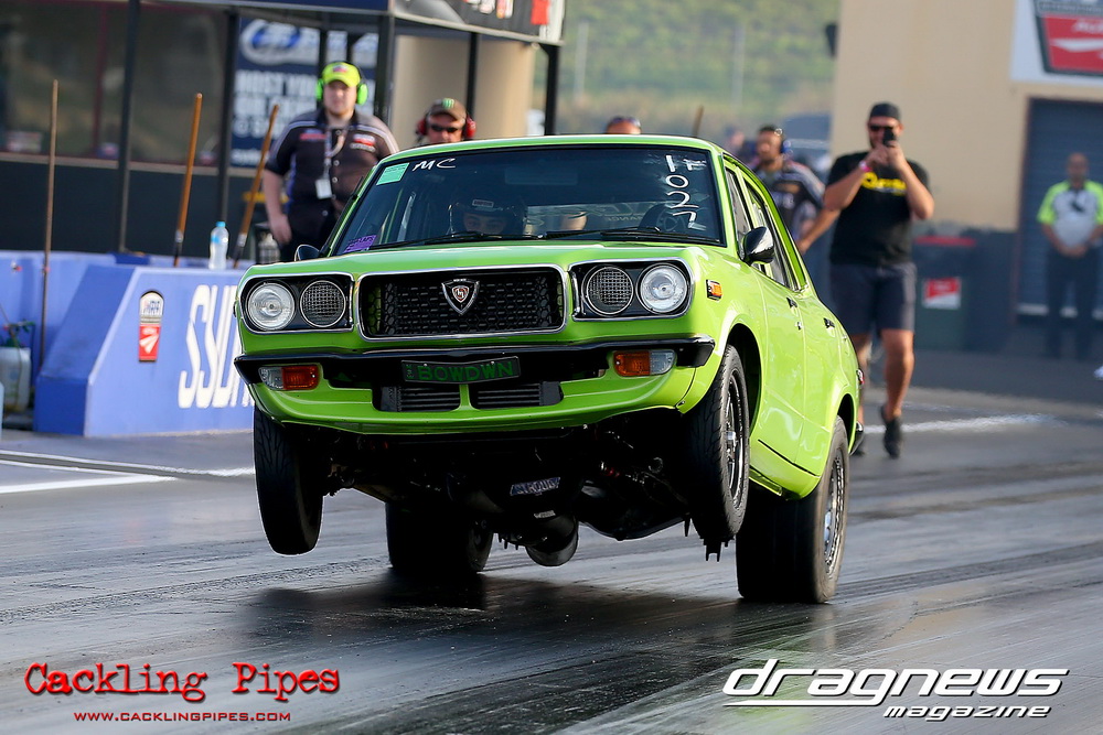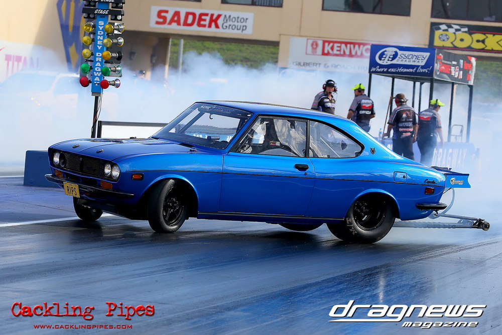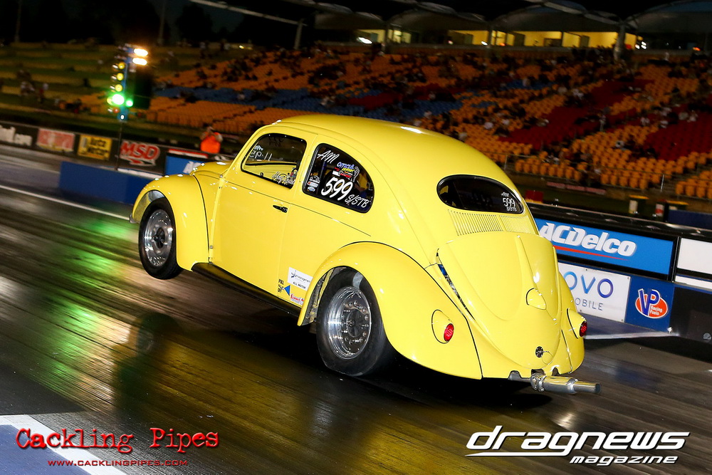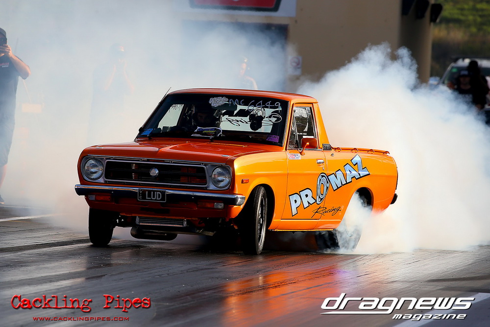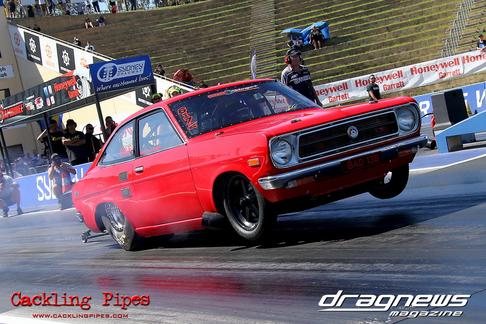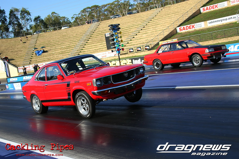 Freight Management Australia All Motor had a 13-car DYO field, with the wild 13BPP powered Datsun 1200 of Mark Costanzo reeling off a 9.70 to grab top spot from Matt Rice in the similarly-powered “Chainsaw” R100 with a 9.86. It was then daylight to third spot with Jason Frost’s 2276cc ’61 Beetle running 11.29, Jason Stoodley’s Barra-powered Cortina in 4th with 11.66 and Henry Spicak’s 2332cc ’56 Beetle running 12.20 for 5th. Costanzo soloed in round one with a 9.75 on a 9.70 dial, whilst Stoodley overcame Matt Berry’s 2007cc ’59 Beetle with a closer 11.77 on his 11.72 dial. Costanzo then faced Spicak in round two,where he waited 2.25 seconds before chasing him down with a tight 9.71 on a 9.70. Stoodley out-reacted former finalist Tim James in his Falcon panel van and used an 11.75 on his 11.65 dial to defeat James’ closer 12.31 on his 12.28 dial. Costanzo then had a longer 3.15 second wait against Brendon Burnett’s 2332cc ’62 beetle, but a red light ended the chase early, with Costanzo’s impressive 9.658 on his 9.65 dial-in leaving no doubt. Stoodley then dispatched the lone Honda of Jessica Simmons with an 11.78 on his 11.63 taking out the 2200cc Civic’s closer 12.28 on a 12.20 dial by virtue of his .072 to .336 light. With his smallest chase of the day in the final, Costanzo had nearly a two second wait against Stoodley’s 11.63 dial-in. And with the Cortina ripping off a great .017 light, he knew a red light would not be ideal. His safe, but slower .261 light made his job hard, and Stoodley made it harder by keeping close to his dial in with an 11.67. Costanzo’s chase was exciting as the screaming rotor banged though the clutchelsss 5-speed, coming up short by a wafer thin margin, running a close 9.68 on his 9.65 dial.