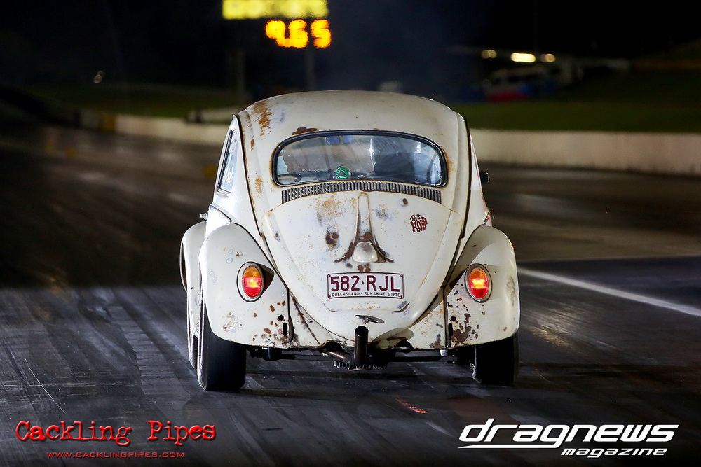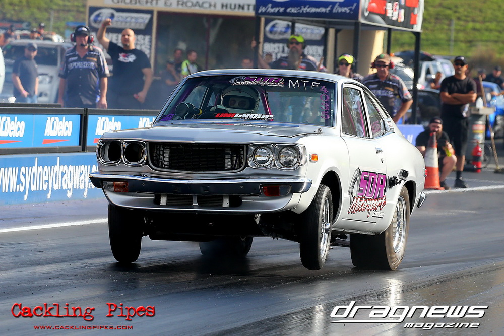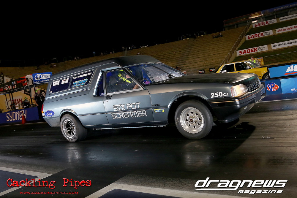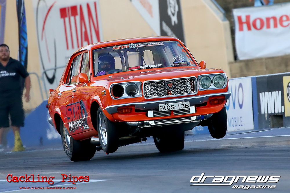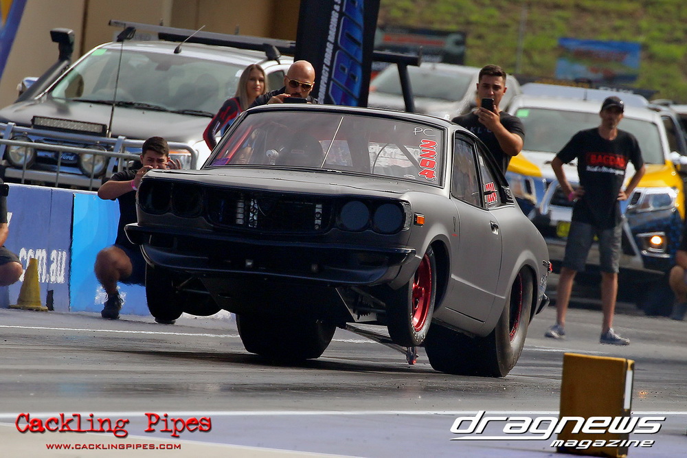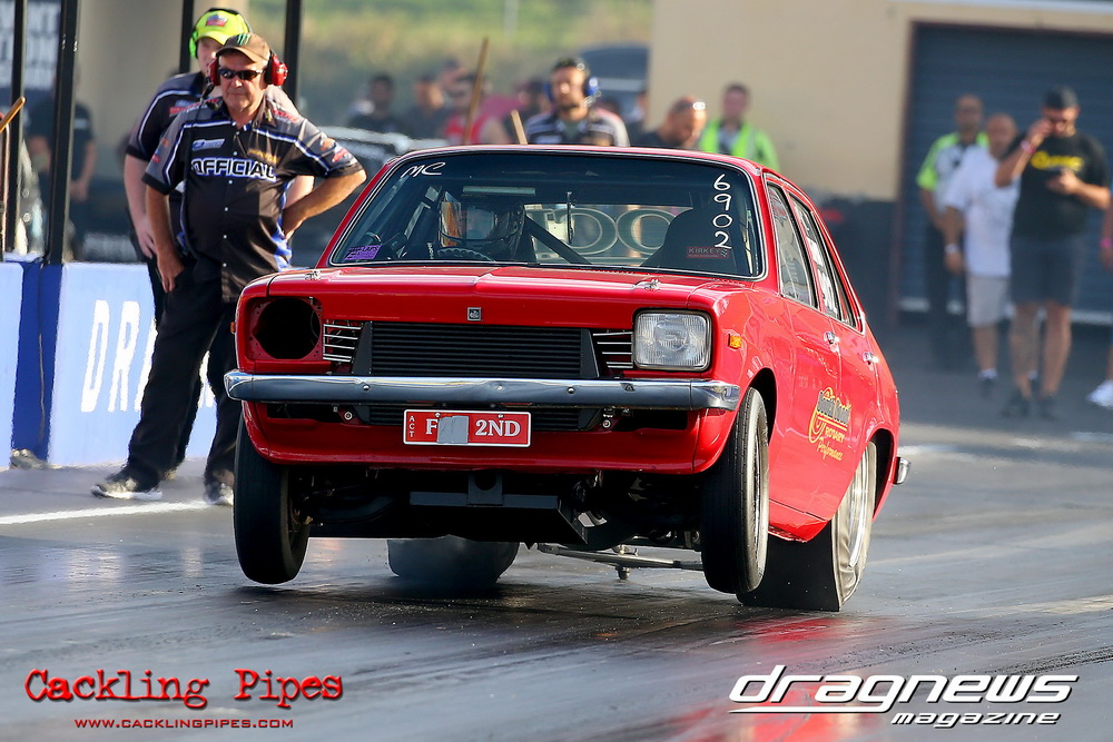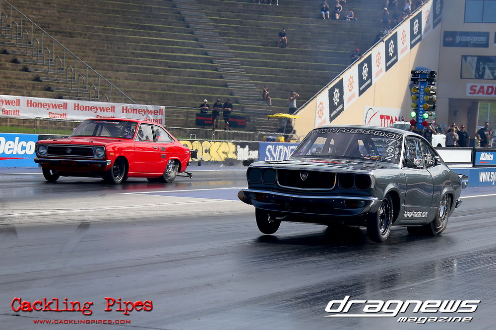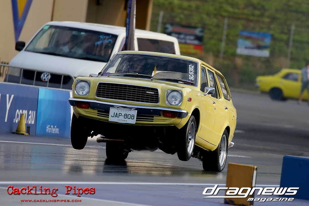 Freight Management Australia All Motor had a 13-car DYO field, with the wild 13BPP powered Datsun 1200 of Mark Costanzo reeling off a 9.70 to grab top spot from Matt Rice in the similarly-powered “Chainsaw” R100 with a 9.86. It was then daylight to third spot with Jason Frost’s 2276cc ’61 Beetle running 11.29, Jason Stoodley’s Barra-powered Cortina in 4th with 11.66 and Henry Spicak’s 2332cc ’56 Beetle running 12.20 for 5th. Costanzo soloed in round one with a 9.75 on a 9.70 dial, whilst Stoodley overcame Matt Berry’s 2007cc ’59 Beetle with a closer 11.77 on his 11.72 dial. Costanzo then faced Spicak in round two,where he waited 2.25 seconds before chasing him down with a tight 9.71 on a 9.70. Stoodley out-reacted former finalist Tim James in his Falcon panel van and used an 11.75 on his 11.65 dial to defeat James’ closer 12.31 on his 12.28 dial. Costanzo then had a longer 3.15 second wait against Brendon Burnett’s 2332cc ’62 beetle, but a red light ended the chase early, with Costanzo’s impressive 9.658 on his 9.65 dial-in leaving no doubt. Stoodley then dispatched the lone Honda of Jessica Simmons with an 11.78 on his 11.63 taking out the 2200cc Civic’s closer 12.28 on a 12.20 dial by virtue of his .072 to .336 light. With his smallest chase of the day in the final, Costanzo had nearly a two second wait against Stoodley’s 11.63 dial-in. And with the Cortina ripping off a great .017 light, he knew a red light would not be ideal. His safe, but slower .261 light made his job hard, and Stoodley made it harder by keeping close to his dial in with an 11.67. Costanzo’s chase was exciting as the screaming rotor banged though the clutchelsss 5-speed, coming up short by a wafer thin margin, running a close 9.68 on his 9.65 dial.