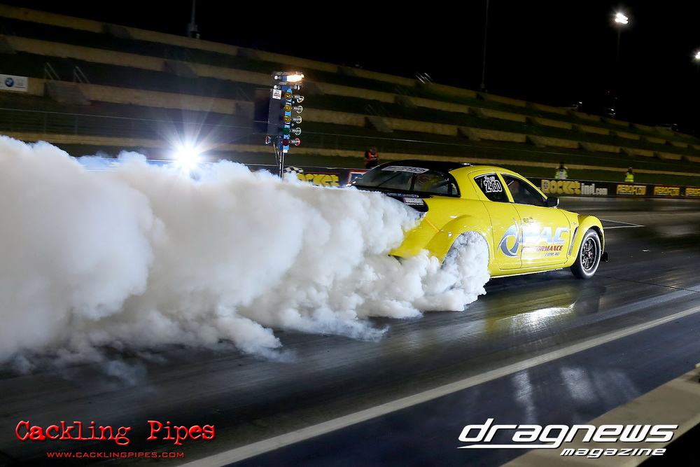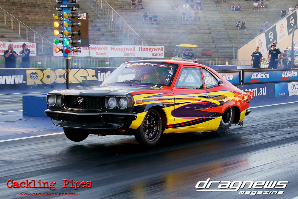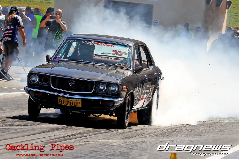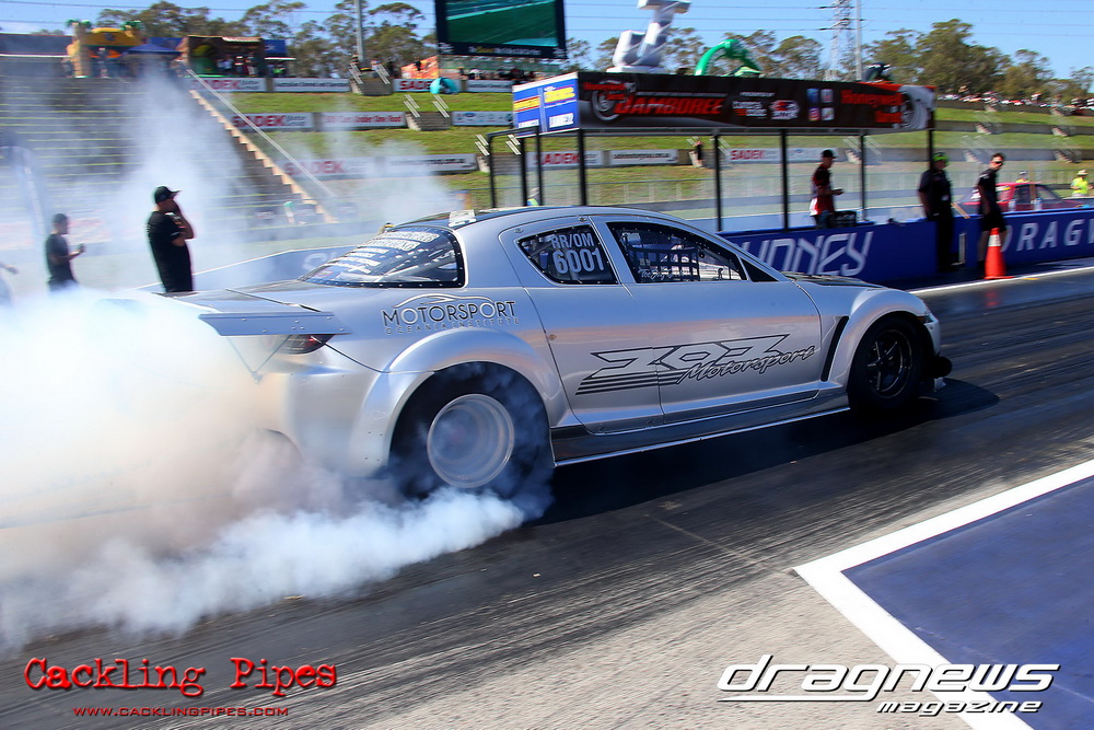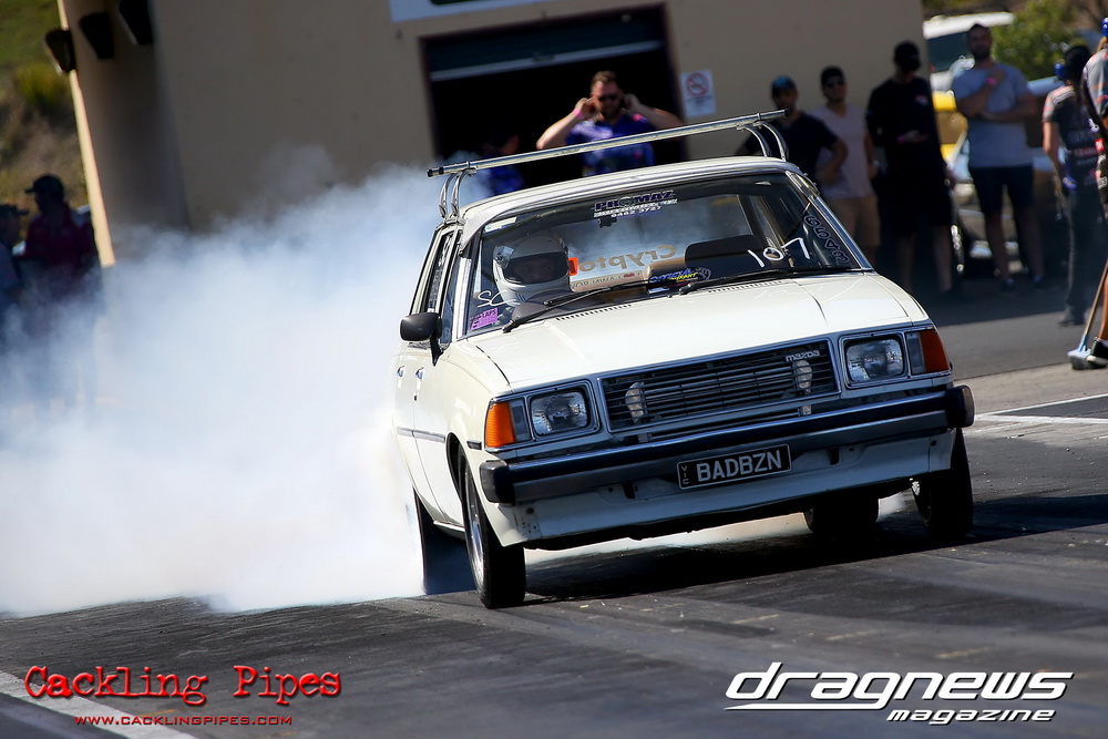Pro Maz Street 289 has seen bigger numbers, but the 10-car field still brought the excitement that 289 brings to Jamboree. Seven 13Bs, an FJ20, RB30 and 20B made the field, with the 13B powered cars of Mohamed Salame 8.38/164mph on the pole, Grant Henderson 2nd (8.53) and Tee-Jay Graham 3rd (8.66). Round one of DYO saw 8 cars front, with the 13B RX7s of Salame and Rodney Spannenberg each receive solos, and Henderson improving with a 8.33 with his win over Sam Constantinou’s 1200. Kevin Aouad’s 20B RX8 took out Sandy Di Pietro’s FJ20 Datsun 1200 Ute with a pedalling 8.85 and Graham’s 13B RX8 took Alex Cirtoski’s VL with a 8.53. Henderson soloed with an improving 7.70 in round two, Spannenberg used a 9.42 on a 9.40 dial-in to handle a red-lighting Graham and Salame ran an 8.27 on an 8.20 dial to defeat Aouad’s breaking out 7.58. Salame changed his dial-in from an 8.20 to an 8.05 against Henderson, but ran an 8.20 to barely cover Henderson’s 7.76. Spannenberg soloed with a 9.35 breakout on his 9.39 dial, and then adjusted his handicap time to a 9.34 for the final, whilst Salame dropped his back to 8.20. Spannenberg’s .024 light and breaking out 9.28 still covered Salame, who wished he kept his previous 8.05 dial-in, also breaking out with an 8.06.