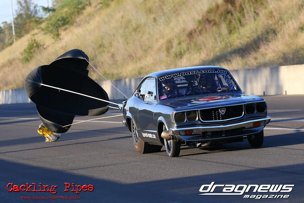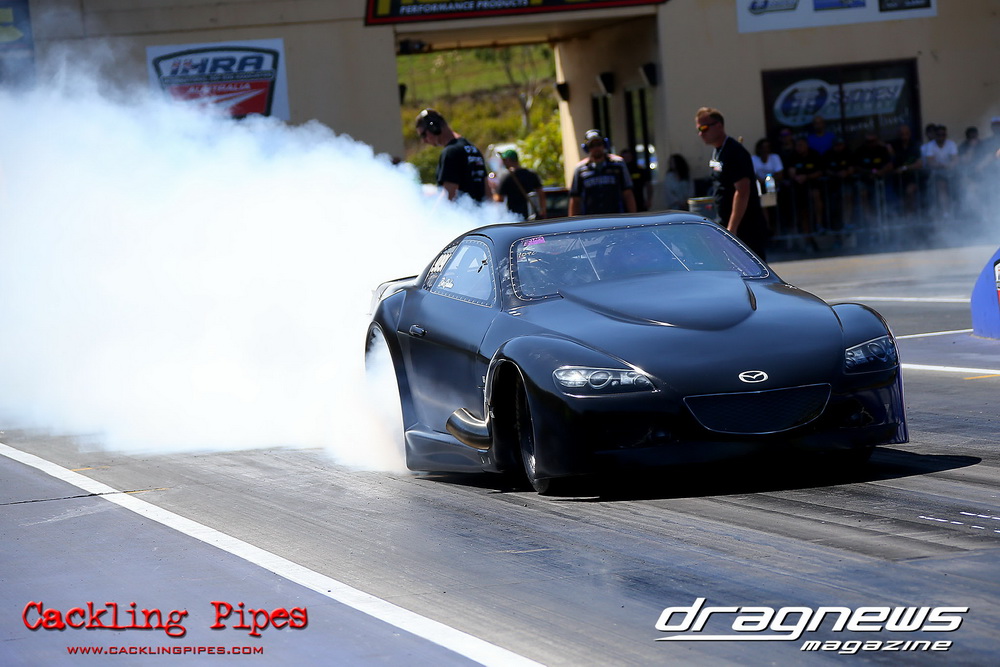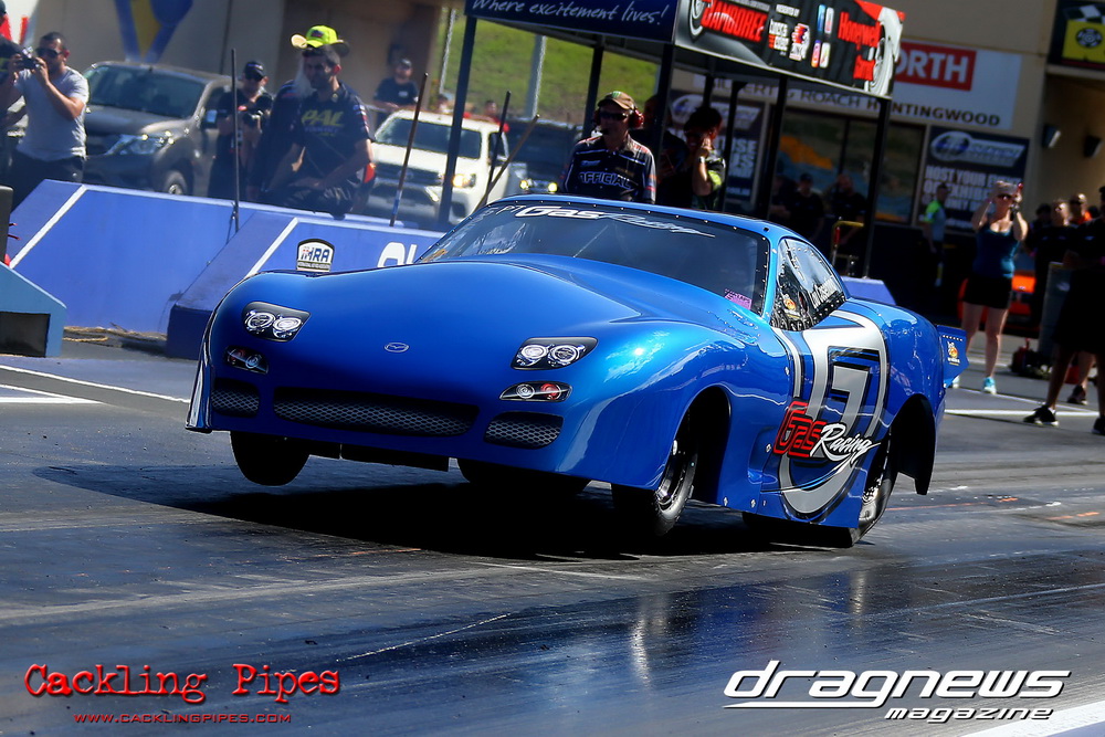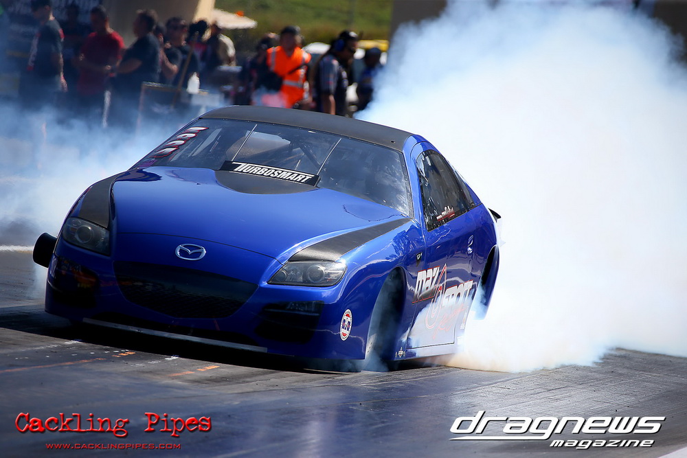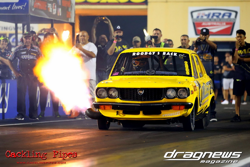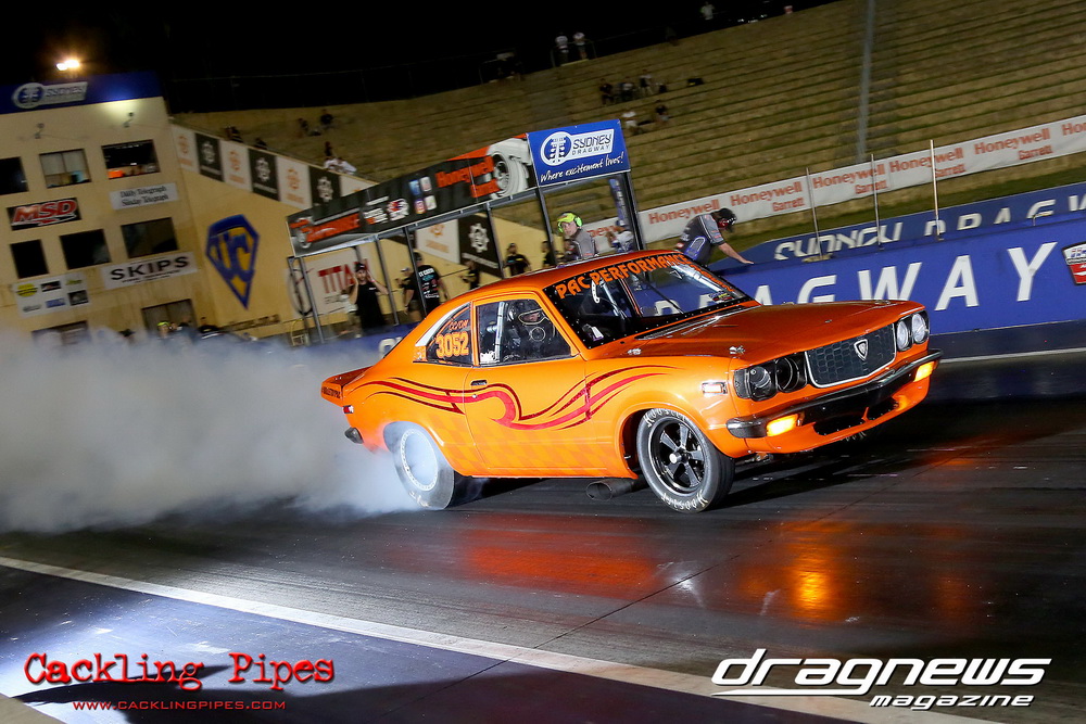 Pro Maz Street 289 has seen bigger numbers, but the 10-car field still brought the excitement that 289 brings to Jamboree. Seven 13Bs, an FJ20, RB30 and 20B made the field, with the 13B powered cars of Mohamed Salame 8.38/164mph on the pole, Grant Henderson 2nd (8.53) and Tee-Jay Graham 3rd (8.66). Round one of DYO saw 8 cars front, with the 13B RX7s of Salame and Rodney Spannenberg each receive solos, and Henderson improving with a 8.33 with his win over Sam Constantinou’s 1200. Kevin Aouad’s 20B RX8 took out Sandy Di Pietro’s FJ20 Datsun 1200 Ute with a pedalling 8.85 and Graham’s 13B RX8 took Alex Cirtoski’s VL with a 8.53. Henderson soloed with an improving 7.70 in round two, Spannenberg used a 9.42 on a 9.40 dial-in to handle a red-lighting Graham and Salame ran an 8.27 on an 8.20 dial to defeat Aouad’s breaking out 7.58. Salame changed his dial-in from an 8.20 to an 8.05 against Henderson, but ran an 8.20 to barely cover Henderson’s 7.76. Spannenberg soloed with a 9.35 breakout on his 9.39 dial, and then adjusted his handicap time to a 9.34 for the final, whilst Salame dropped his back to 8.20. Spannenberg’s .024 light and breaking out 9.28 still covered Salame, who wished he kept his previous 8.05 dial-in, also breaking out with an 8.06.