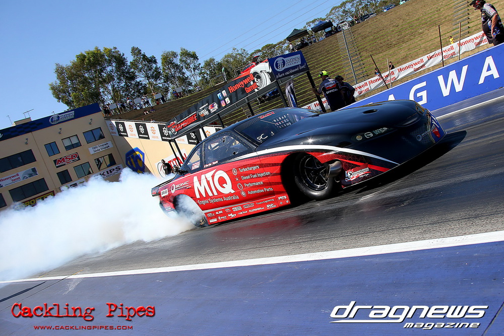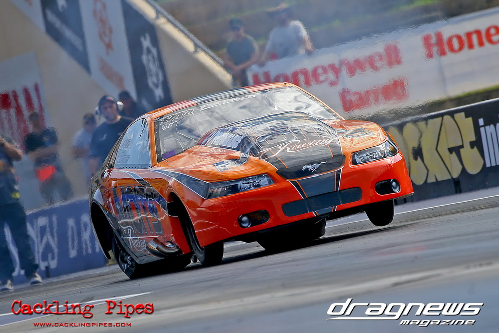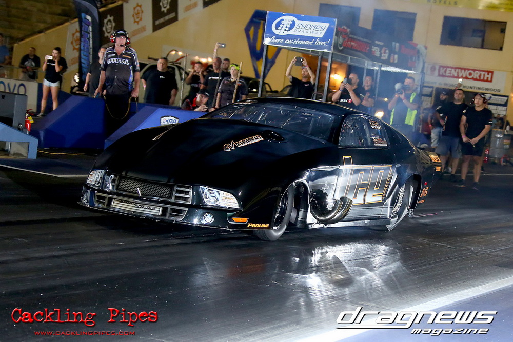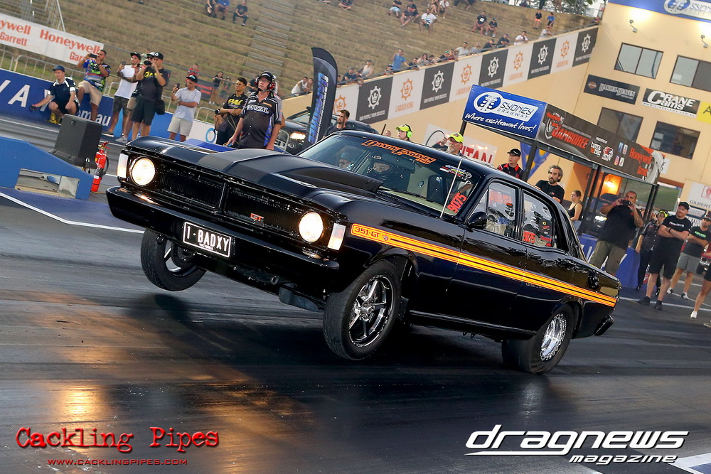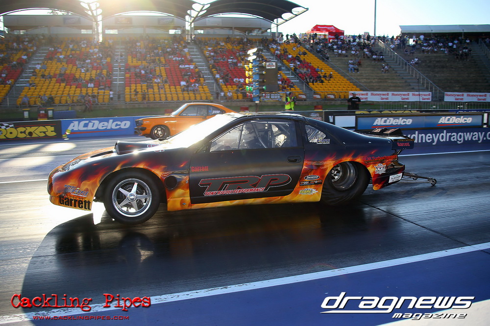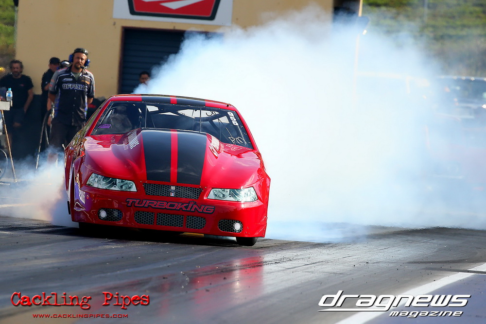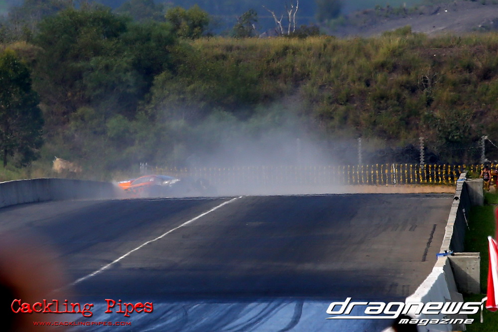 Honeywell Garret Pro Mod had wall-to wall turbo V8 doorslammers in the 9-car field – with the blower boys too scared to show up. Greg “Mauler” Tsakaridis put his new Mustang on the top rung of the ladder with a great 5.91/255mph .Jeremy Martin put the worlds fastest VB commodore in second with a 6.00/246 and Paul Mouhayet drove his old Mustang (now owned by Gerry Sarafoglou) to a 6.00/247mph,before encountering enough damage to put the car out when only one parachute deployed, sending the iconic car into the gravel and the wall.