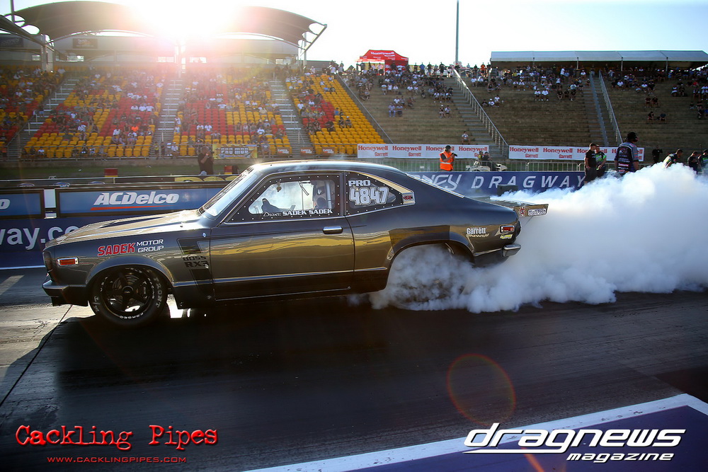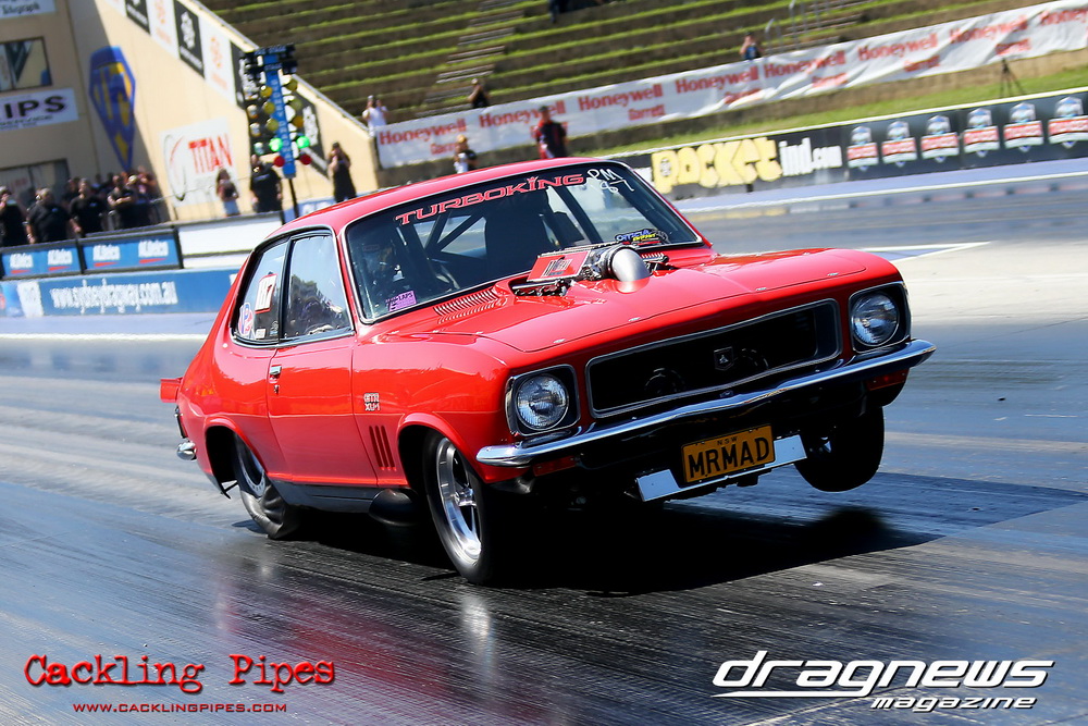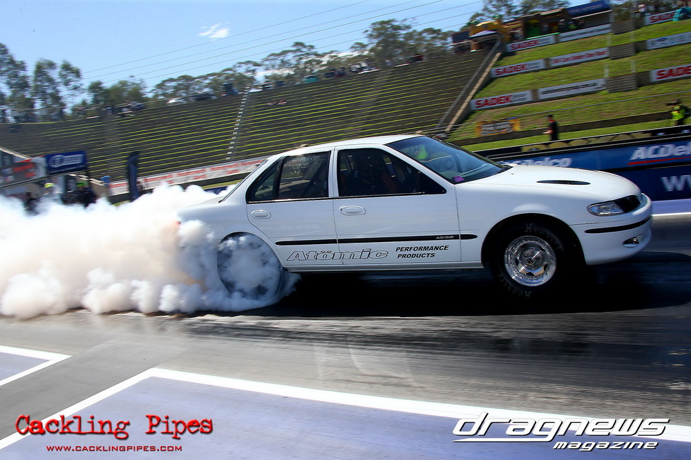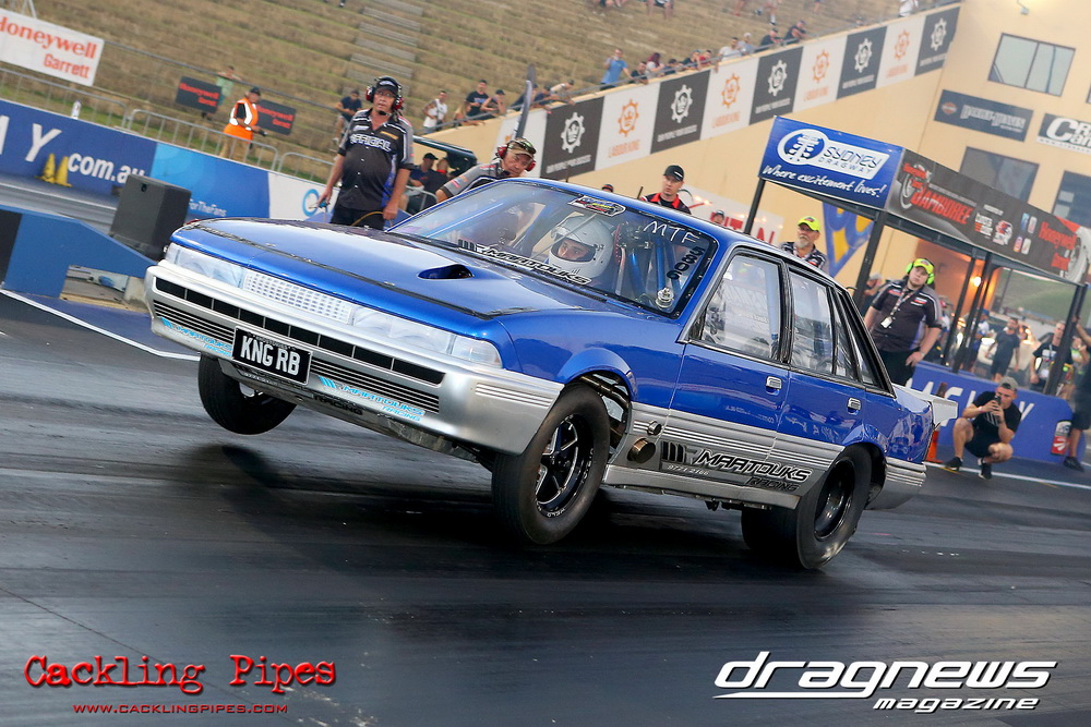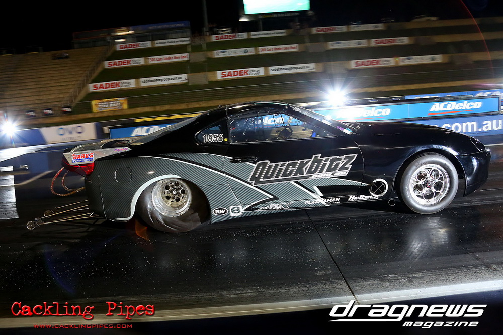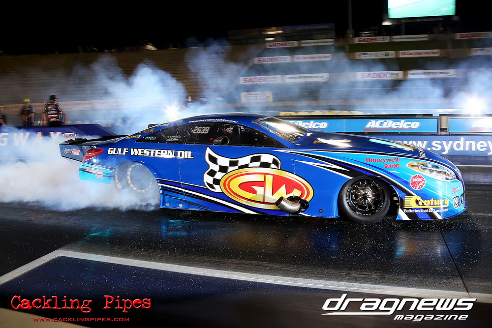 Honeywell Garret Pro Mod had wall-to wall turbo V8 doorslammers in the 9-car field – with the blower boys too scared to show up. Greg “Mauler” Tsakaridis put his new Mustang on the top rung of the ladder with a great 5.91/255mph .Jeremy Martin put the worlds fastest VB commodore in second with a 6.00/246 and Paul Mouhayet drove his old Mustang (now owned by Gerry Sarafoglou) to a 6.00/247mph,before encountering enough damage to put the car out when only one parachute deployed, sending the iconic car into the gravel and the wall.
