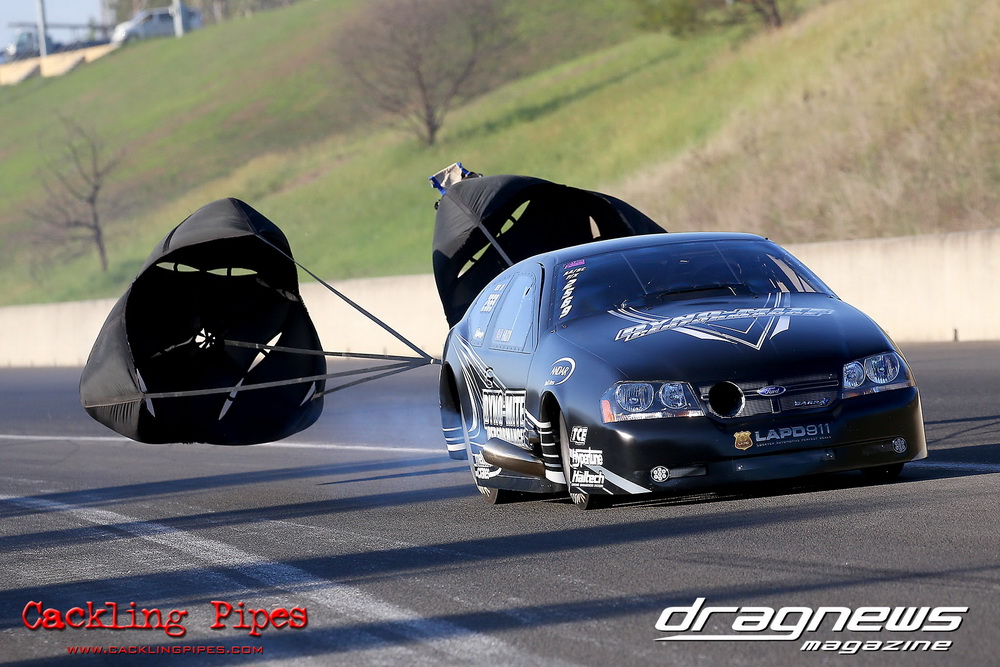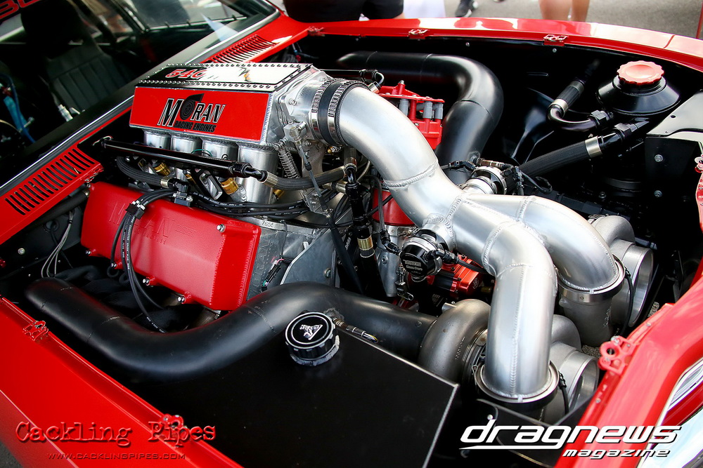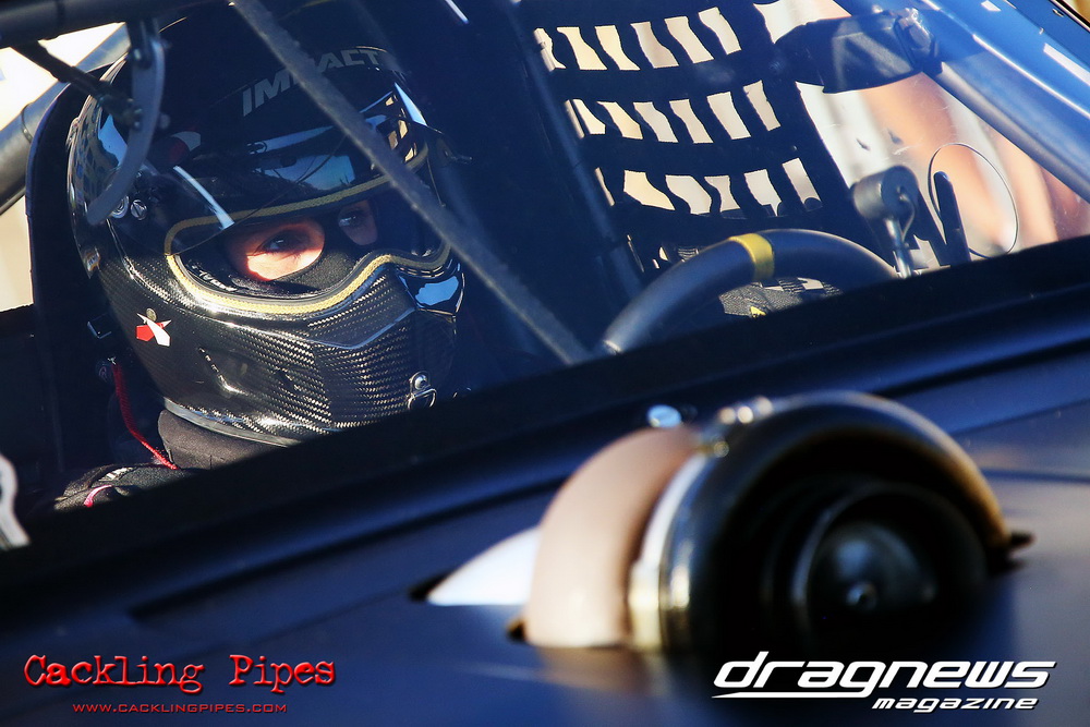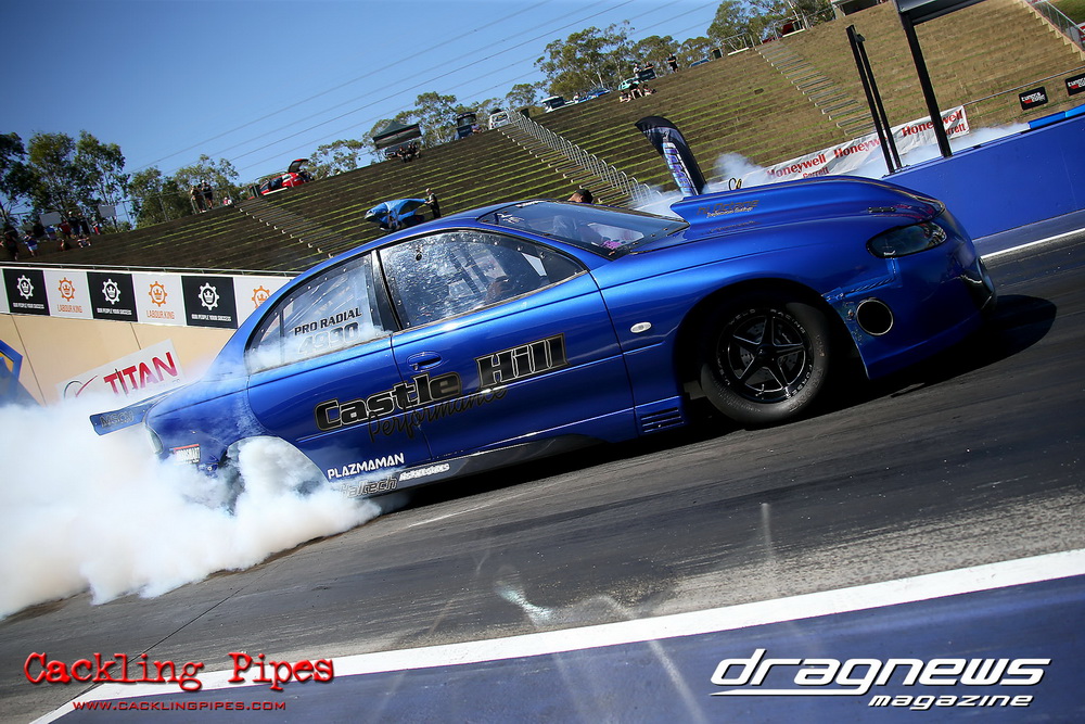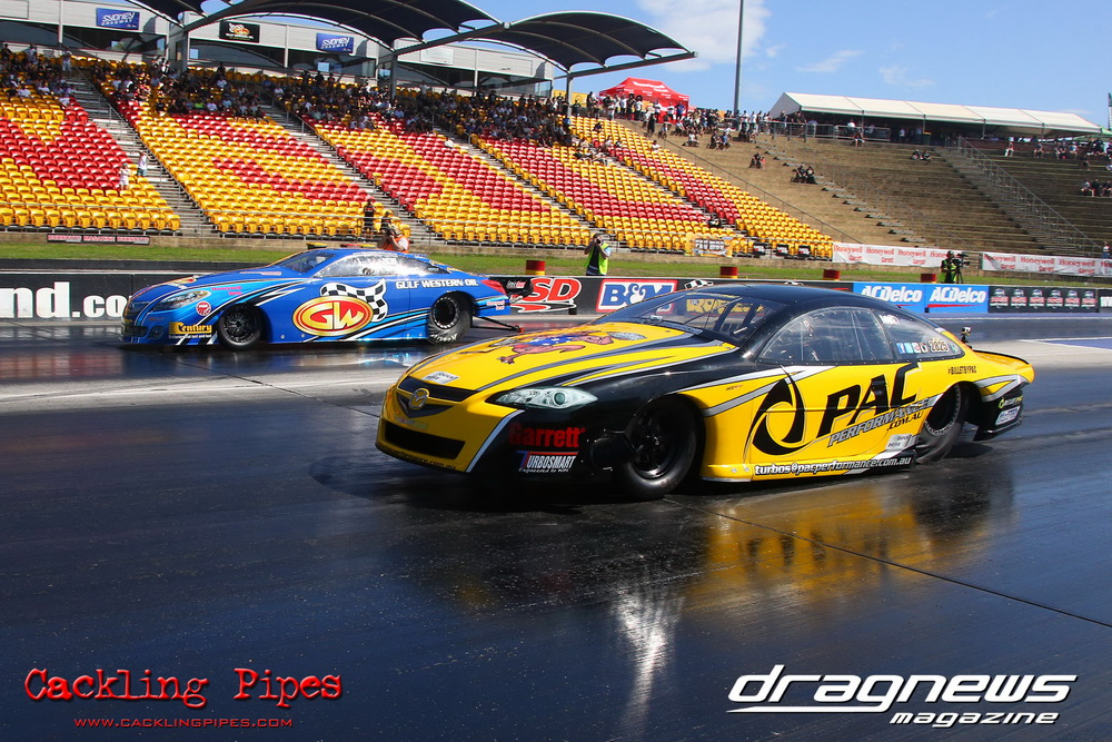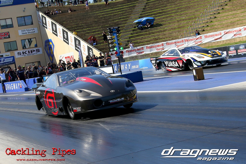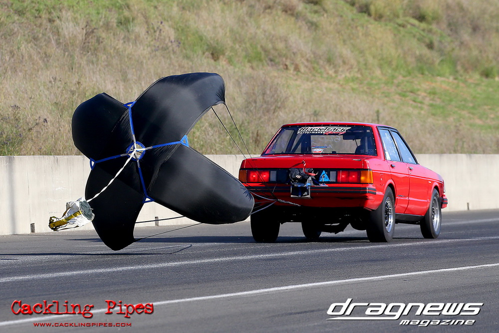 Honeywell Garret Pro Mod had wall-to wall turbo V8 doorslammers in the 9-car field – with the blower boys too scared to show up. Greg “Mauler” Tsakaridis put his new Mustang on the top rung of the ladder with a great 5.91/255mph .Jeremy Martin put the worlds fastest VB commodore in second with a 6.00/246 and Paul Mouhayet drove his old Mustang (now owned by Gerry Sarafoglou) to a 6.00/247mph,before encountering enough damage to put the car out when only one parachute deployed, sending the iconic car into the gravel and the wall.