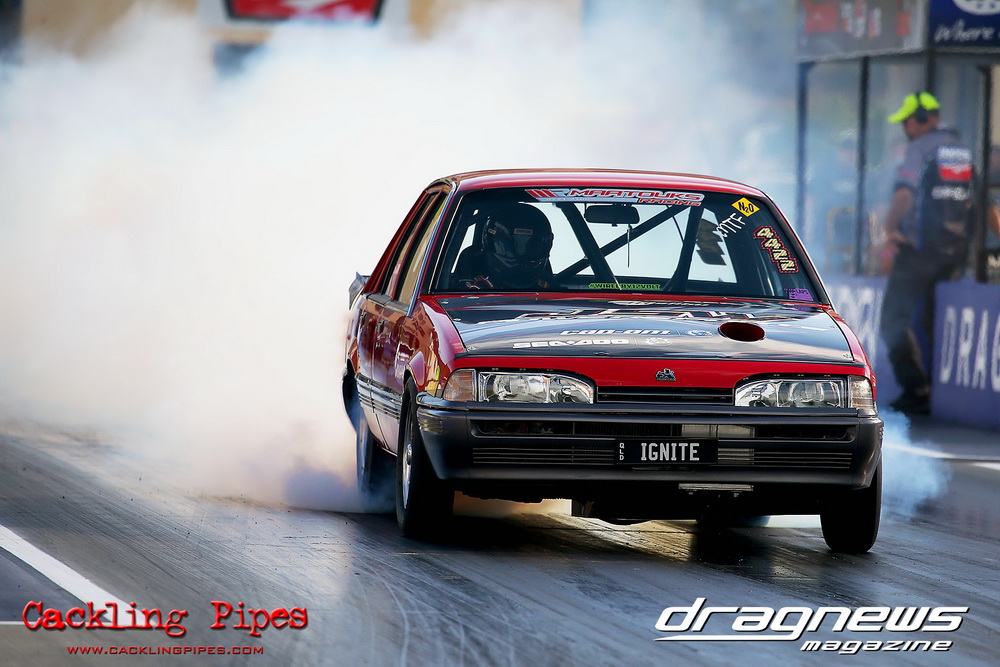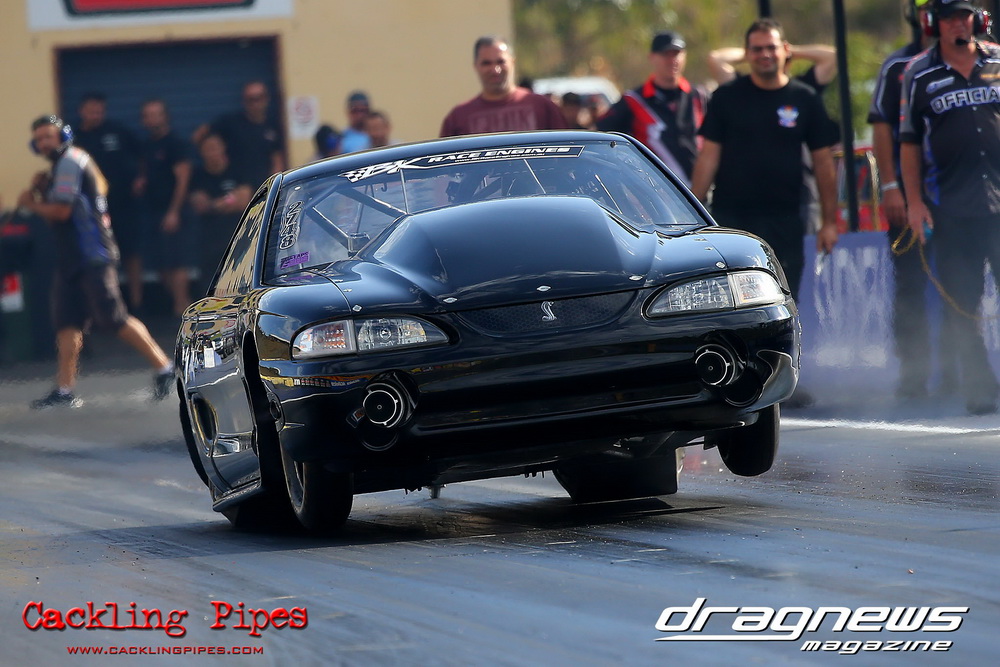 Ivan “Mr Mad” Tesic ran a PB in his Torana with a 6.55/230 for fourth, whilst PJ Todarello’s small block Mustang nailed a 6.65 for fifth. During eliminations Martin finally scored his first five with a 5.98,and Michael Haimandos’ small-block Mustang did enough to meet Todarello in the final. Todarello nailed Haimandos to the tree in the final, and despite a pedal, held out the black mustang with a 7.13/204mph to 6.99/209mph.